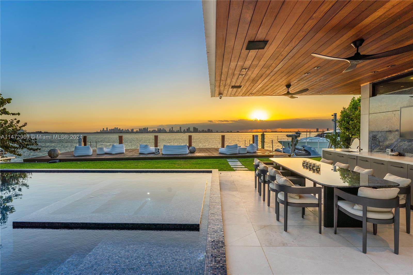Extravagant modern mansion on prestigious North Bay Road where explosive sunsets over Miami's splendid skyline are a backdrop from everywhere! Experience the finest waterfront living from this 15,547-SF property featuring 75 feet of premier waterfrontage with oversized dock & panoramic views! Inside the 7-bed 7bath+2, smart home, open floor-plan living areas have wall-to-wall glass doors that completely open, creating sensational indoor-outdoor entertaining ambience. The gated property is abundant with luxe amenities: wet bar, state-of-the-art theater, elevator, Savant control system, gourmet kitchen, wine cellar, interior fishpond with stingrays, gym, rooftop, cabana, tiled saltwater pool with spa. Built in 2022, this spectacular mansion is equipped with a + 4-car garage & generator!