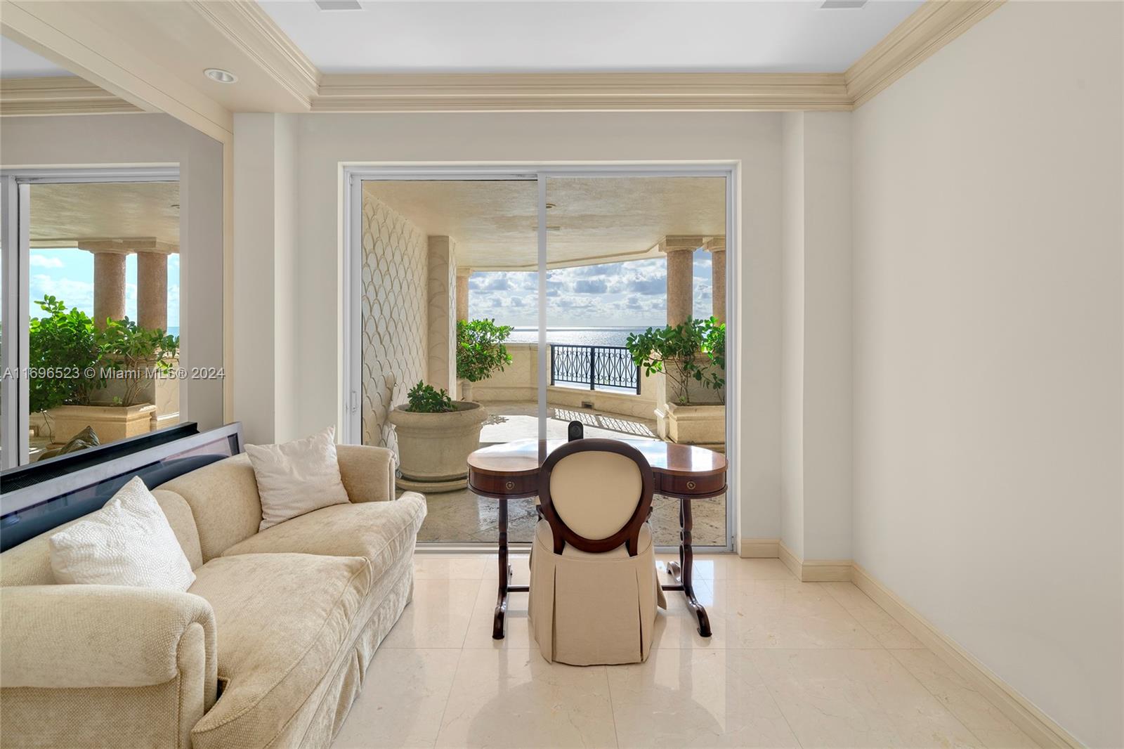 Enjoy beautiful sunrises from this Oceanside corner unit perfectly located in one of the quietest spots on the island boasting direct unobstructed views of the Atlantic Ocean, beach, & Government Cut. 4BR/5BA, and 3,849 SF it features marble floors throughout, an expansive wraparound terrace over the beach where you can enjoy the amazing views and hear the waves. The entry foyer leads to sweeping ocean views, and the spacious living room & dining area offer direct terrace access. A large kitchen sports granite countertops, a center island, Gaggenau & Sub-Zero appliances. The spacious principal suite with terrace access & dual spa bathroom with a sunken tub. 3 additional bedrooms w/ensuite baths, & 2 of the bedrooms share a private side terrace with ocean views. 5-star Fisher amenities.