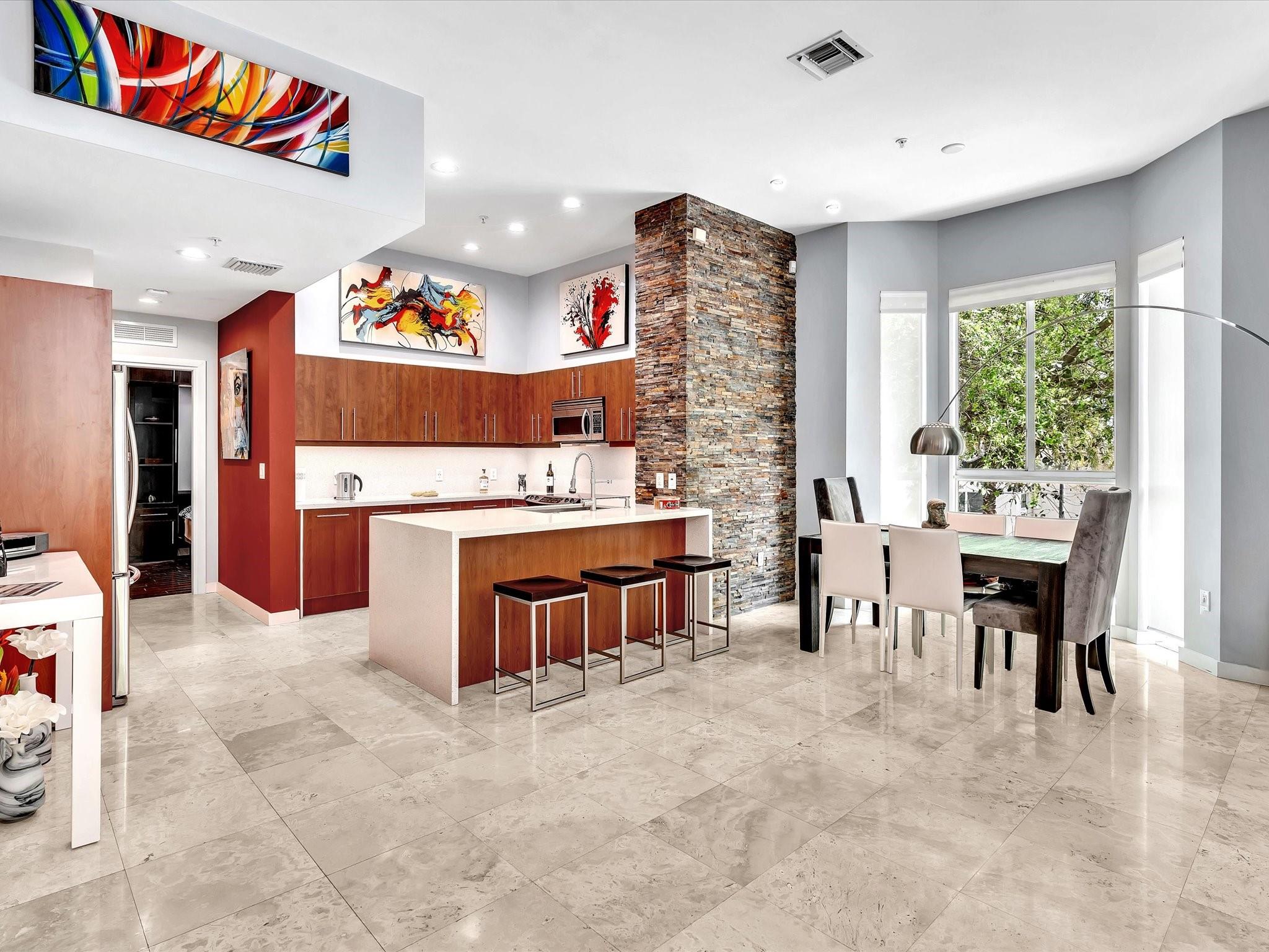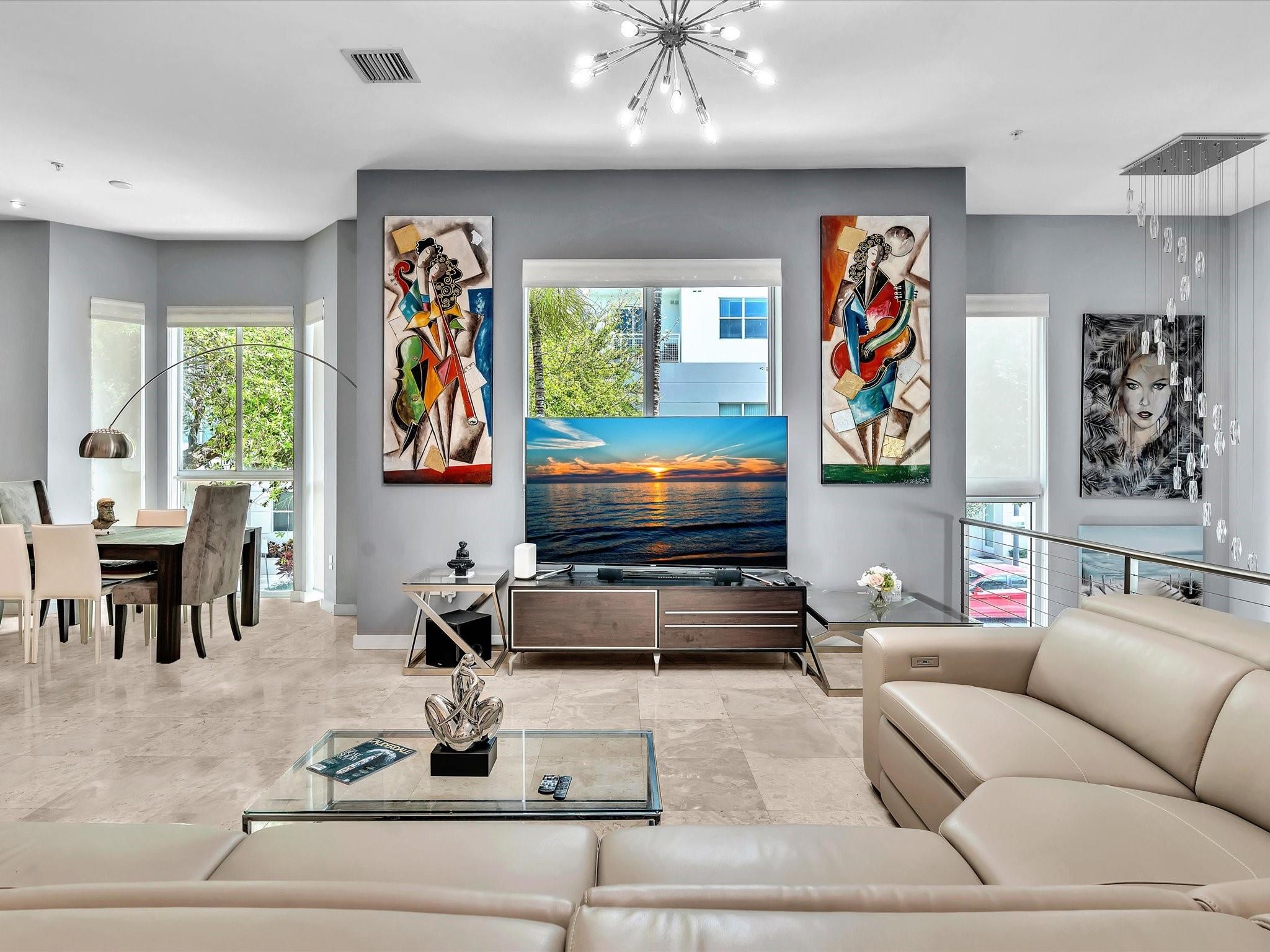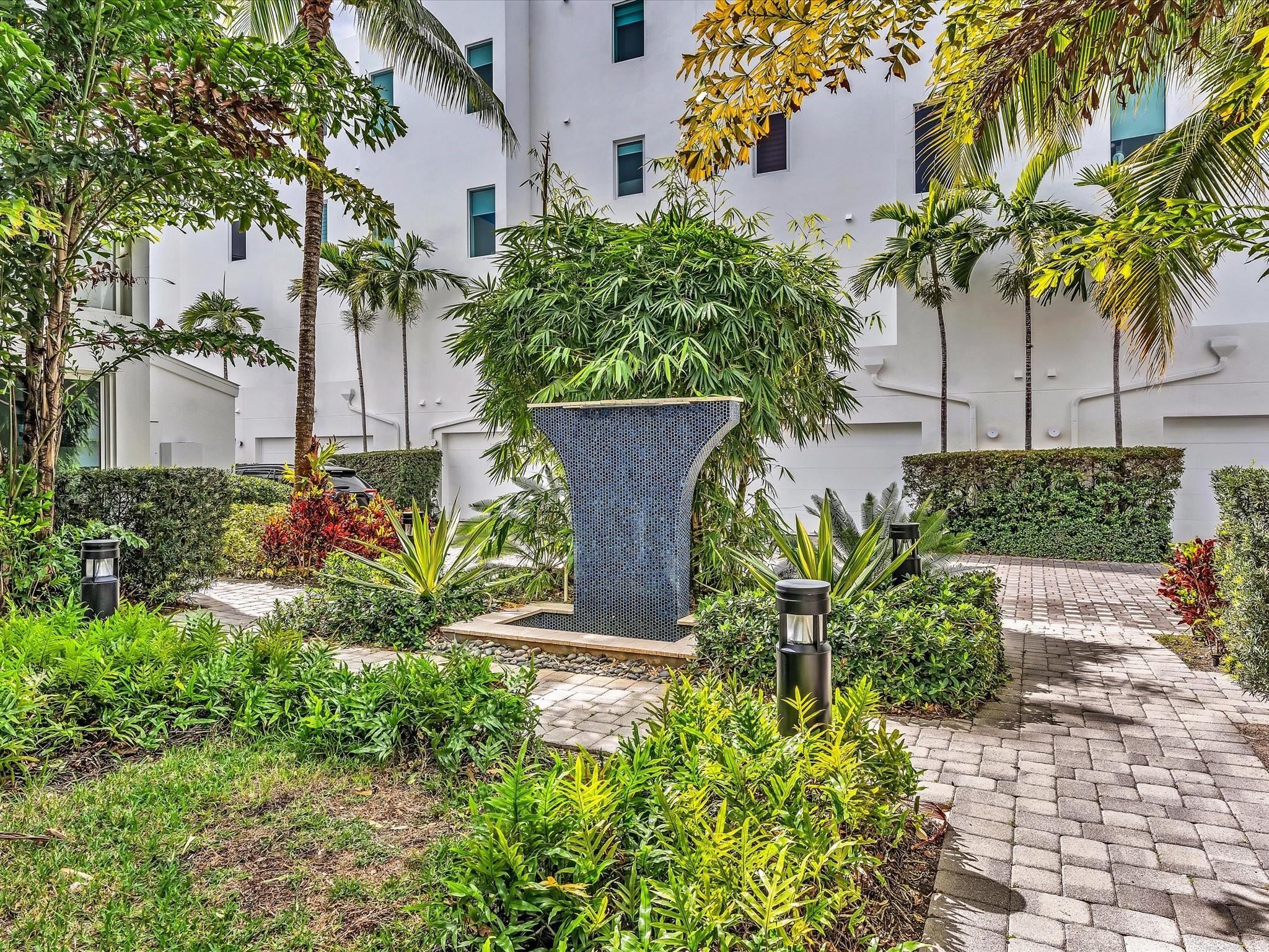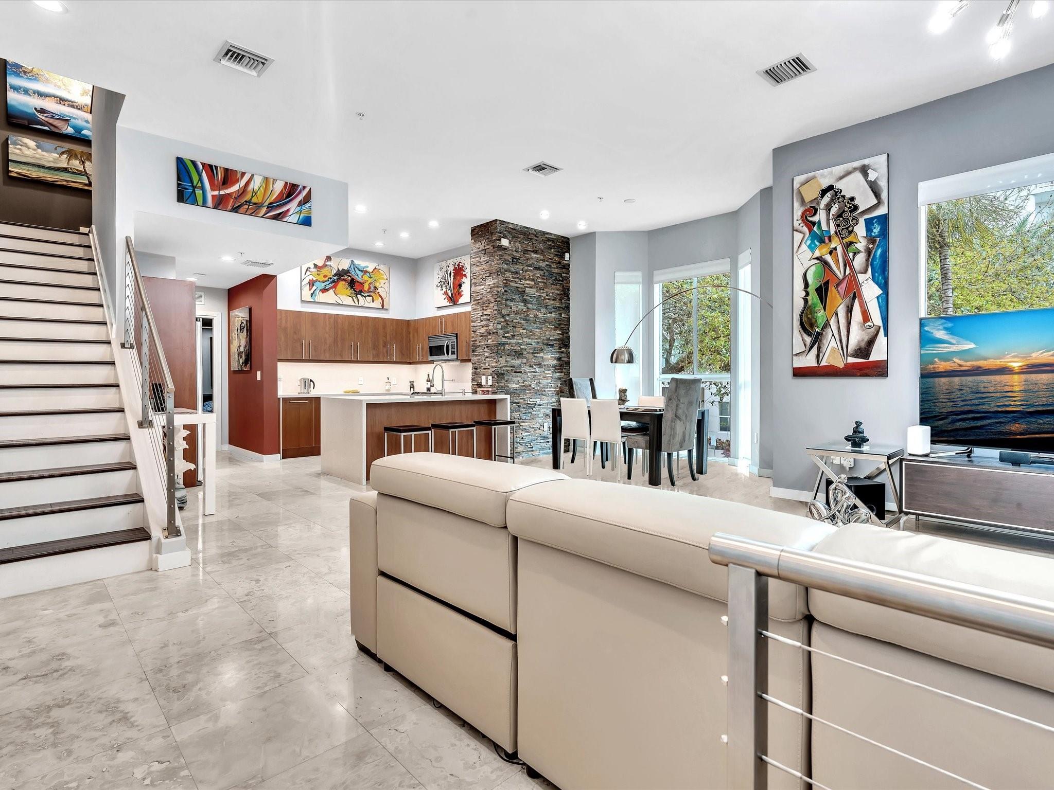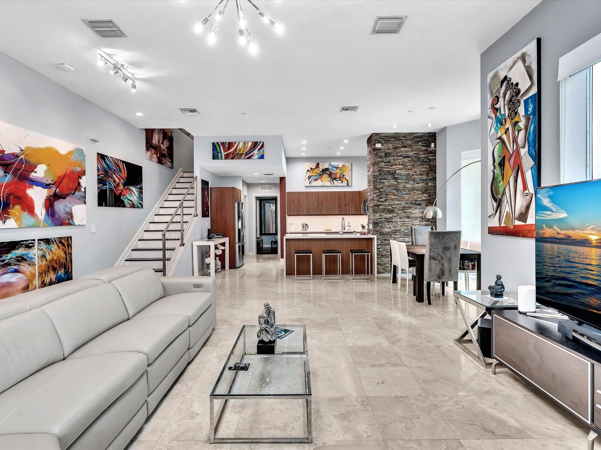 Elegant 4-story, fully furnished townhome with 50 paintings. Bamboo Flats community in the vibrant Flagler Village, downtown FTL. This property features 3 bedrooms, one could be used as office space on the ground floor, 3 full bathrooms, and a half bath, all designed with a modern aesthetic. The home boasts open, spacious living areas with 9 to 11-foot ceilings, large windows, and abundant natural light, complemented by custom-built cabinetry. The layout includes a 2-car garage and an office/den on the 1st floor, a kitchen and living area, plus one bedroom on the 2nd floor, and the master bedroom with ensuite bathroom, walk-in closet, terrace, washer/dryer (3rd floor). A large rooftop terrace (4th floor). Secure, gated community with lush tropical gardens and a beautiful pool area.