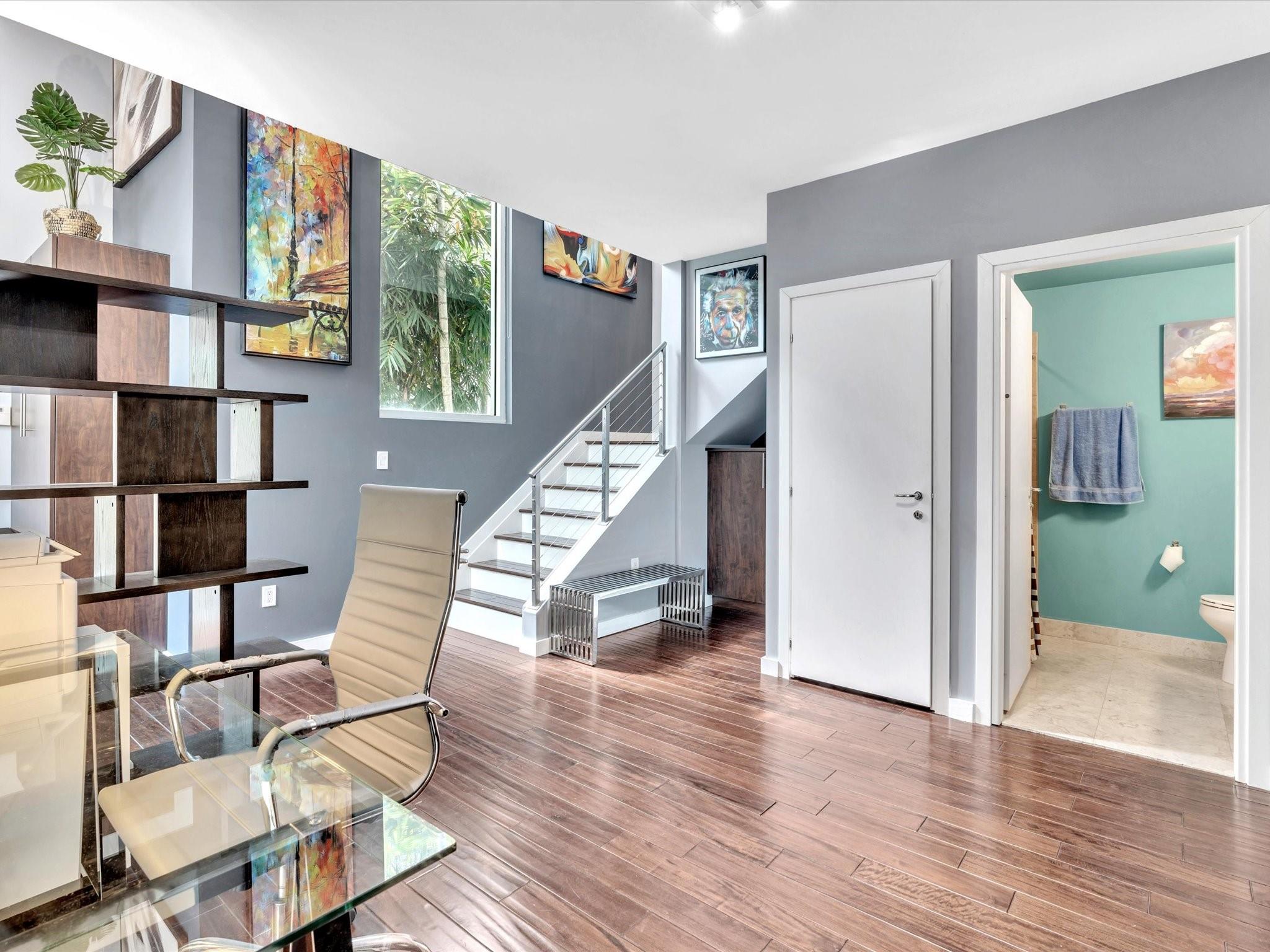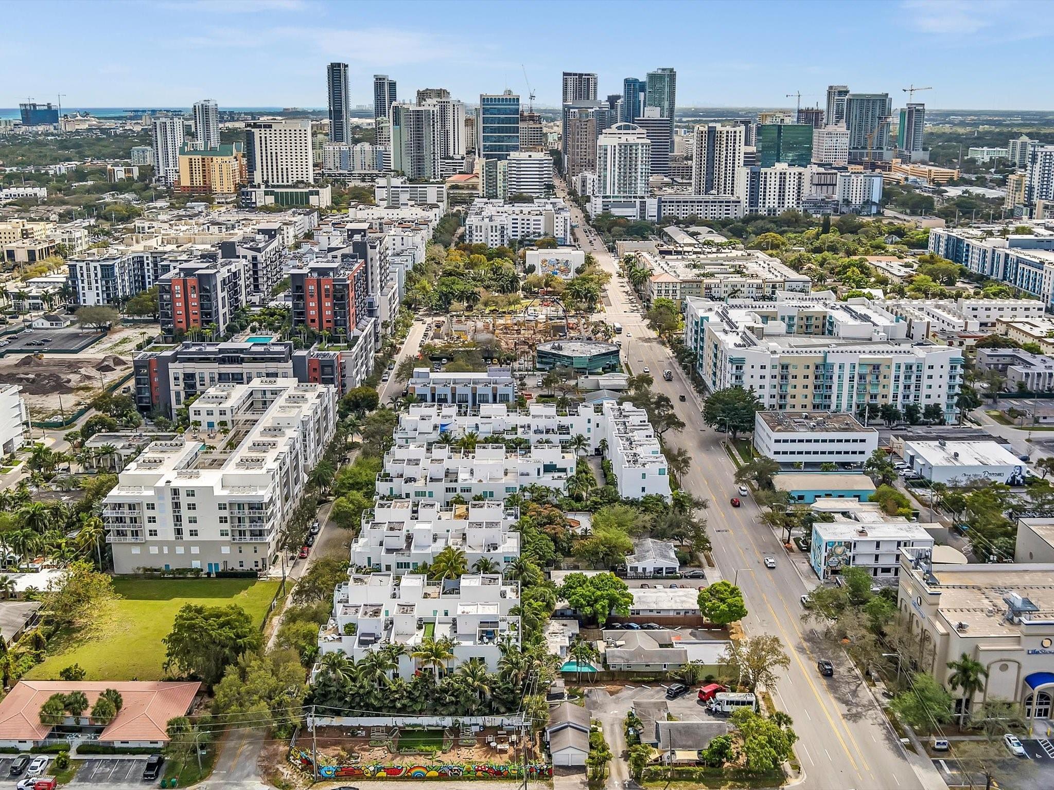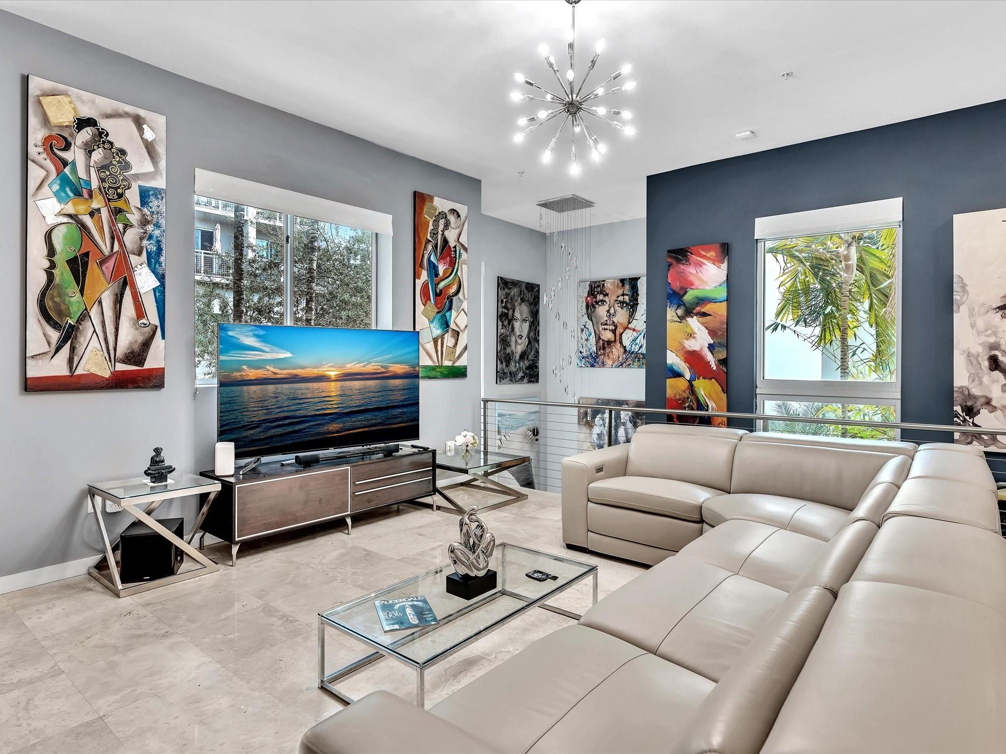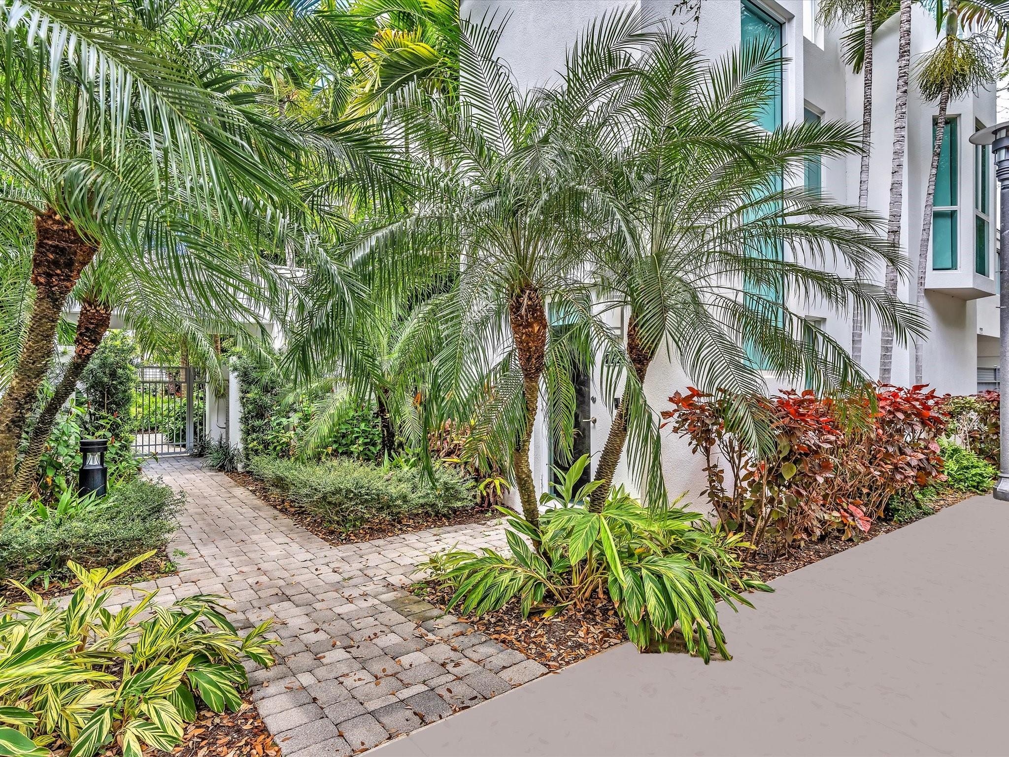 Elegant 4-story, fully furnished townhome with 50 paintings. Bamboo Flats community in the vibrant Flagler Village, downtown FTL. This property features 3 bedrooms, one could be used as office space on the ground floor, 3 full bathrooms, and a half bath, all designed with a modern aesthetic. The home boasts open, spacious living areas with 9 to 11-foot ceilings, large windows, and abundant natural light, complemented by custom-built cabinetry. The layout includes a 2-car garage and an office/den on the 1st floor, a kitchen and living area, plus one bedroom on the 2nd floor, and the master bedroom with ensuite bathroom, walk-in closet, terrace, washer/dryer (3rd floor). A large rooftop terrace (4th floor). Secure, gated community with lush tropical gardens and a beautiful pool area.