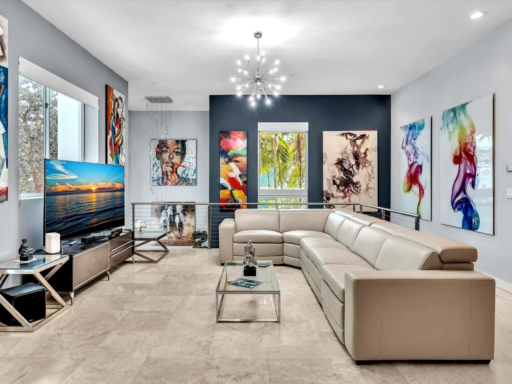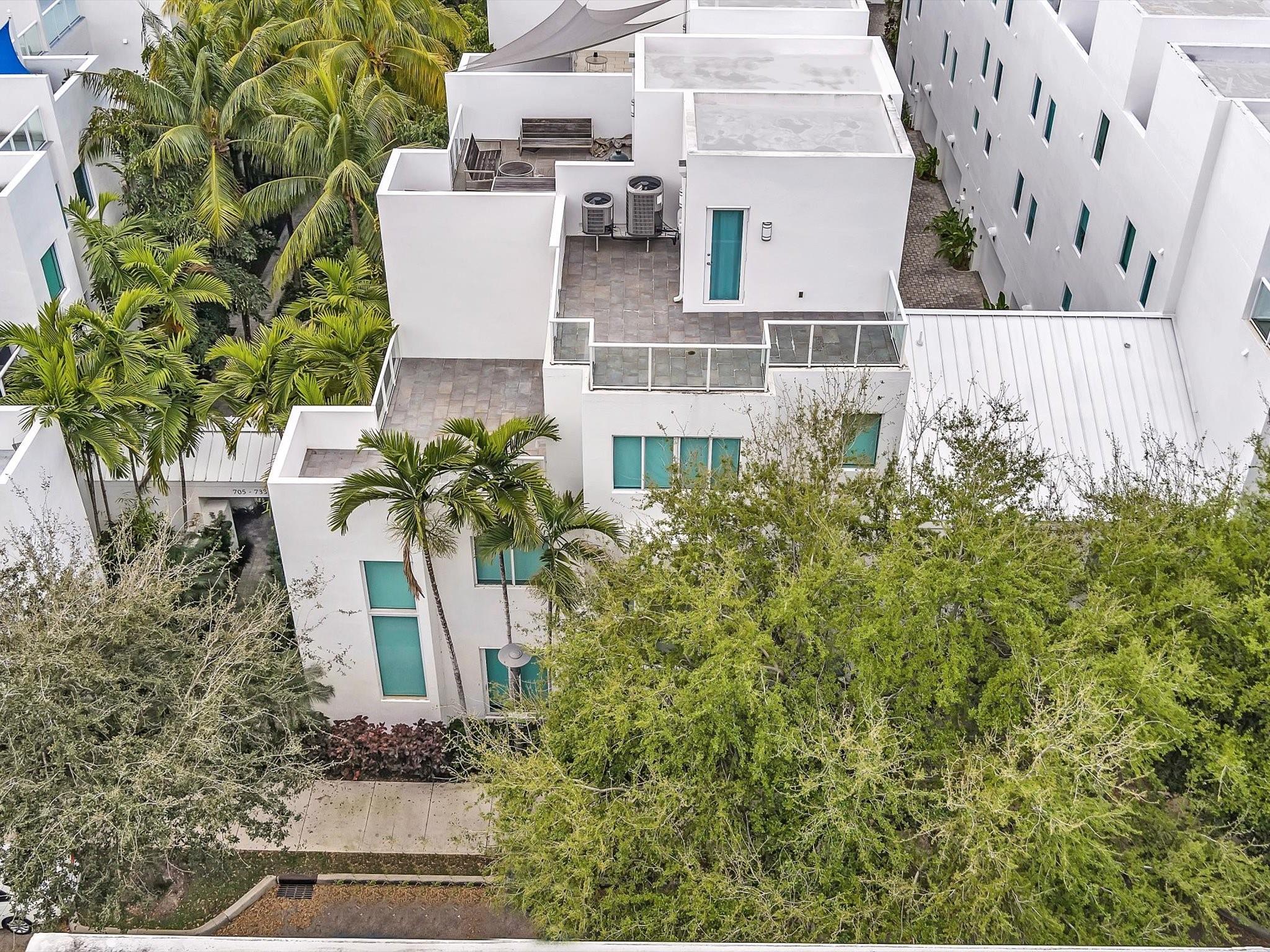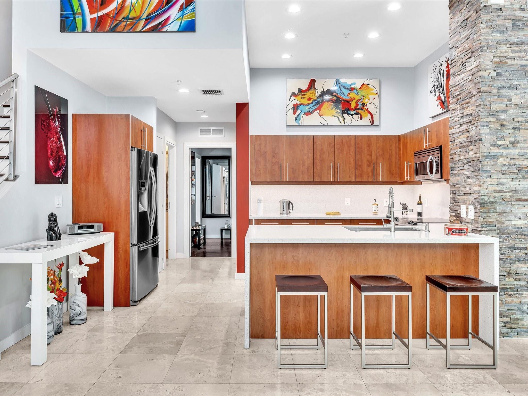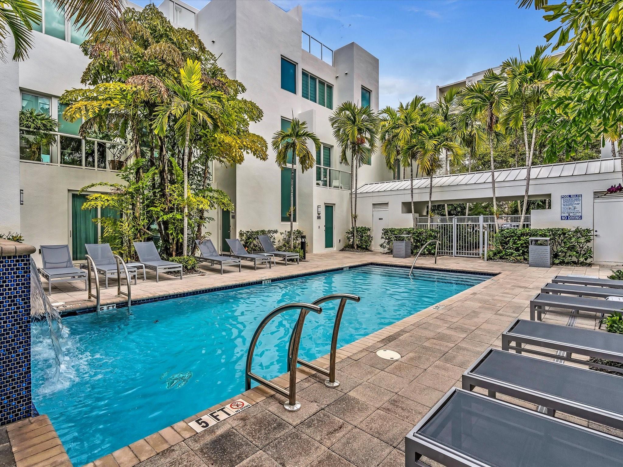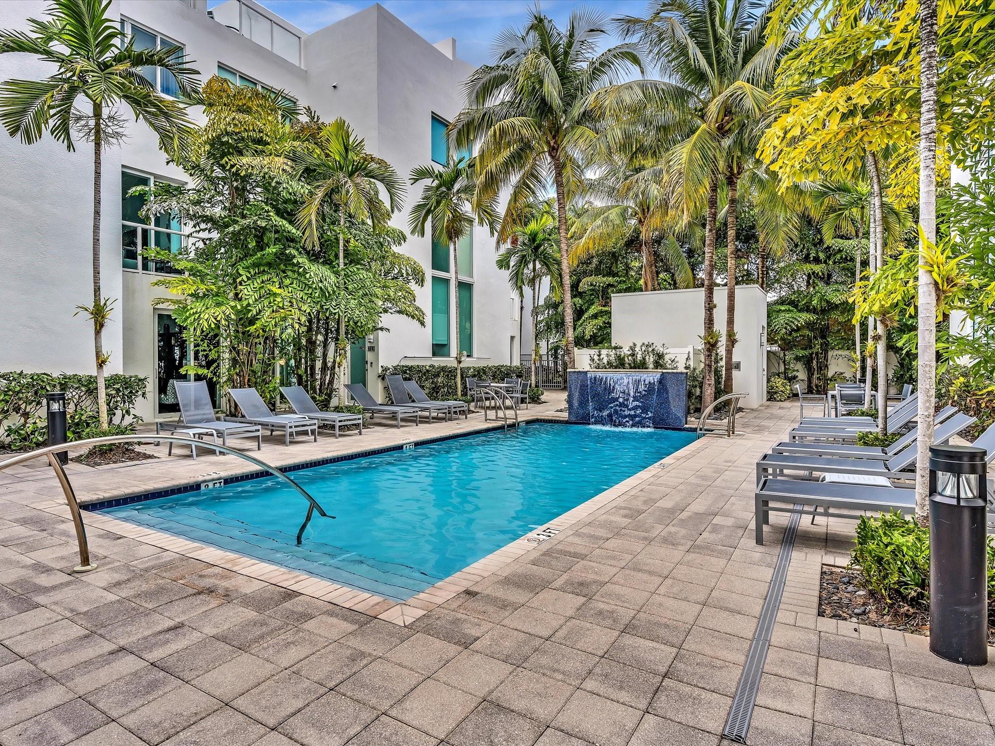Elegant 4-story, fully furnished townhome with 50 paintings. Bamboo Flats community in the vibrant Flagler Village, downtown FTL. This property features 3 bedrooms, one could be used as office space on the ground floor, 3 full bathrooms, and a half bath, all designed with a modern aesthetic. The home boasts open, spacious living areas with 9 to 11-foot ceilings, large windows, and abundant natural light, complemented by custom-built cabinetry. The layout includes a 2-car garage and an office/den on the 1st floor, a kitchen and living area, plus one bedroom on the 2nd floor, and the master bedroom with ensuite bathroom, walk-in closet, terrace, washer/dryer (3rd floor). A large rooftop terrace (4th floor). Secure, gated community with lush tropical gardens and a beautiful pool area.