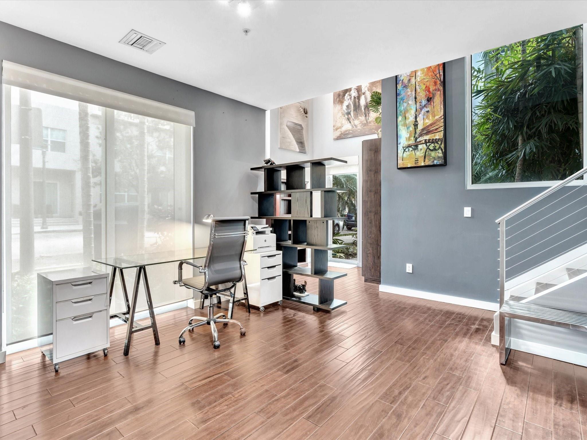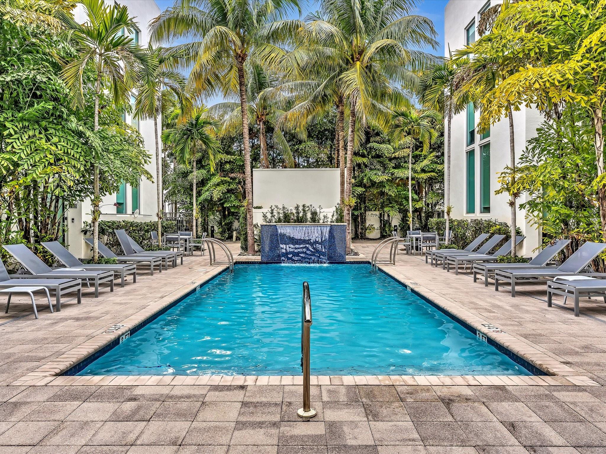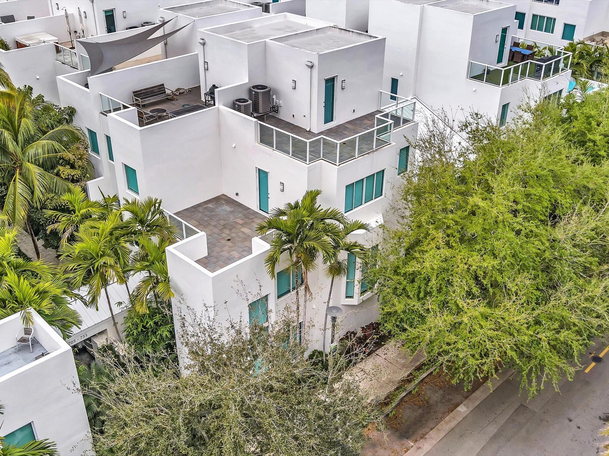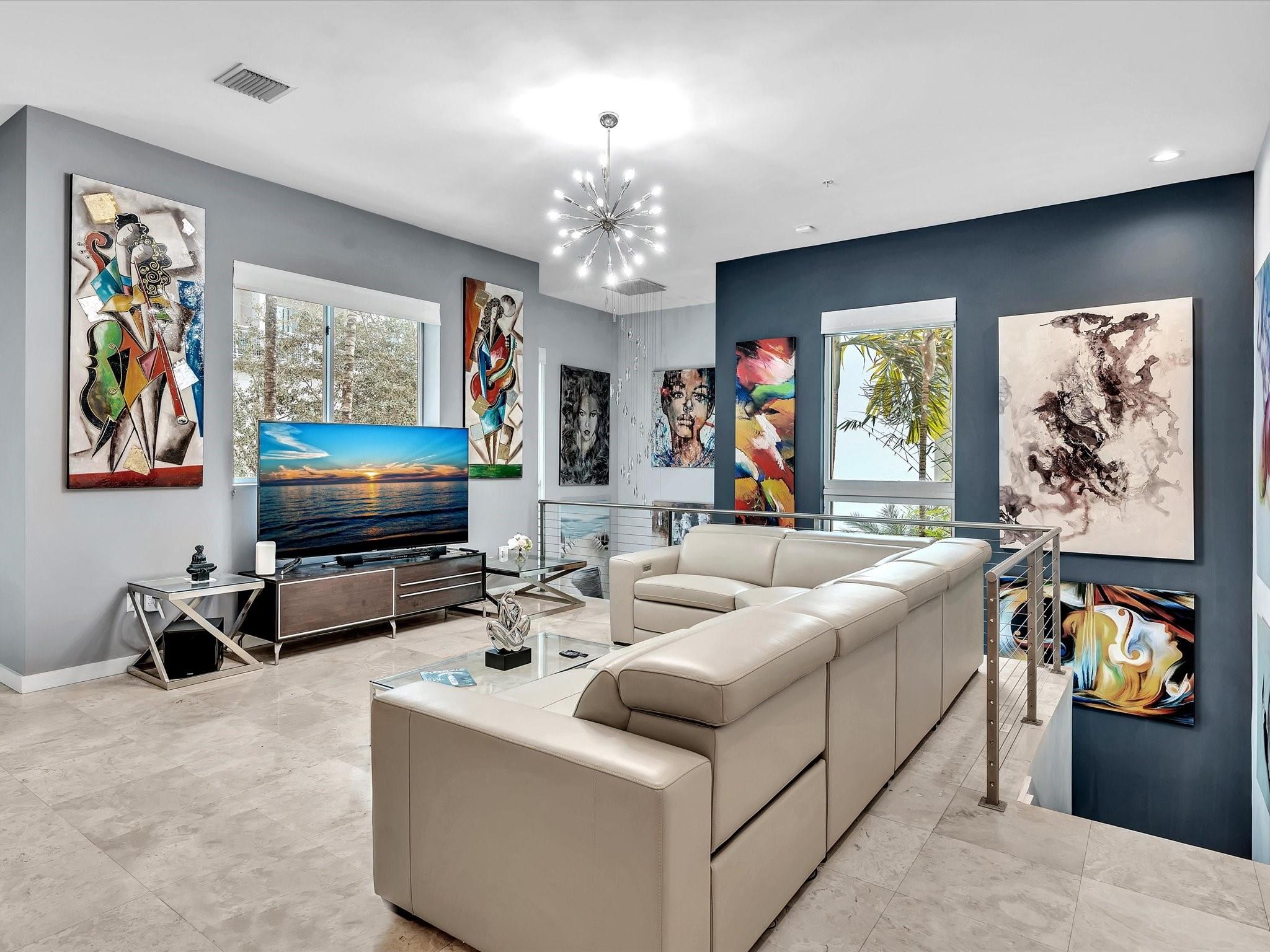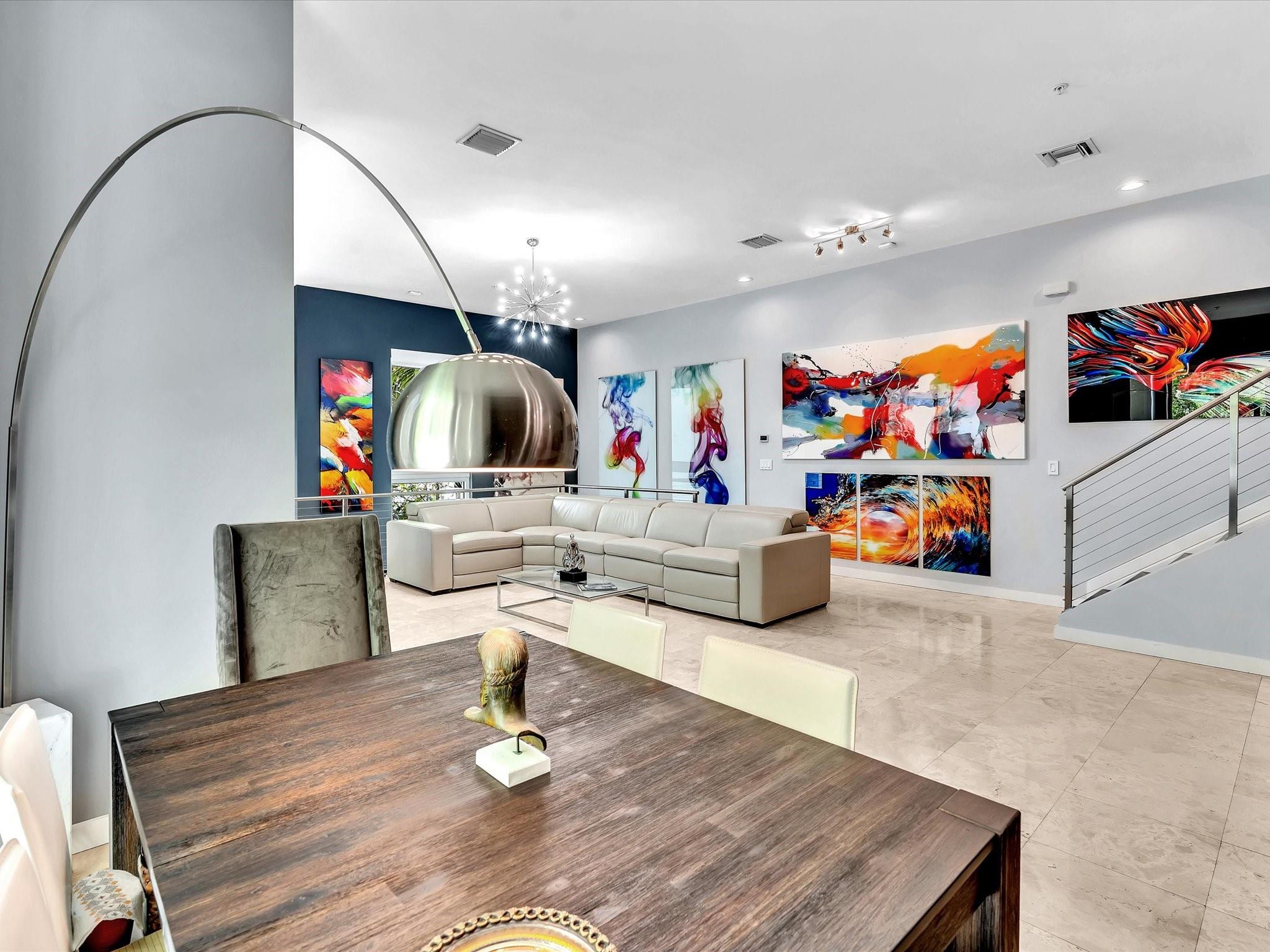 Elegant 4-story, fully furnished townhome with 50 paintings. Bamboo Flats community in the vibrant Flagler Village, downtown FTL. This property features 3 bedrooms, one could be used as office space on the ground floor, 3 full bathrooms, and a half bath, all designed with a modern aesthetic. The home boasts open, spacious living areas with 9 to 11-foot ceilings, large windows, and abundant natural light, complemented by custom-built cabinetry. The layout includes a 2-car garage and an office/den on the 1st floor, a kitchen and living area, plus one bedroom on the 2nd floor, and the master bedroom with ensuite bathroom, walk-in closet, terrace, washer/dryer (3rd floor). A large rooftop terrace (4th floor). Secure, gated community with lush tropical gardens and a beautiful pool area.