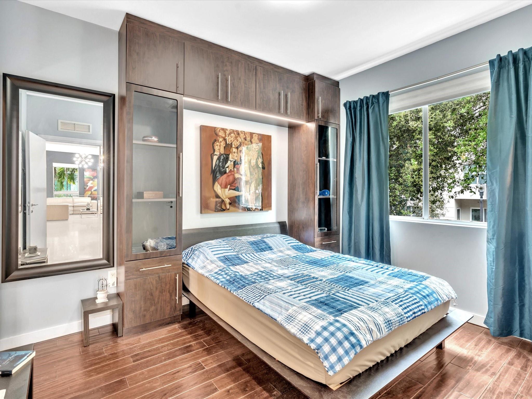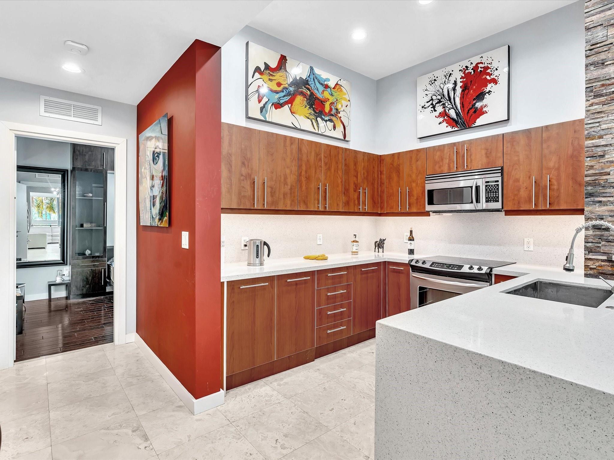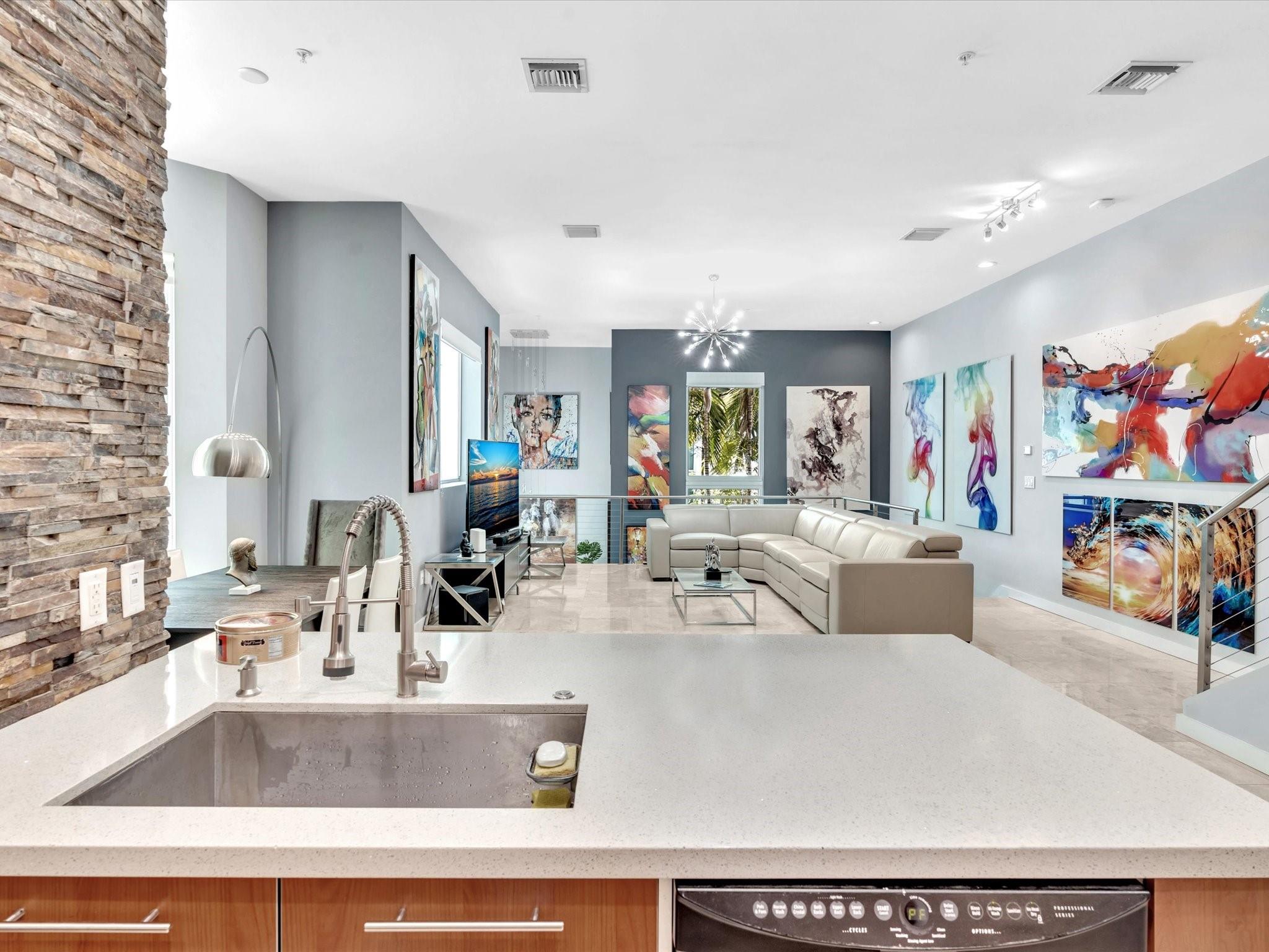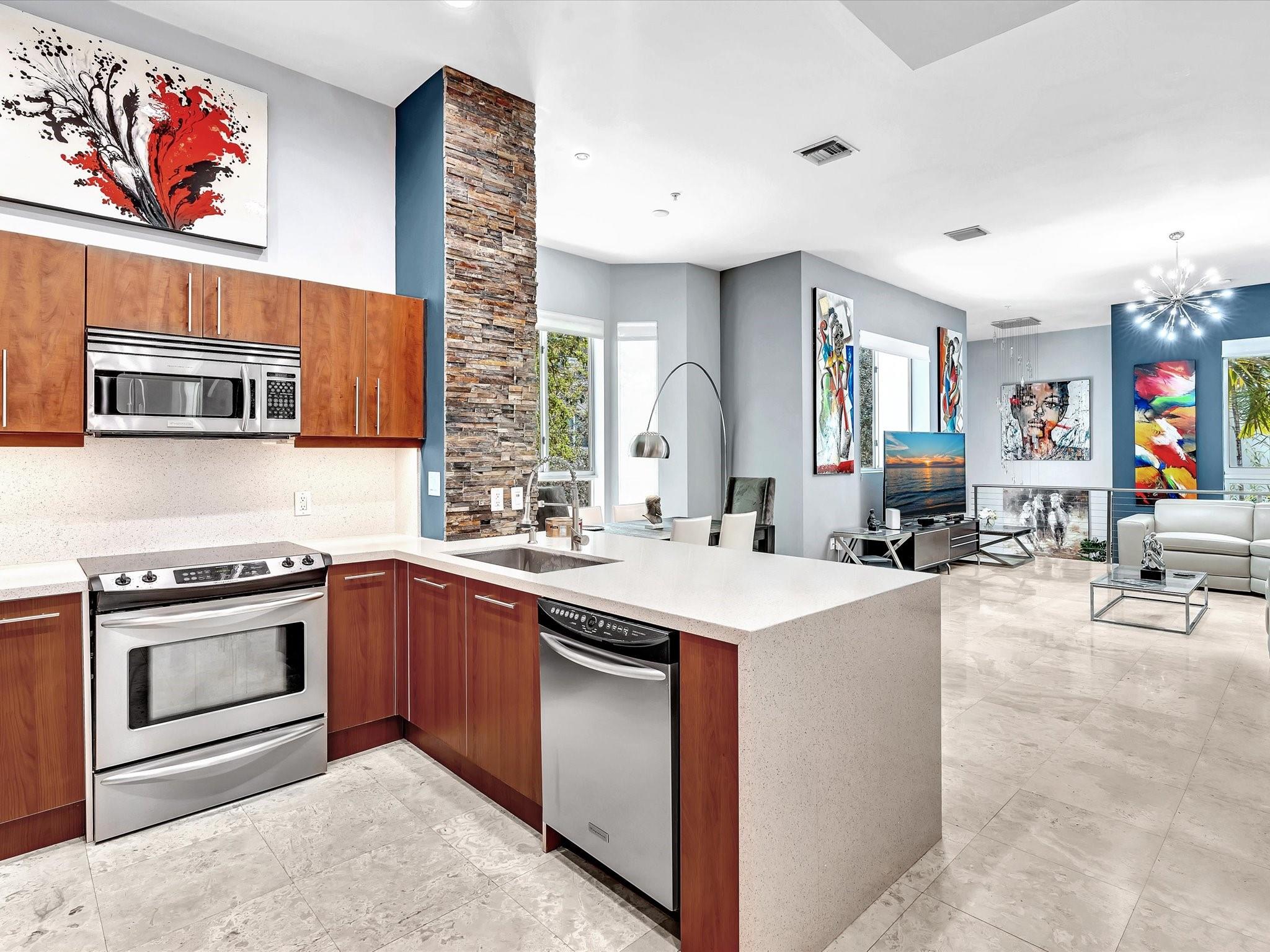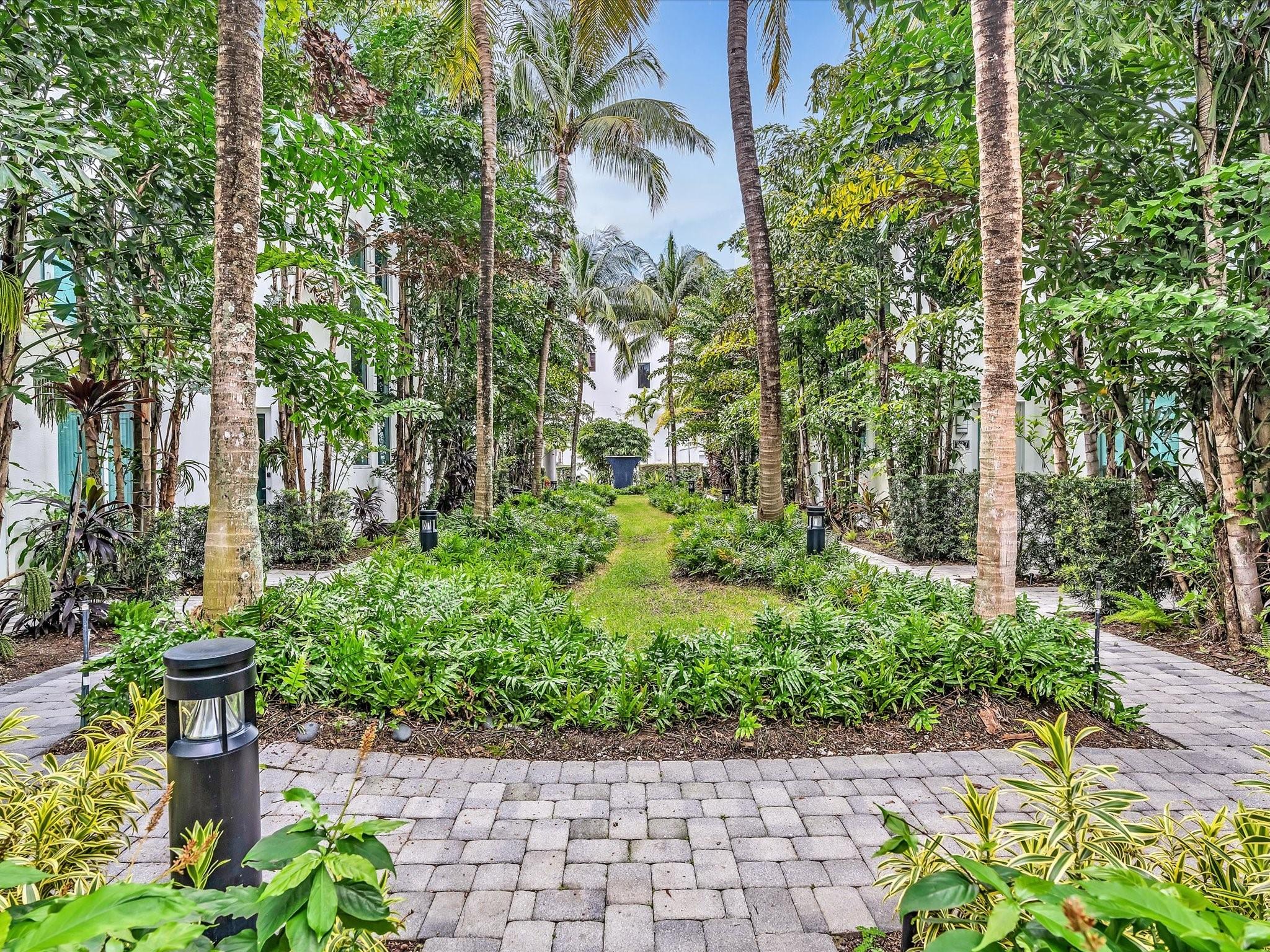 Elegant 4-story, fully furnished townhome with 50 paintings. Bamboo Flats community in the vibrant Flagler Village, downtown FTL. This property features 3 bedrooms, one could be used as office space on the ground floor, 3 full bathrooms, and a half bath, all designed with a modern aesthetic. The home boasts open, spacious living areas with 9 to 11-foot ceilings, large windows, and abundant natural light, complemented by custom-built cabinetry. The layout includes a 2-car garage and an office/den on the 1st floor, a kitchen and living area, plus one bedroom on the 2nd floor, and the master bedroom with ensuite bathroom, walk-in closet, terrace, washer/dryer (3rd floor). A large rooftop terrace (4th floor). Secure, gated community with lush tropical gardens and a beautiful pool area.