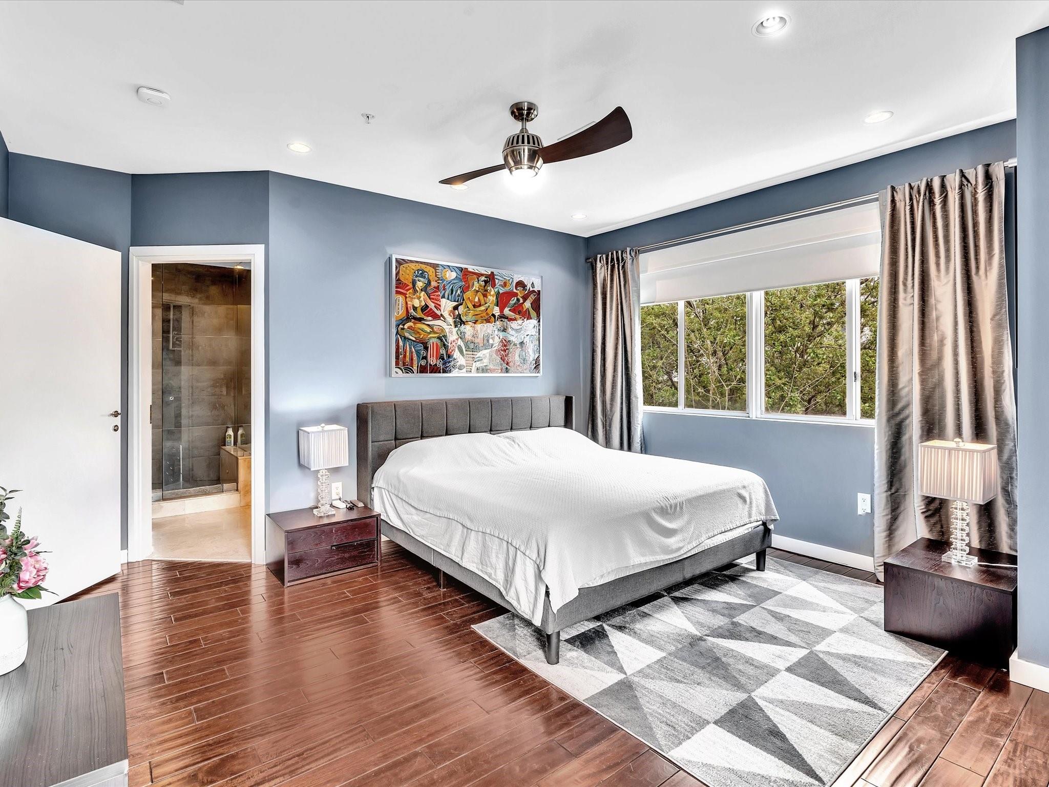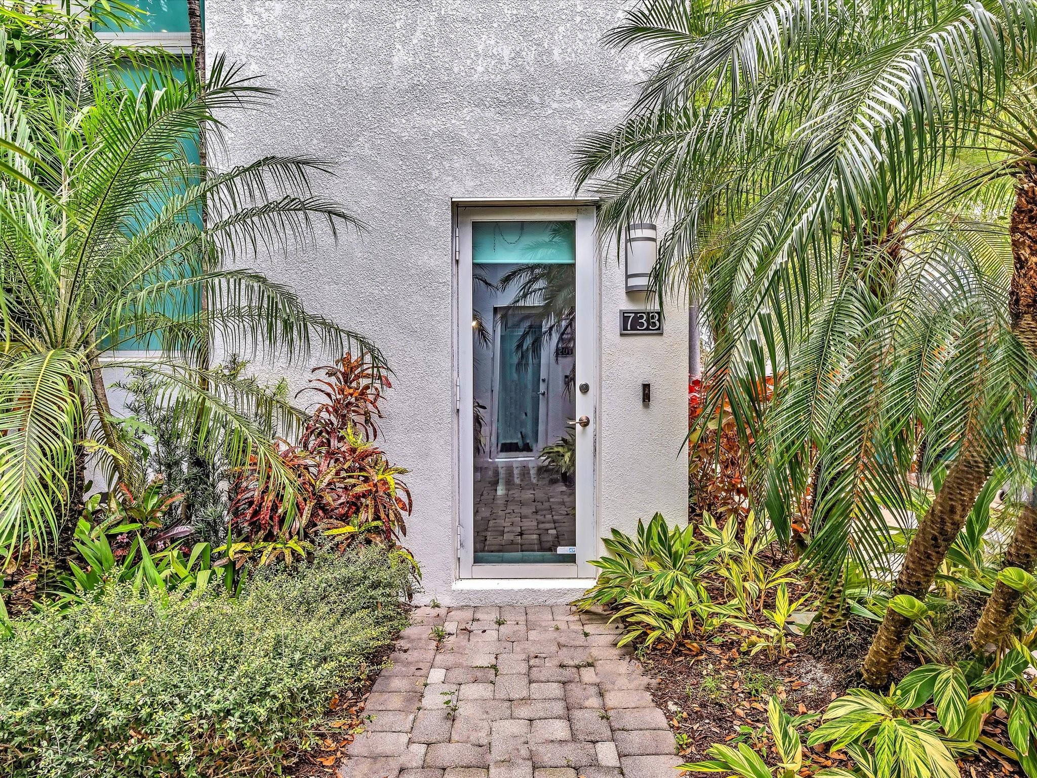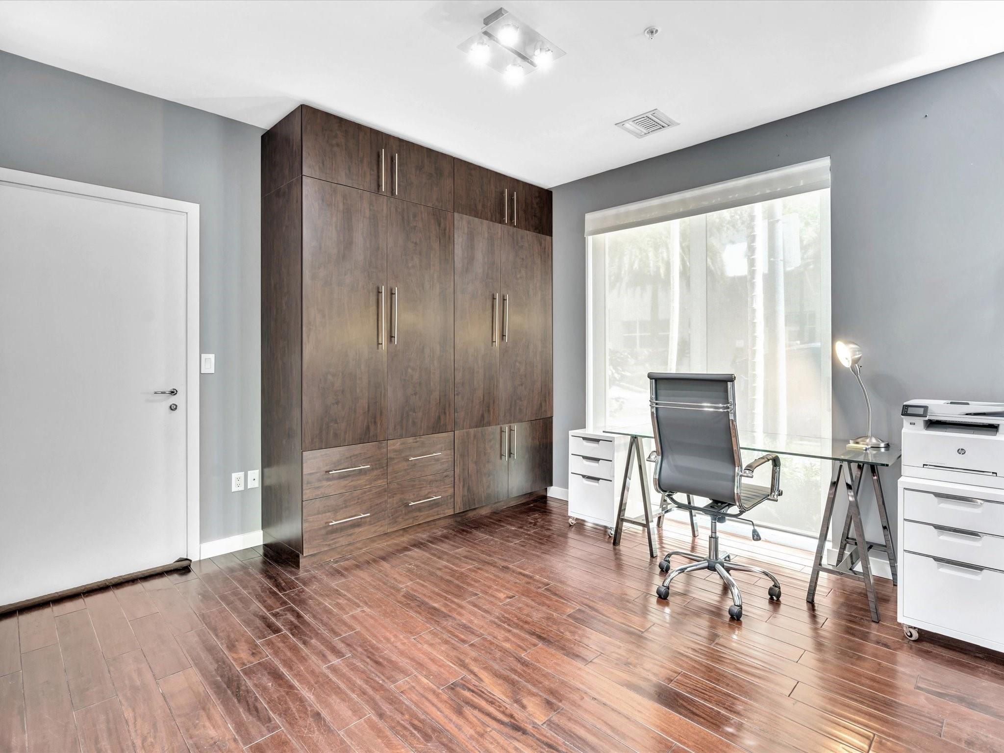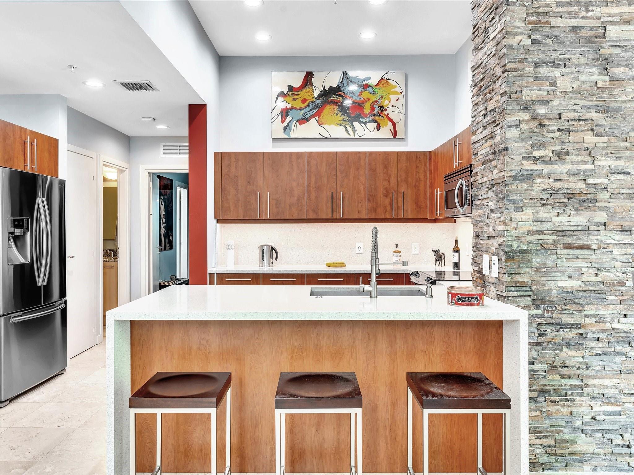 Elegant 4-story, fully furnished townhome with 50 paintings. Bamboo Flats community in the vibrant Flagler Village, downtown FTL. This property features 3 bedrooms, one could be used as office space on the ground floor, 3 full bathrooms, and a half bath, all designed with a modern aesthetic. The home boasts open, spacious living areas with 9 to 11-foot ceilings, large windows, and abundant natural light, complemented by custom-built cabinetry. The layout includes a 2-car garage and an office/den on the 1st floor, a kitchen and living area, plus one bedroom on the 2nd floor, and the master bedroom with ensuite bathroom, walk-in closet, terrace, washer/dryer (3rd floor). A large rooftop terrace (4th floor). Secure, gated community with lush tropical gardens and a beautiful pool area.