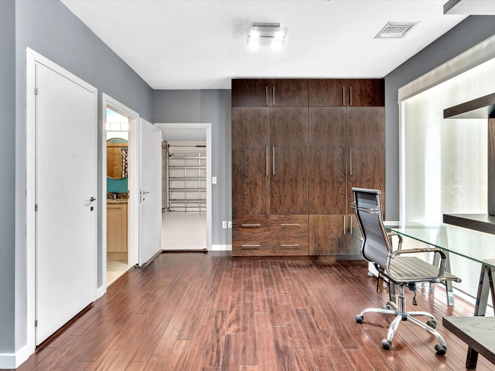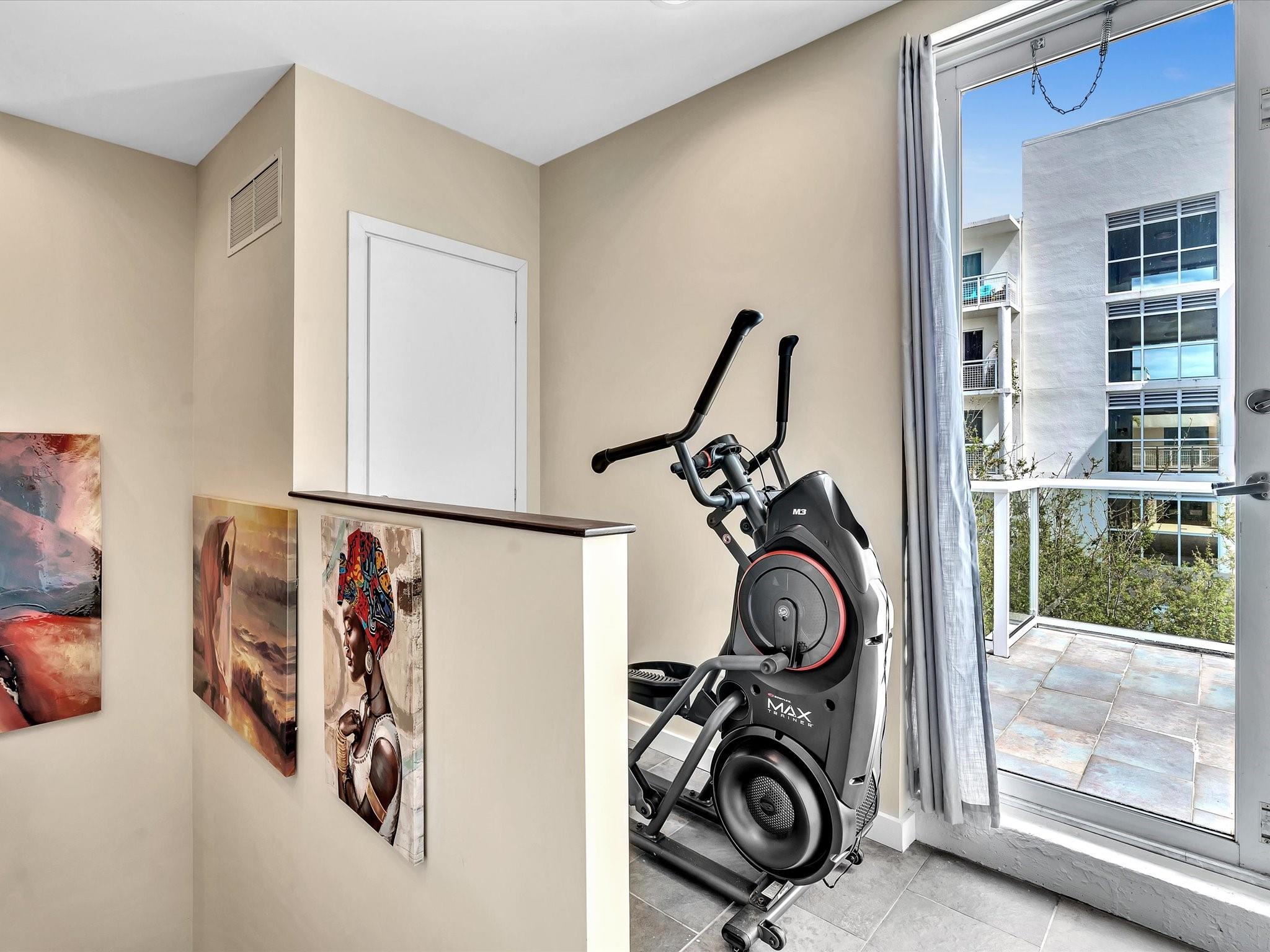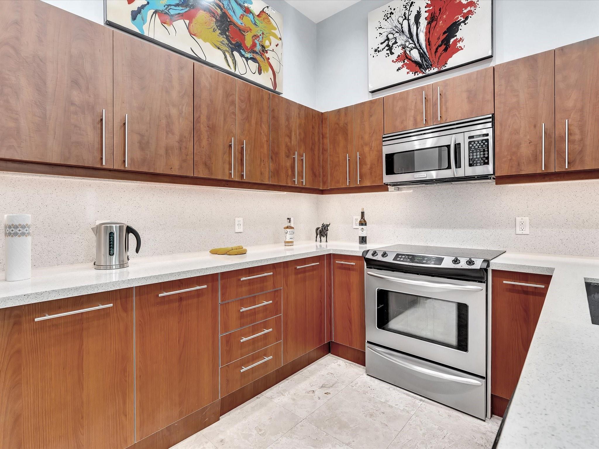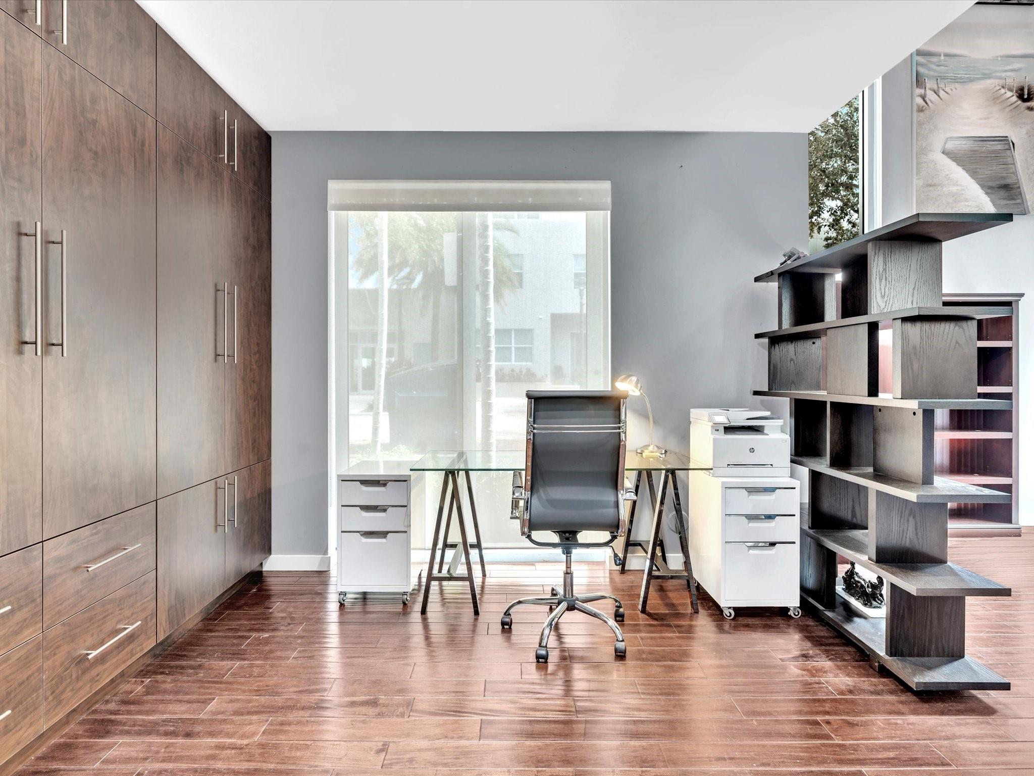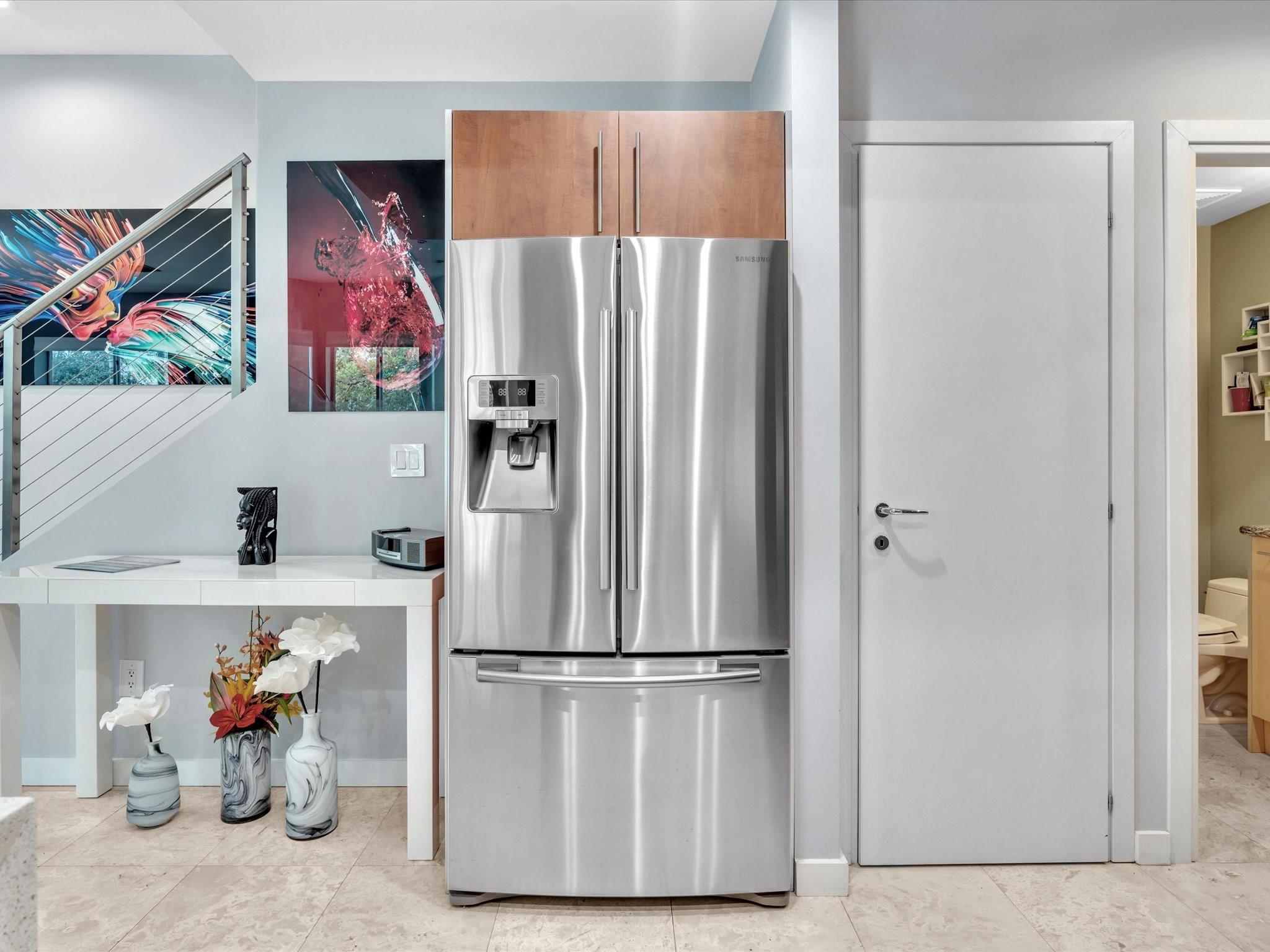 Elegant 4-story, fully furnished townhome with 50 paintings. Bamboo Flats community in the vibrant Flagler Village, downtown FTL. This property features 3 bedrooms, one could be used as office space on the ground floor, 3 full bathrooms, and a half bath, all designed with a modern aesthetic. The home boasts open, spacious living areas with 9 to 11-foot ceilings, large windows, and abundant natural light, complemented by custom-built cabinetry. The layout includes a 2-car garage and an office/den on the 1st floor, a kitchen and living area, plus one bedroom on the 2nd floor, and the master bedroom with ensuite bathroom, walk-in closet, terrace, washer/dryer (3rd floor). A large rooftop terrace (4th floor). Secure, gated community with lush tropical gardens and a beautiful pool area.