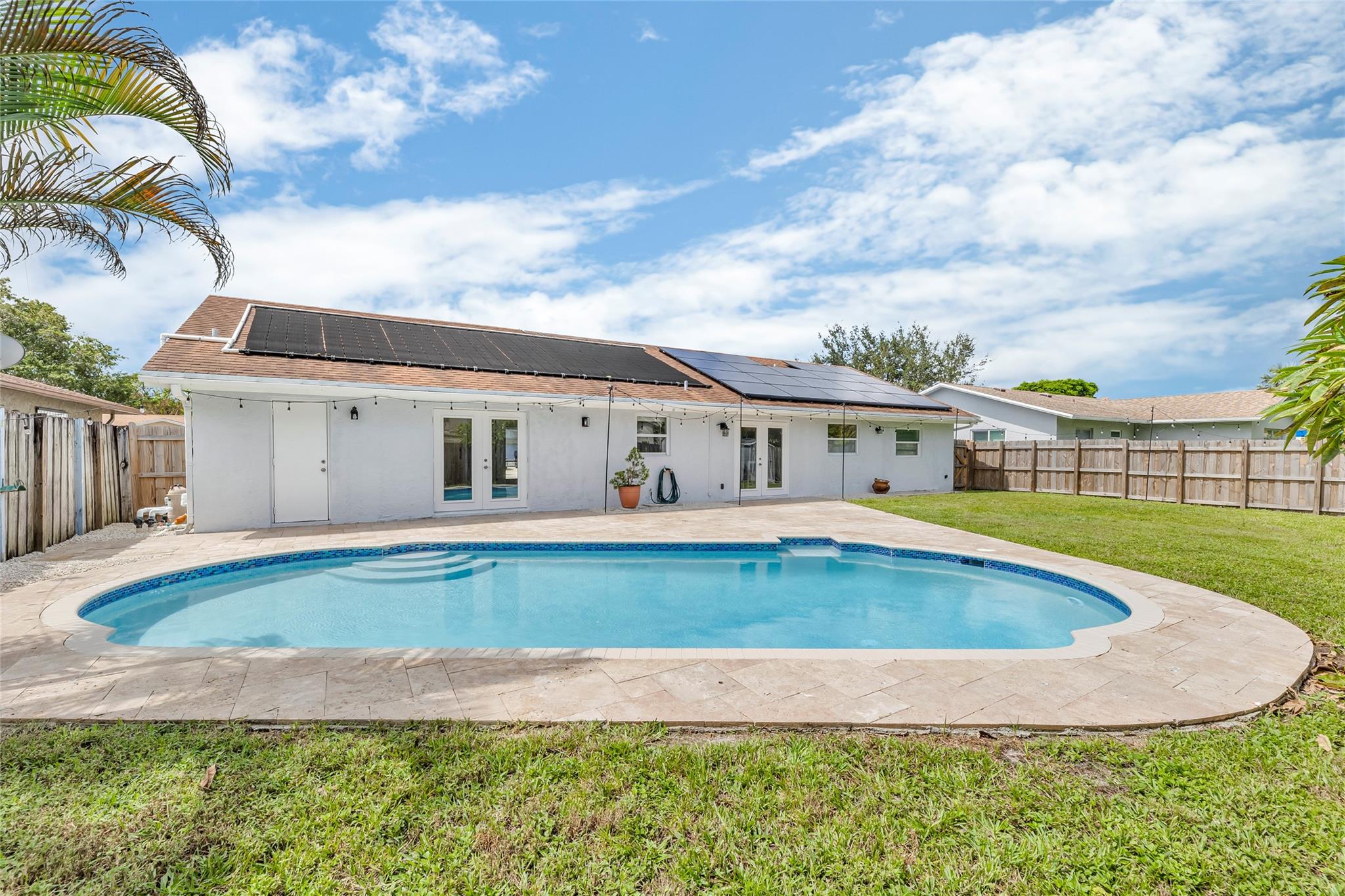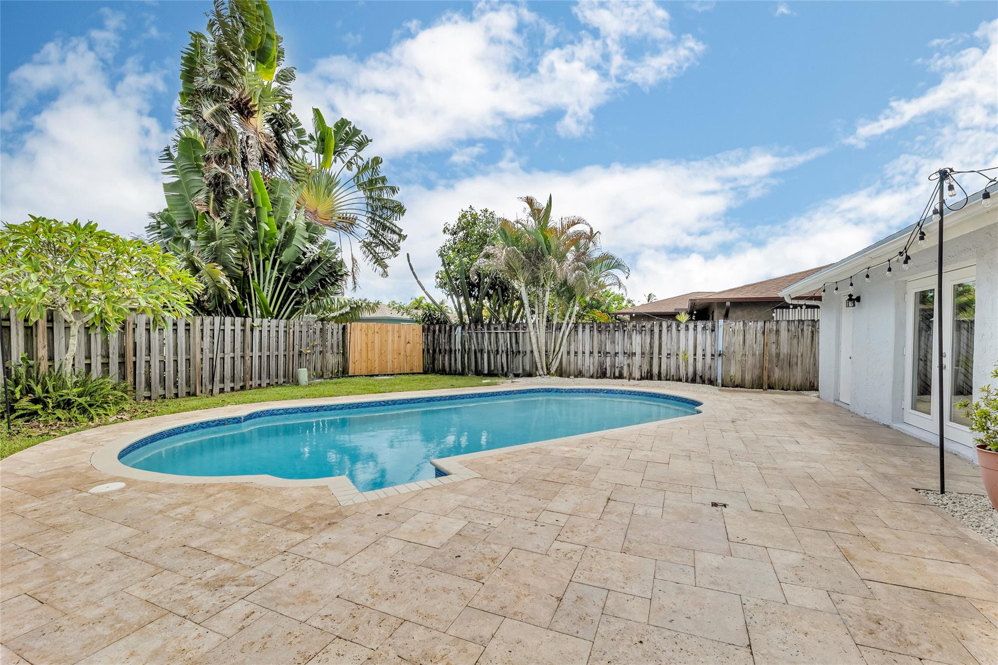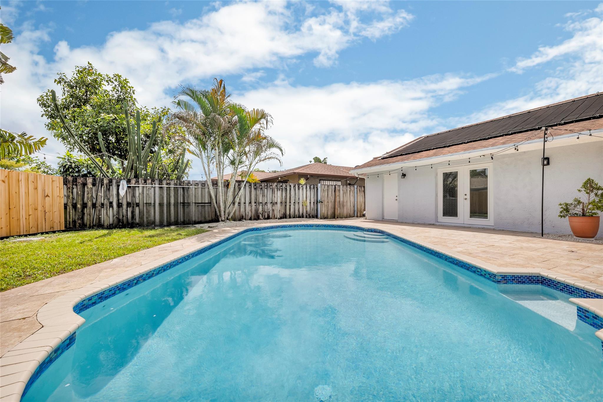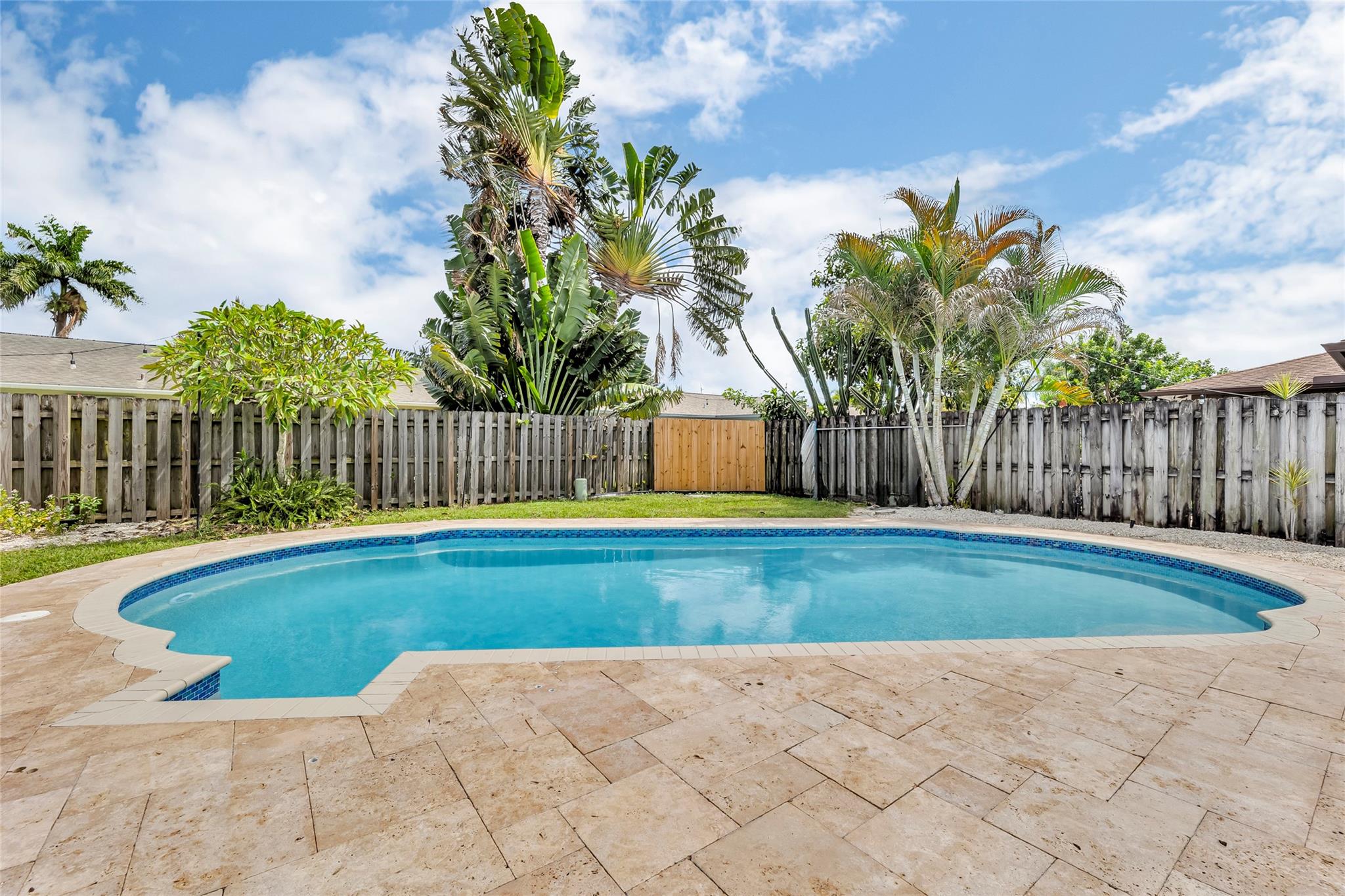 Discover your dream home in the heart of Palm Aire Village East. This beautiful 3-bedroom, 2-bathroom pool home offers a spacious open floor plan with a stunning vaulted ceiling. The modern kitchen features an oversized island and luxury vinyl plank flooring throughout. Step outside to your private backyard oasis, complete with a solar-heated swimming pool that has just been refinished, travertine tile patio, and a fully fenced space. Enjoy the benefits of a 10-year roof warranty and solar panels for energy efficiency and cost savings. Located in the highly desired, family friendly neighborhood of Palm Aire Village East with NO HOA! Minutes from Publix, restaurants, shops, I-95 and walking distance to Palm Aire Village Park & Calvary Christian Academy!
