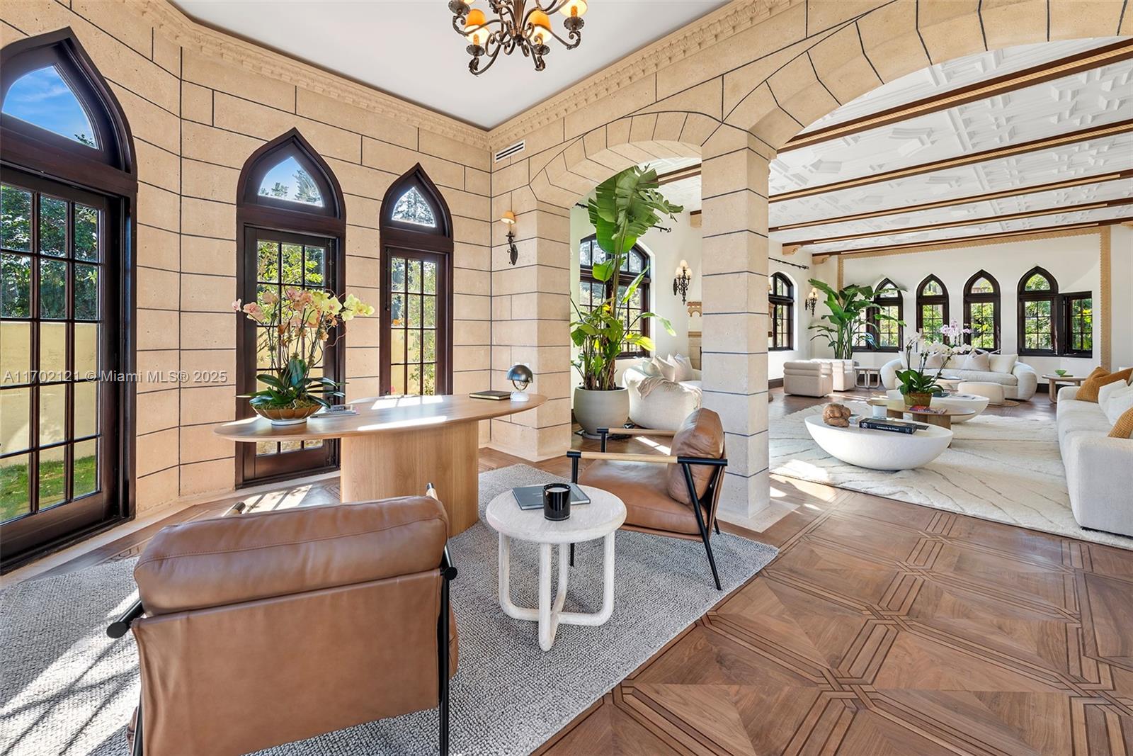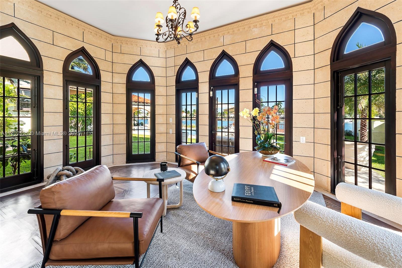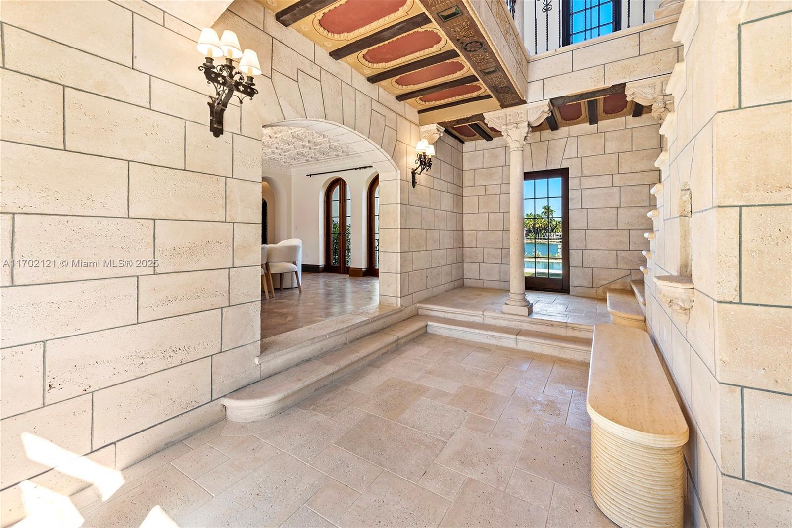 Perfectly nestled in the estates of Palm Island, a Mediterranean marvel with over 15K total SF of living space has been masterfully restored. Maintaining original architectural features, the estate boasts modern, state-of-the-art amenities + technology. Sprawling over 30K SF of lush grounds with exotic trees, fountains and 100' unobstructed waterfront, multiple scenic outdoor lounging+entertaining areas abound,including a rooftop and private deck over the water. The mansion offers 6beds 7/2bths, office, insolated movie theater, grand saloon, formal dining, cognac rm & art gallery. Chef's kitchen features 3 Wolf gas ranges+Subzero appl, enormous island, family room and 2nd dining. The guest villa has a Turkish hammam/sauna, jacuzzi,massage+gym. 2nd fl 3/2.5 living/dining/kitchen 2 elevators