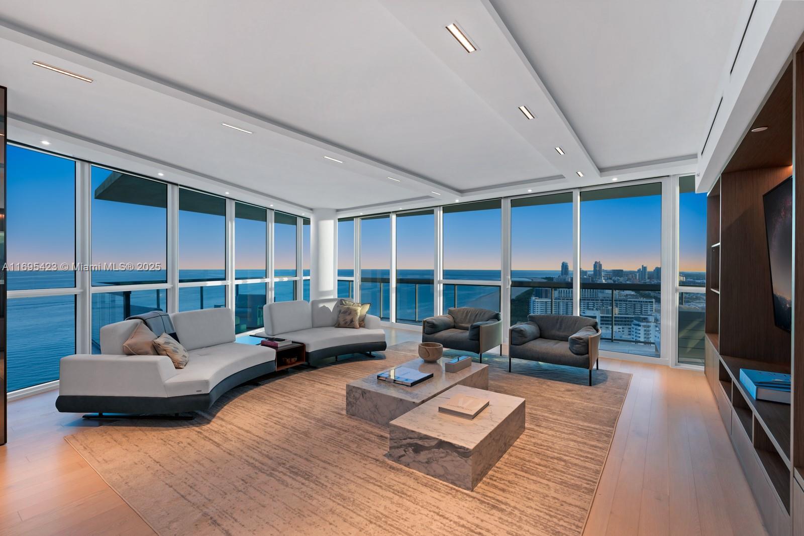 Step Inside With Me! This iconic Setai Skyhome unveils to a 63' oceanfront main salon with stunning sitting room and TV lounges. Spanning over 6,000 SF, this 4-unit combination floorplan represents the 2nd largest residence in the building where every social area & bedroom offers endless views. The custom reconfiguration includes white oak floors, sleek modern kitchen, tray ceilings, wood paneled millwork, Lutron automation, and marble baths with heated floors. Entertain in style at 2 bar settings and a world class oceanfront 3-row theater. Epic downtown skyline vistas and sunsets are afforded to the dining & family rooms as well as glass encased study/5th sleeping quarter. In the heart of Billionaires Beach, the 5 star Setai offers 3 restaurants, known spa & beach for celebrity sightings.