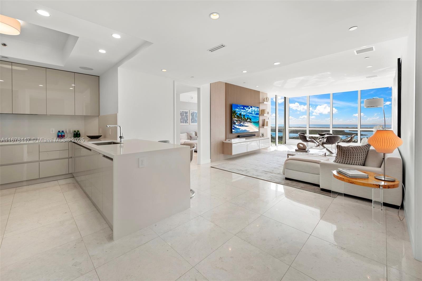 Newly renovated and turnkey furnished by Minotti, coupled with jaw-dropping panoramas make this the most desirable 2-bedroom at Continuum. Enter through a grand private lobby and witness amazing susnets over the Miami skyline, Fisher island. The principal suite with warm textures and earthy tones boasts a siting lounge, oversized walk-in and beautiful marble bath. European kitchen features new Miele appliances, quartz stone tops. Louvered millwork adonres the formal living, equiped with Sonos system. Residents will induldge in a lifestyle of wellness within a private, 13 acre oasis, including a tri-level fitness club, medspa, salon, pilattes/spining/yoga, 3 pools, cold-plundges, 3 Har-tru tennis courts, beach club, Patio and Catch retaurants on site. Walk to the best culinary scene in SoFi