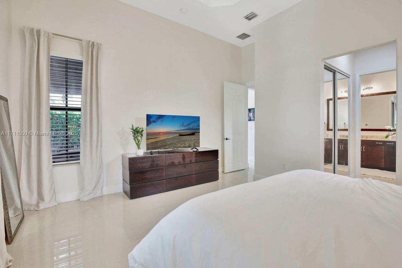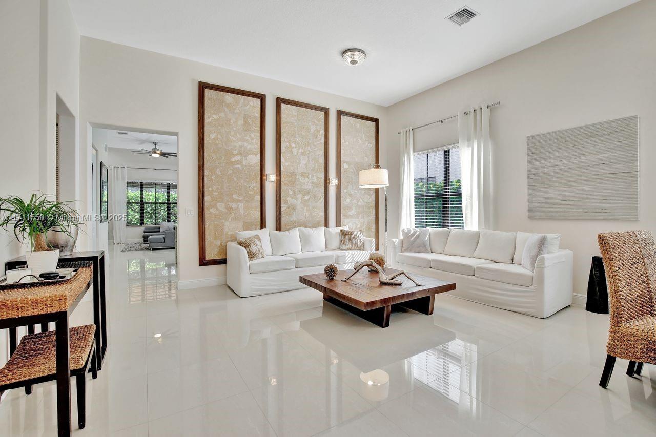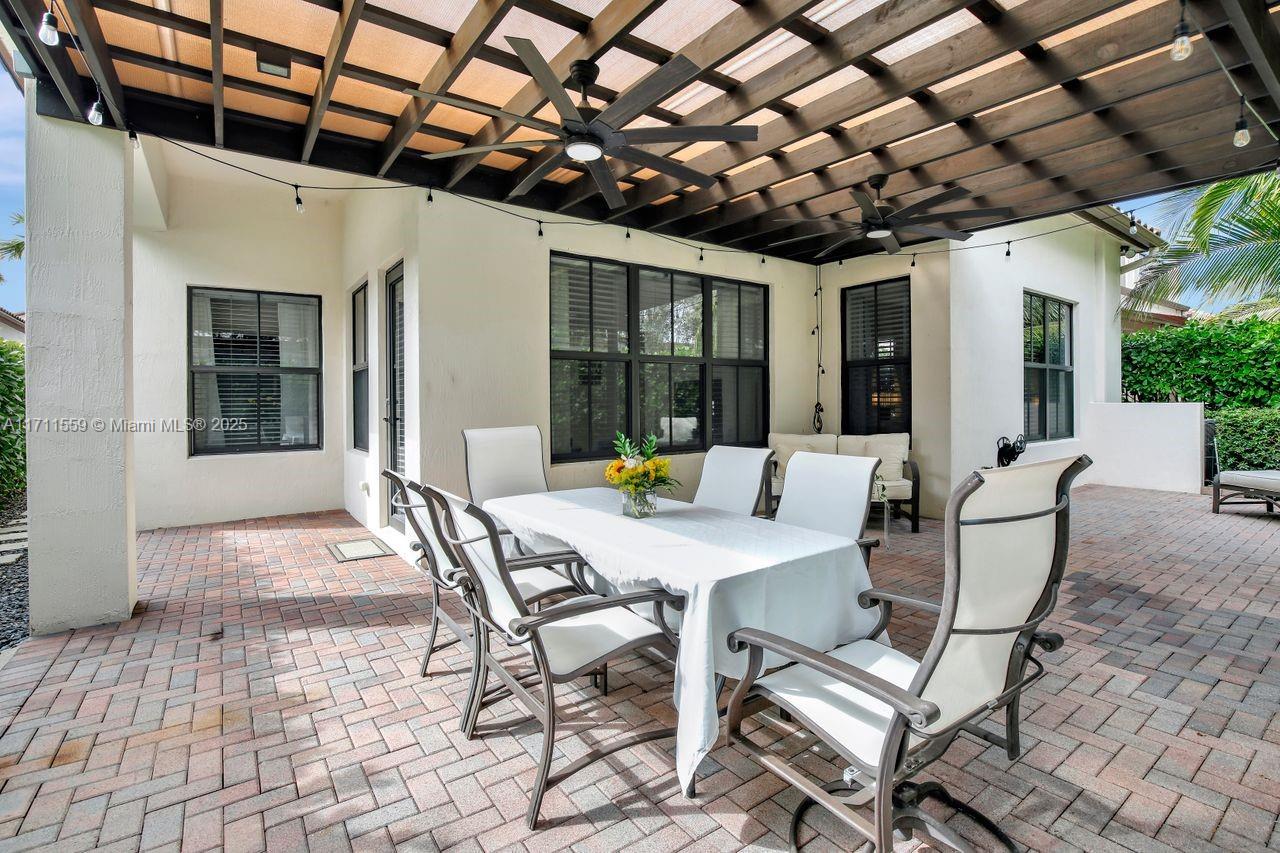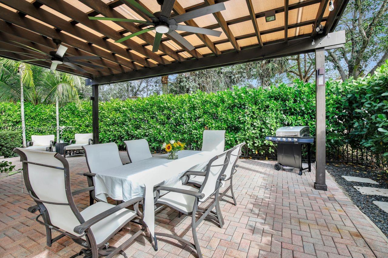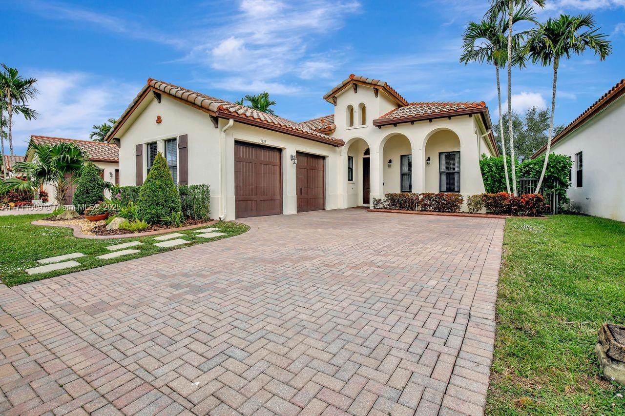 Discover the epitome of luxury living in Cooper City's most coveted gated community, Monterra. This exclusive, resort-style neighborhood offers top-tier security, a clubhouse with a state-of-the-art fitness center, pool, waterpark, tennis, basketball courts, and 3 parks. Four-bedroom, three-bathroom home that blends elegance with comfort. The kitchen features 42" wood cabinetry, upgraded stainless steel appliances, and ample storage complemented by an expansive pantry and opens up seamlessly to the family room and a sunlit breakfast nook. Impact windows. Soaring 12+ foot ceilings, this home feels bright, open and airy. Custom closets throughout. Newly added pergola, perfect for outdoor entertaining or enjoying peaceful evenings at home surrounded by lush trees for privacy.