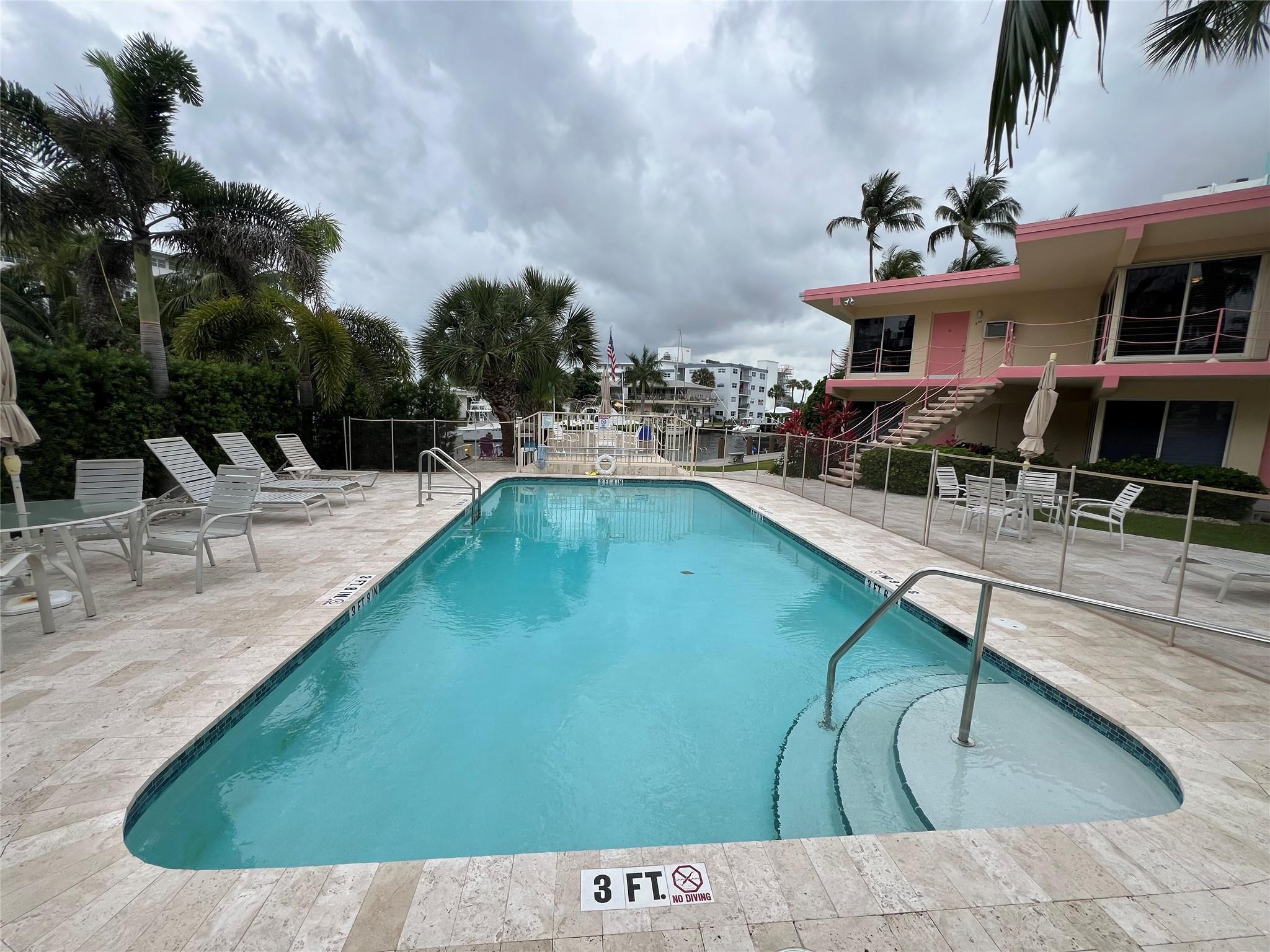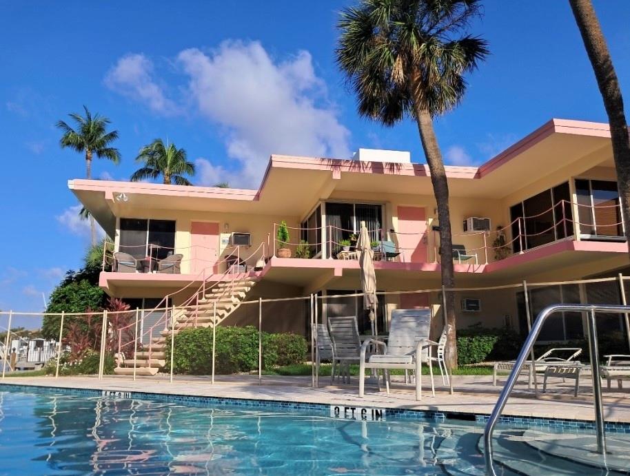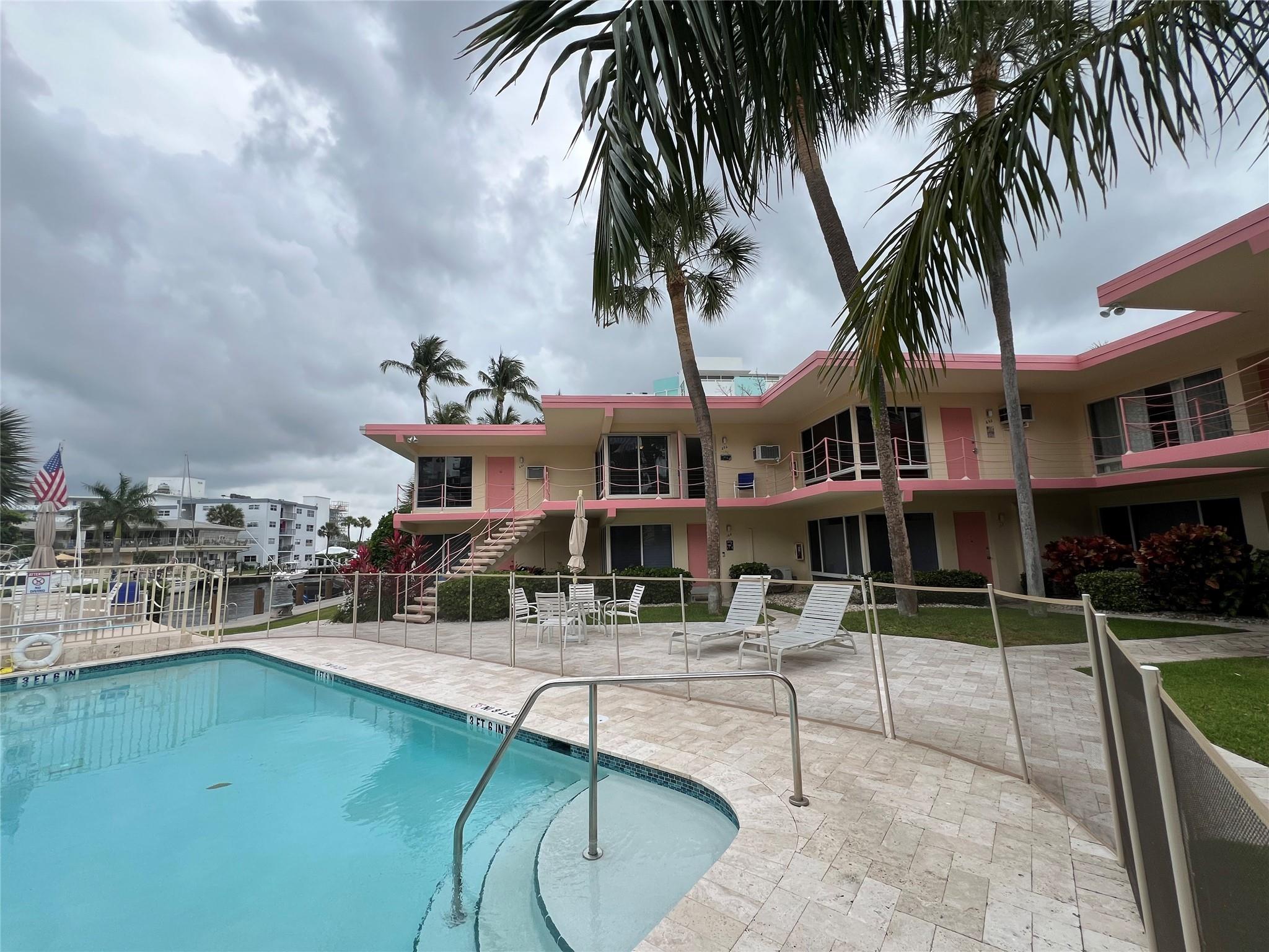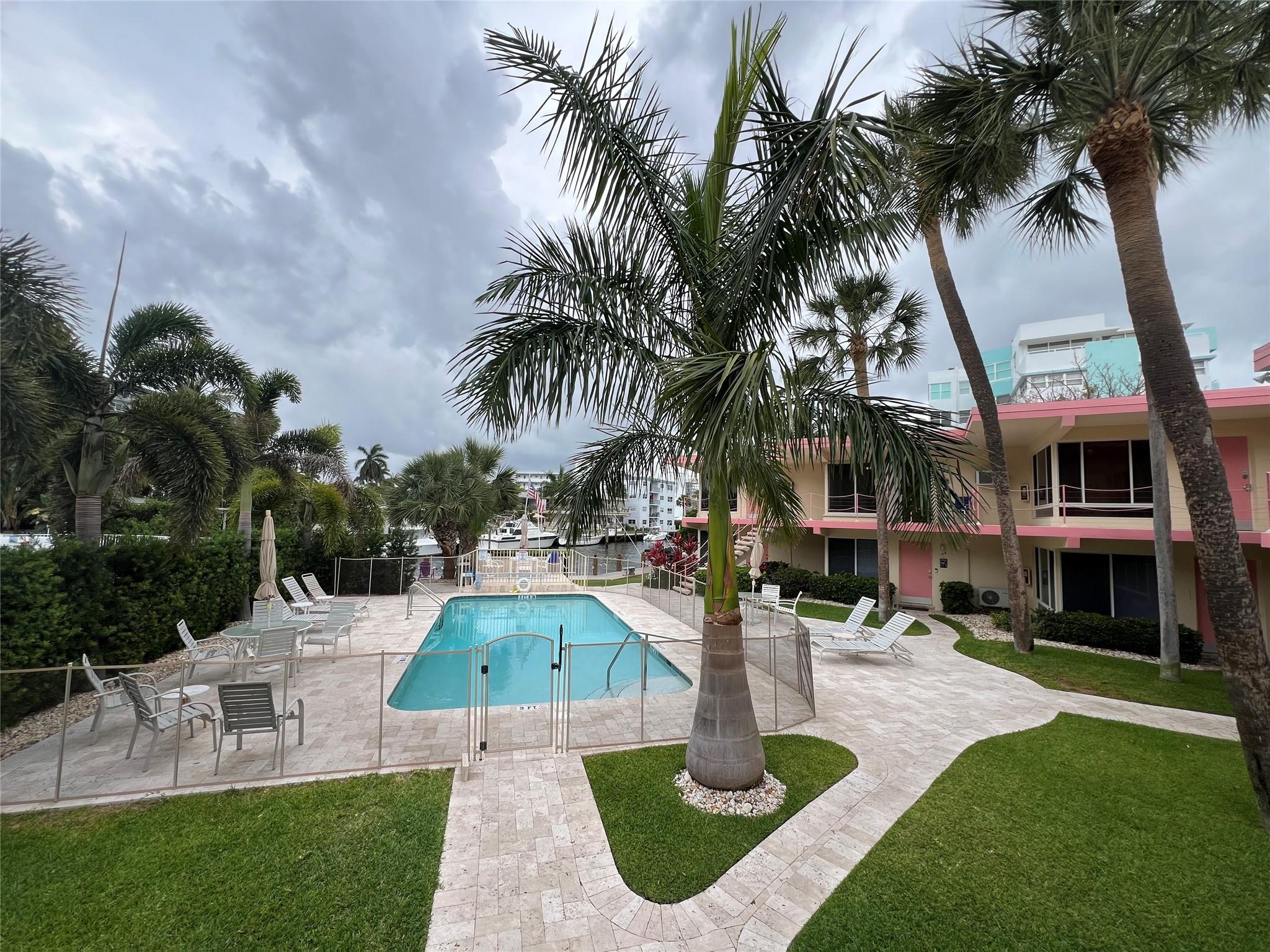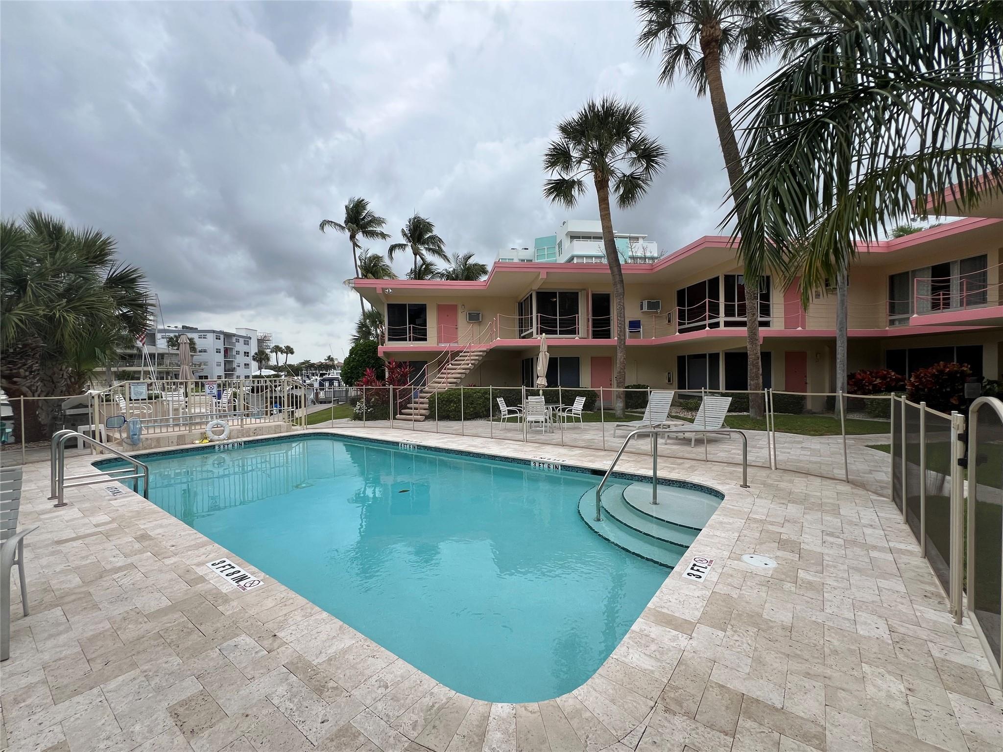 MUST SELL! Waterfront New Price! Relax...the beach is STEPS AWAY! Welcome to Marlin Bay, a mid-century 2nd floor corner unit. This beach area 1 bedroom home is just a couple of streets over from the beach and around the corner from the brand-new PUBLIX! No car needed. This boutique community has newer seawall and big beautiful, heated pool and dock area. Chill out on the dock and enjoy the water view & S. FLorida life here in this cozy 16-community with dock when avail. Unit has full size washer & dryer and assigned parking. Please call for all showings. Total Monthly Assoc. fee $623/monthly includes land lease w/ 31 years remaining. Renting ok >1 year ok, 90 day min 1x/year. Please: NO TRESPASSING, showings by appt. only. Vacant & ready for the next transplant to enjoy. Quick closing ok!