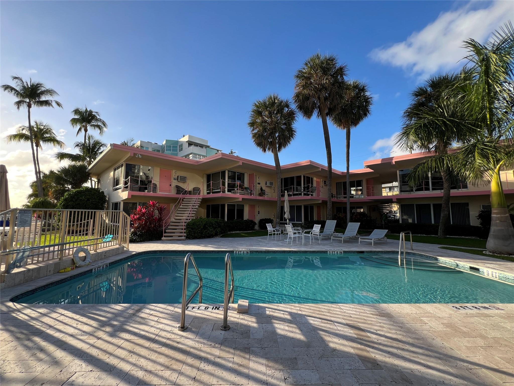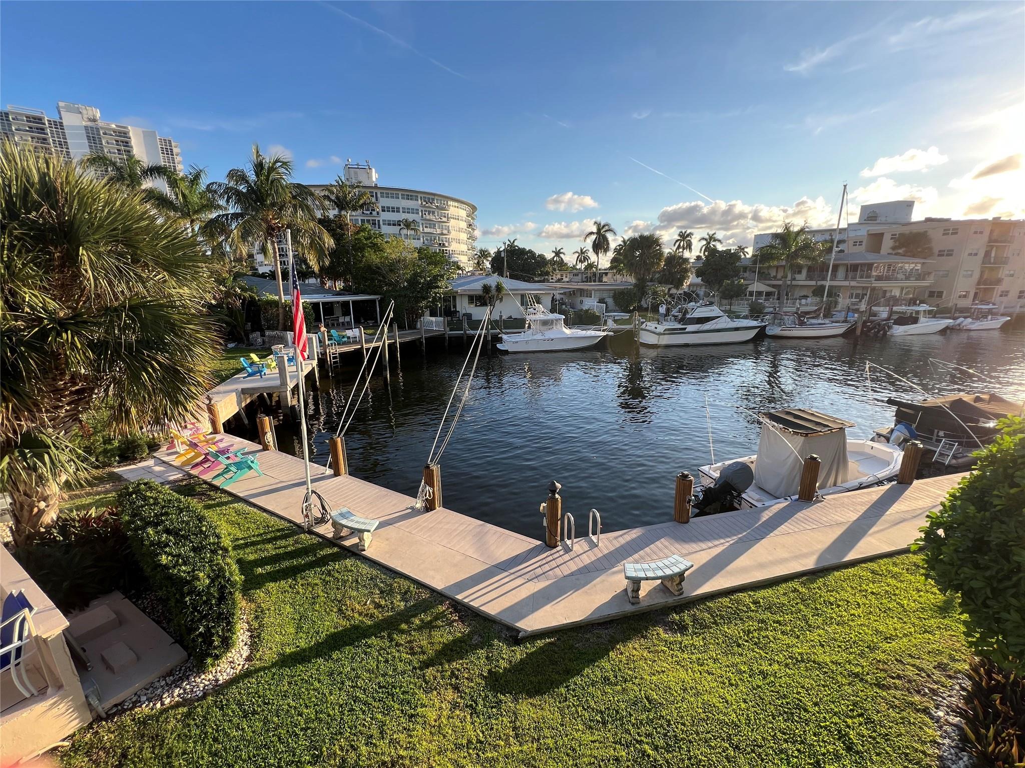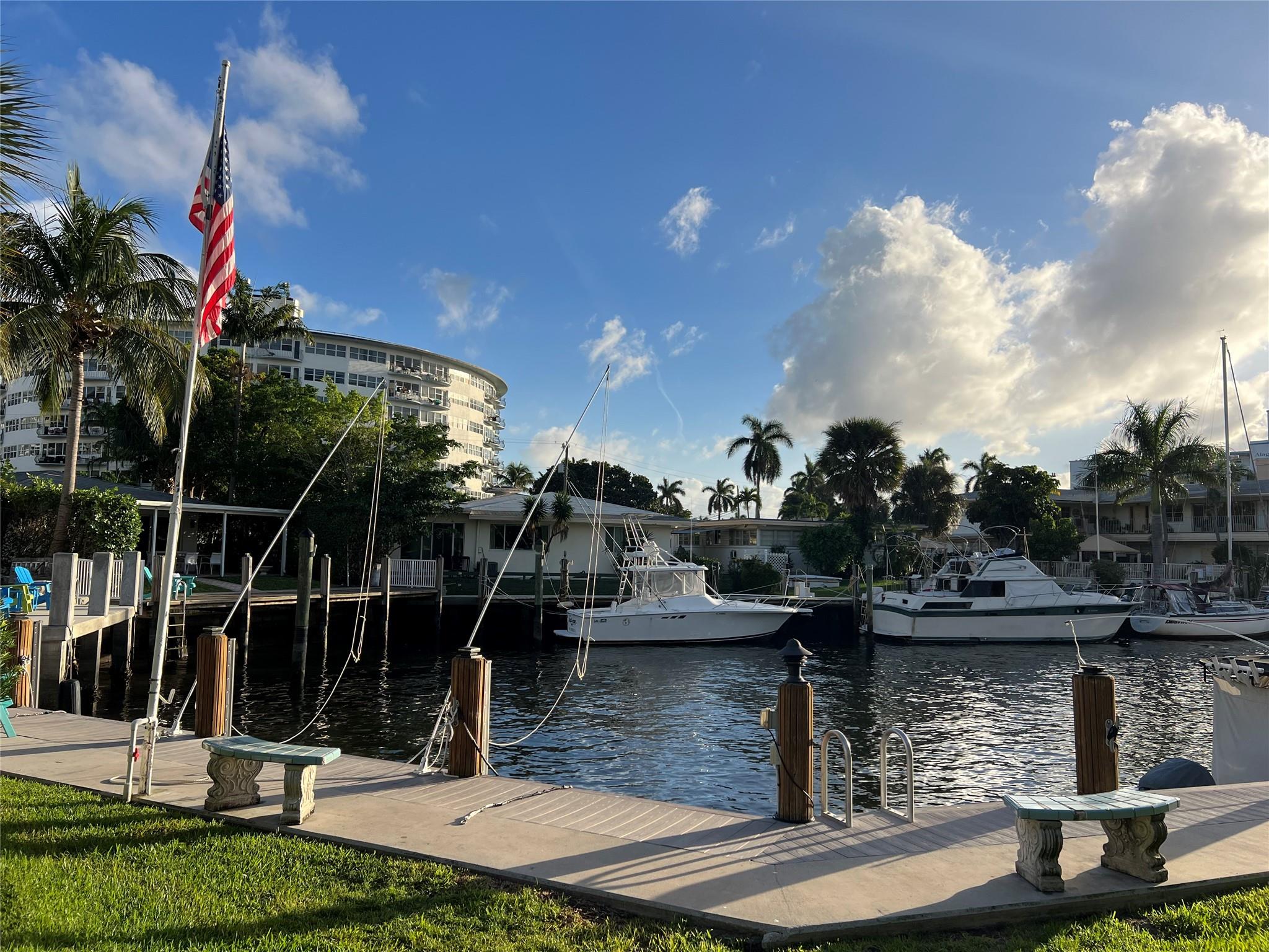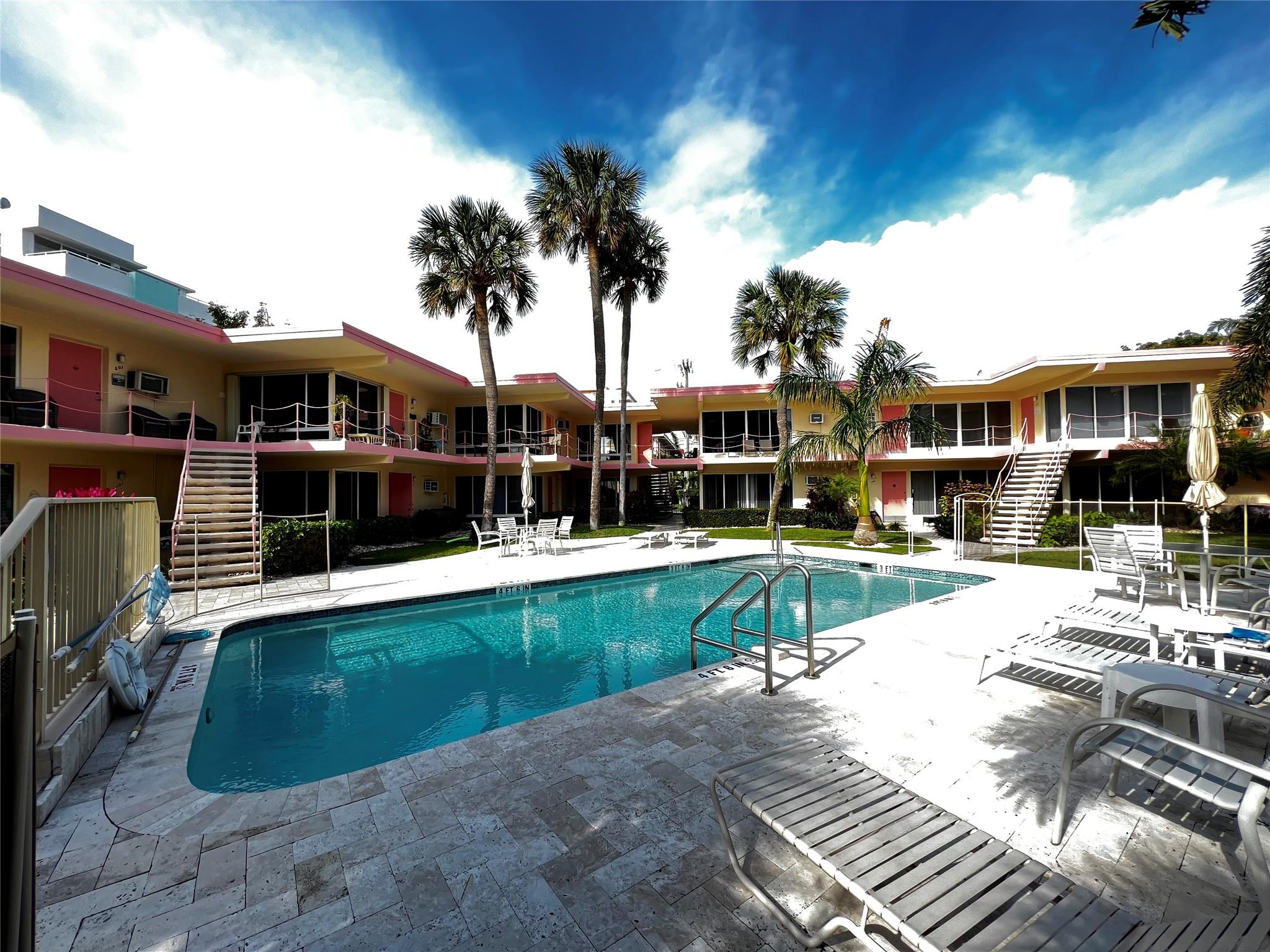 MUST SELL! Waterfront New Price! Relax...the beach is STEPS AWAY! Welcome to Marlin Bay, a mid-century 2nd floor corner unit. This beach area 1 bedroom home is just a couple of streets over from the beach and around the corner from the brand-new PUBLIX! No car needed. This boutique community has newer seawall and big beautiful, heated pool and dock area. Chill out on the dock and enjoy the water view & S. FLorida life here in this cozy 16-community with dock when avail. Unit has full size washer & dryer and assigned parking. Please call for all showings. Total Monthly Assoc. fee $623/monthly includes land lease w/ 31 years remaining. Renting ok >1 year ok, 90 day min 1x/year. Please: NO TRESPASSING, showings by appt. only. Vacant & ready for the next transplant to enjoy. Quick closing ok!