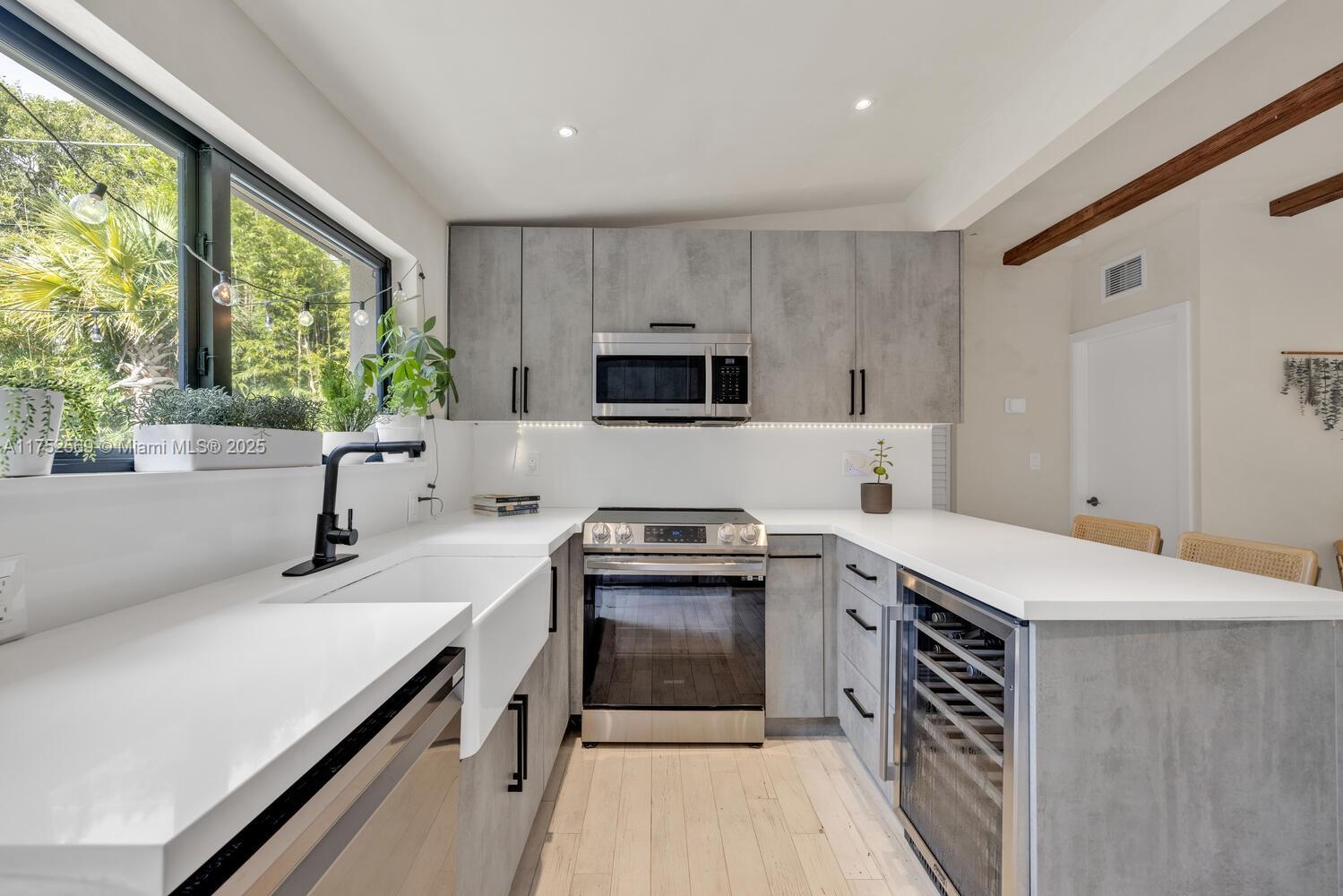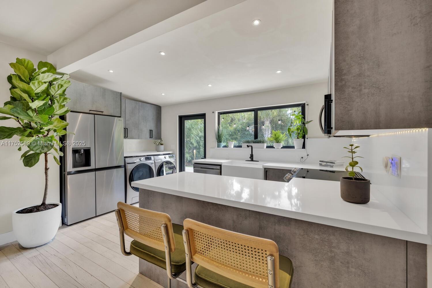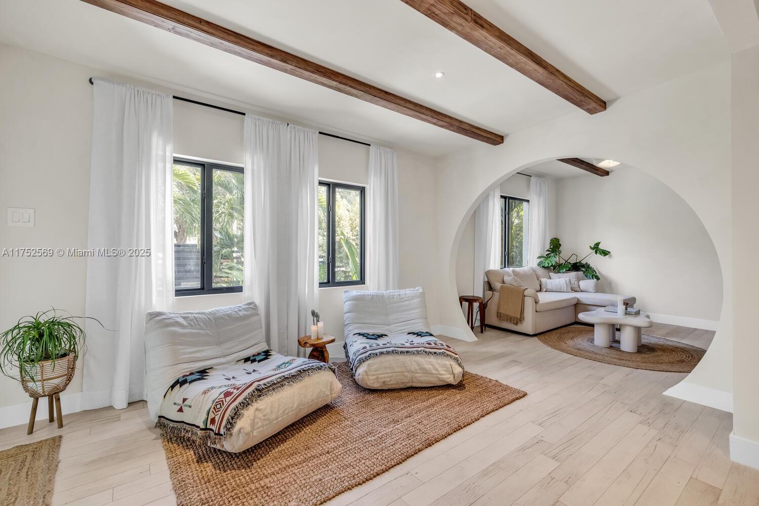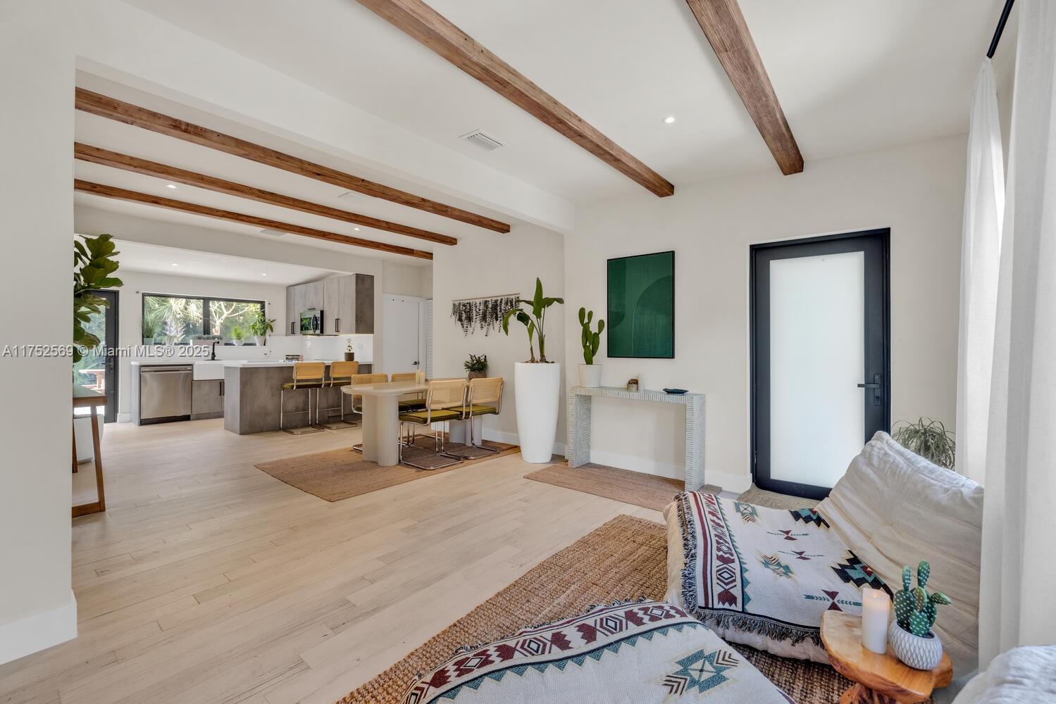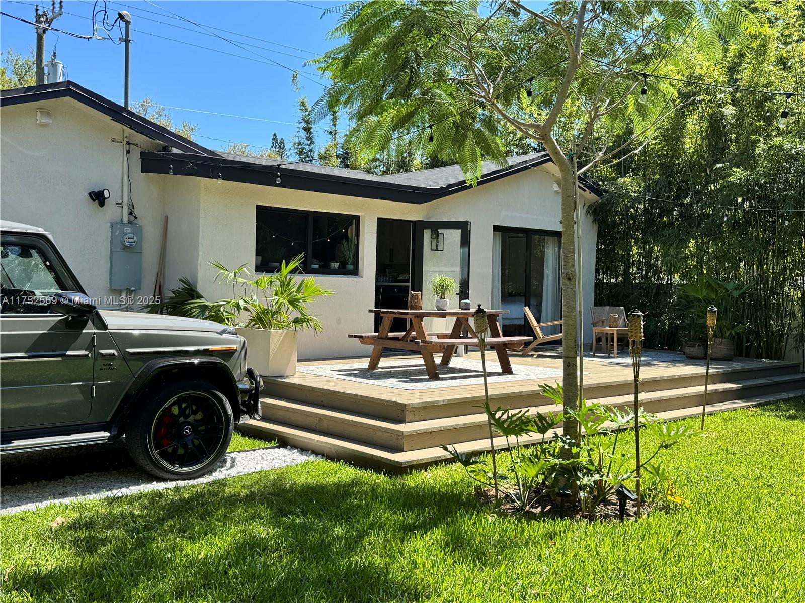 NEWP PRICE, WILL SELL QUICKLY!!! Located near the Miami Design District, Casa Bamboo stands out with its elegant designer interior finishes, including micro concrete wall finishes, wood beam accents and shower glass enclosures. Large impact windows and glass doors flood the interior with natural light. This beautifully remodeled 2 bedrooms, 2 bathrooms, and a versatile den offers the perfect blend of luxury and comfort. Casa Bamboo is truly a slice of paradise, with its professionally designed tropical garden accented with LED lighting. A 10-foot-high bamboo hedge and a charming wood fence provide both privacy and a serene ambiance. The outdoor space boasts an expansive wood deck, perfect for hosting or relaxation. corner lot, the property street parking and a gated driveway.