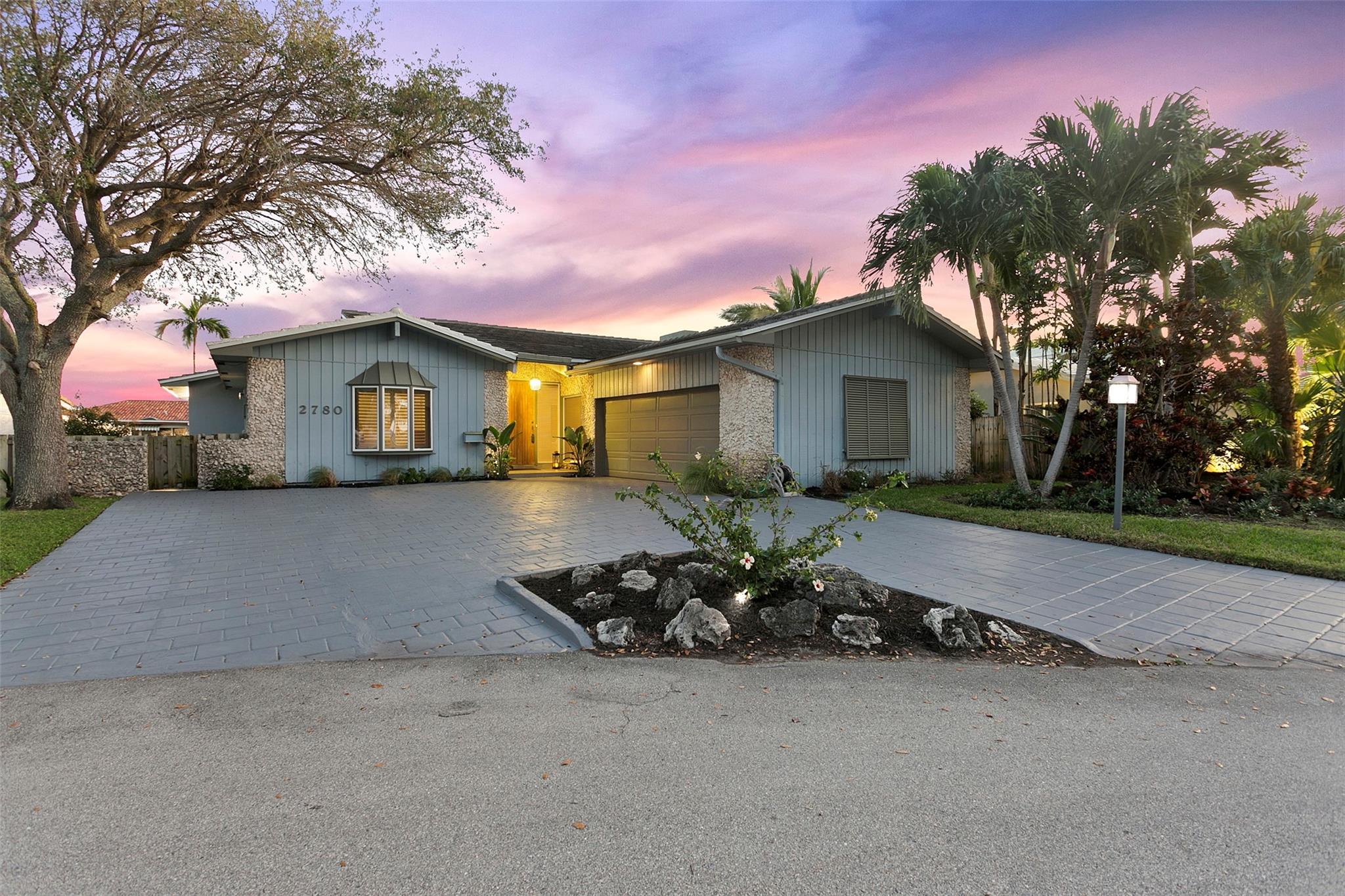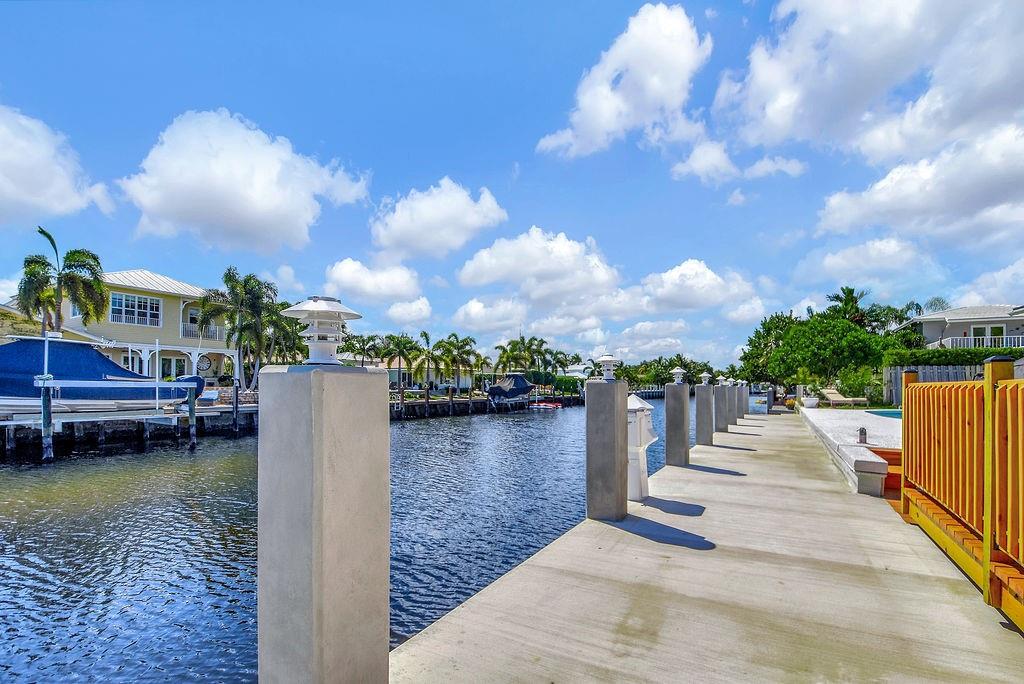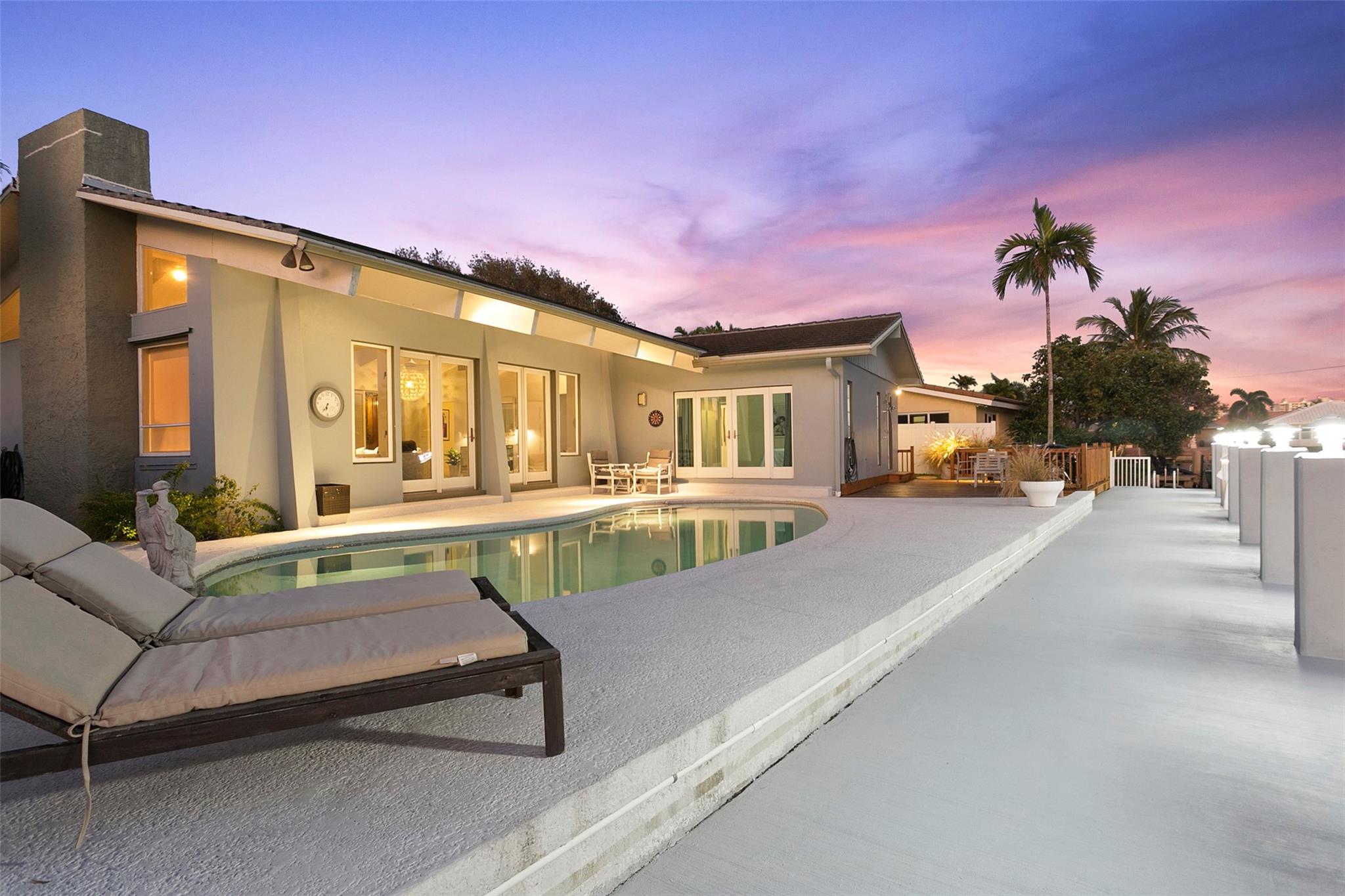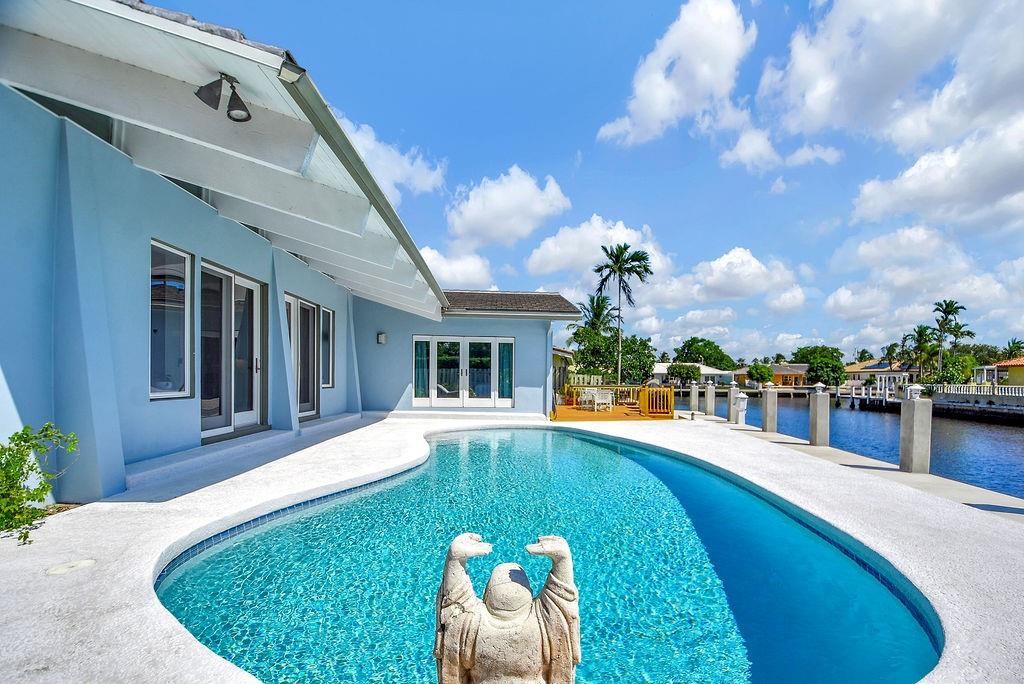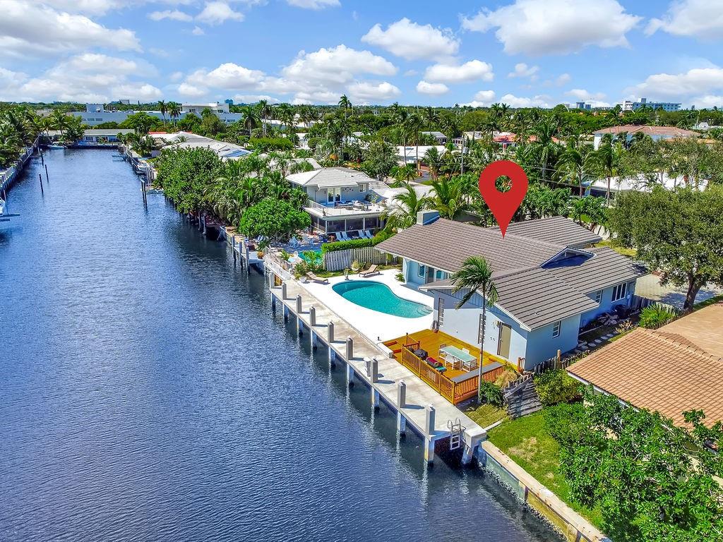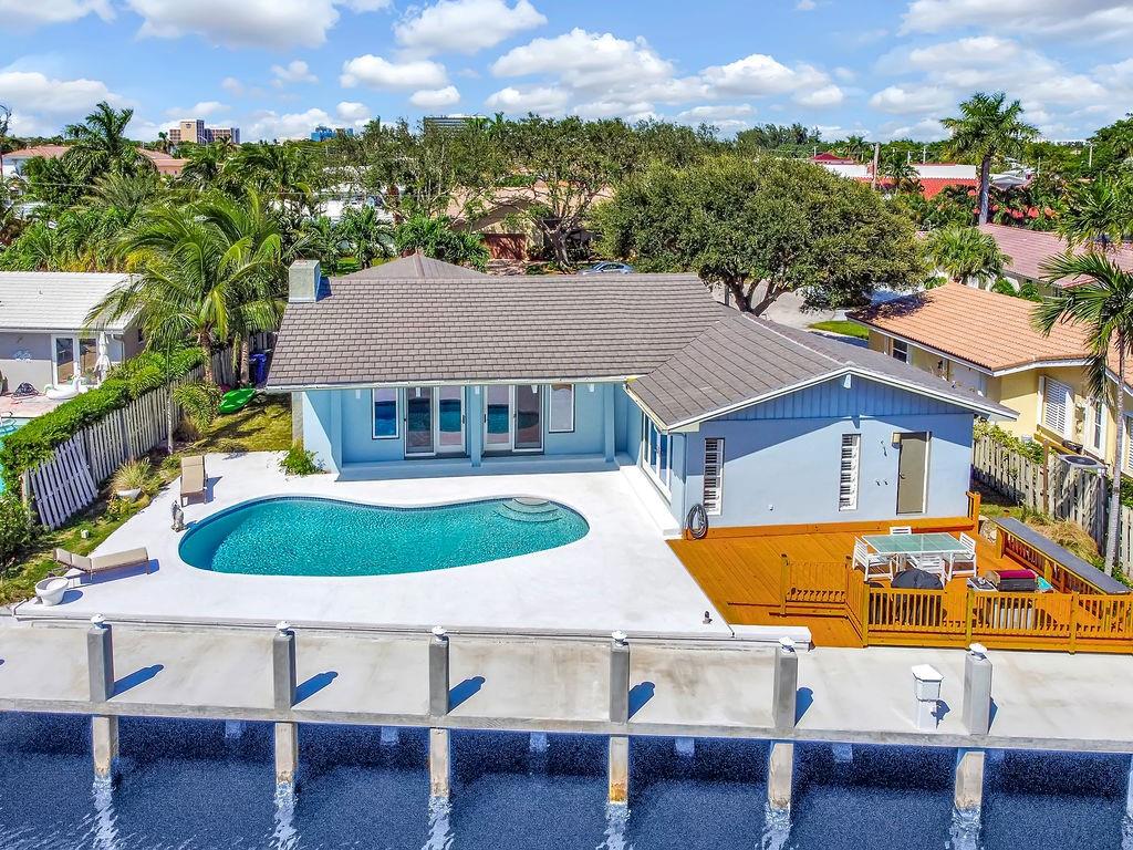 Discover your dream oasis in the heart of the prestigious Lake Estates neighborhood. This captivating waterfront property is a true gem, offering an unparalleled lifestyle for the discerning buyer. Bask in the Florida sunshine all day long as the inviting pool has southern exposure, enjoy a BBQ on the wood dock whilst the coconut trees and landscaping create a private paradise. Step inside and be instantly enchanted by the spacious open floor plan, where vaulted ceilings and an abundance of natural light create an atmosphere of grandeur and serenity. The large open plan living area making this an entertainer's dream come true. Situated on a wide canal, with a high bridge allowing 11.5 feet of clearance and secured by a recently completed impressive 90-foot concrete dock.
