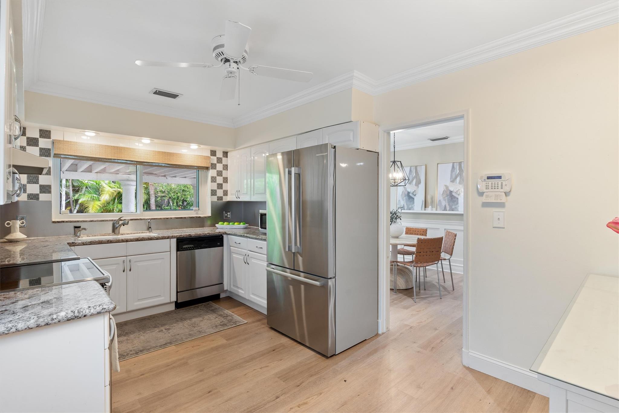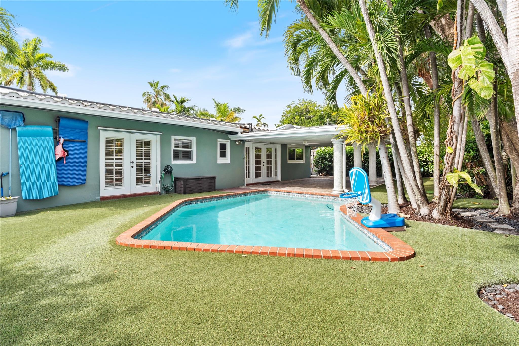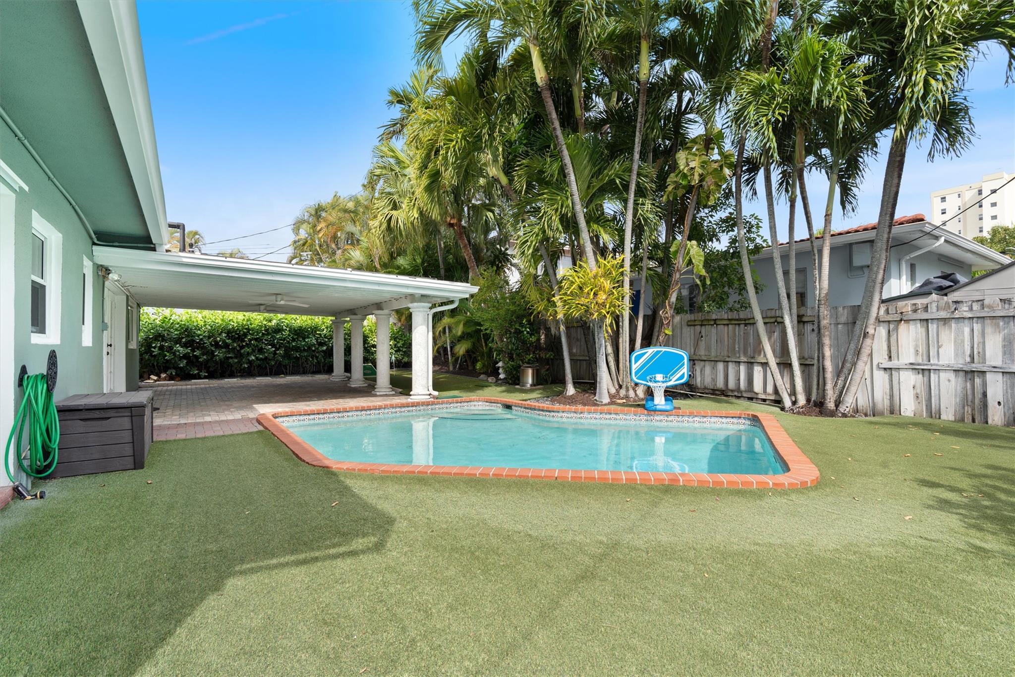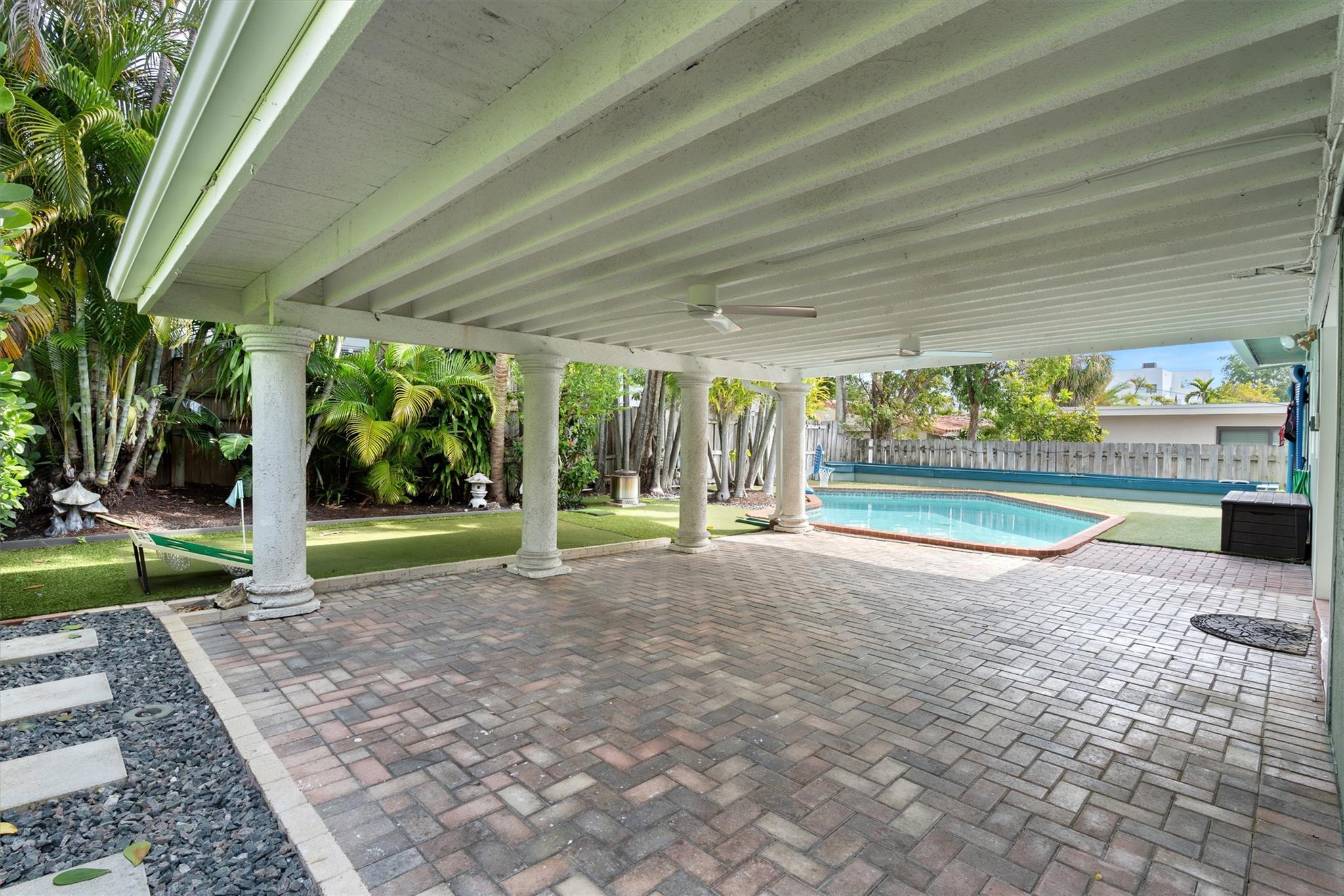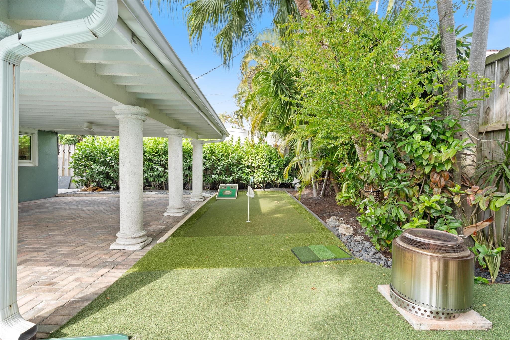 Charming Victoria Park Home on a high elevation lot & 1 car garage. Amazing backyard with covered patio and solar heated pool, putting green and premium K9 Elite turf, and SWAT mosquito system. The inside has a thoughtful layout with large kitchen, living room, dining room and large storage / pantry, with large closets that are rare for this neighborhood. You can't beat this location with great walkability to the Las Olas night life, or just over 1 Mile to the ocean, less than a mile to Galleria mall shopping and restaurants or a short walk to Holiday Park for ice skating, tennis, pickleball, volleyball and more. Hurricane-rated garage door, high-impact windows (ask for our 4 point and wind mit inspections). Zoned for “A” Rated Harbordale Elementary. No HOA. No rental restrictions.