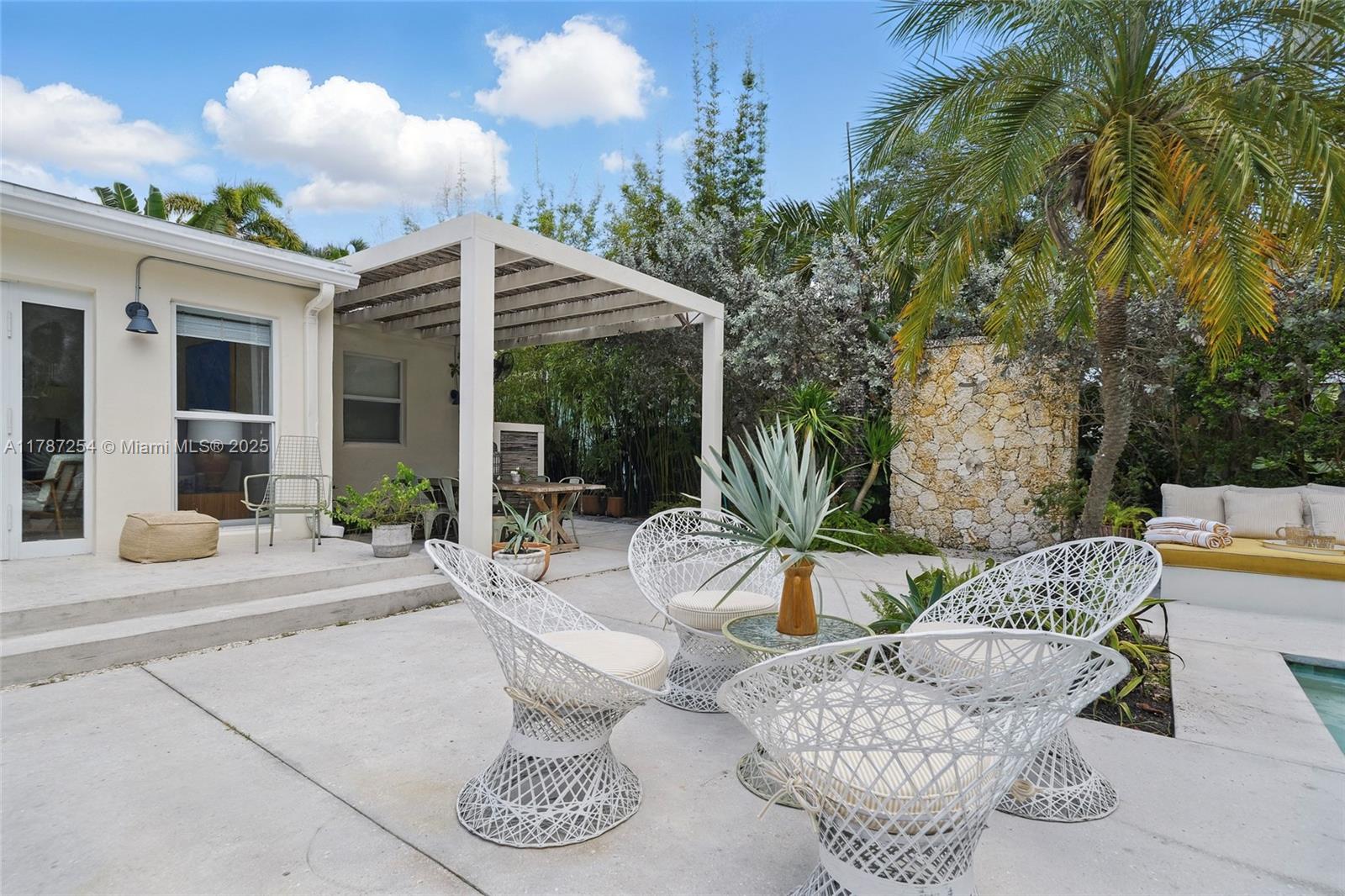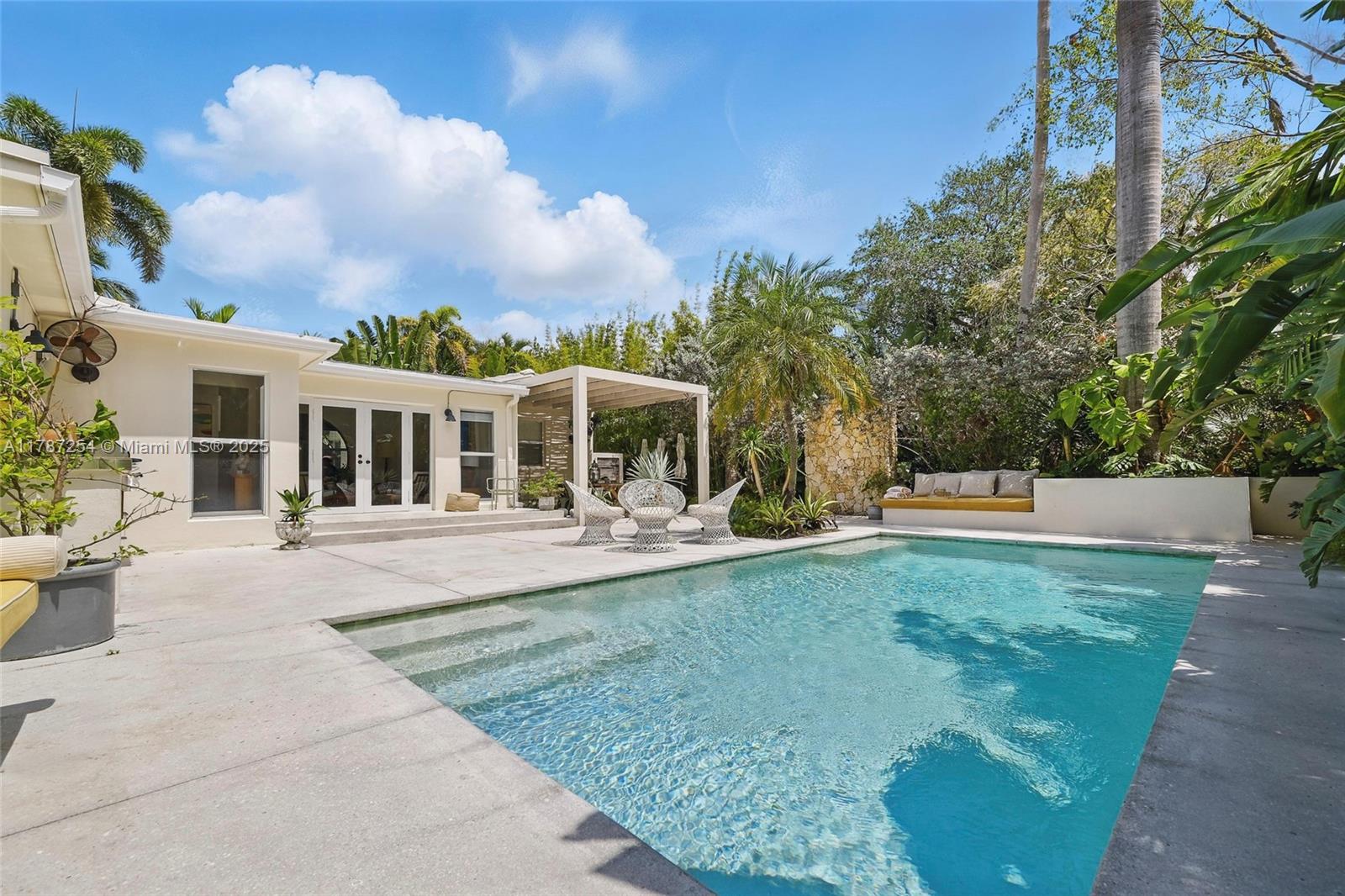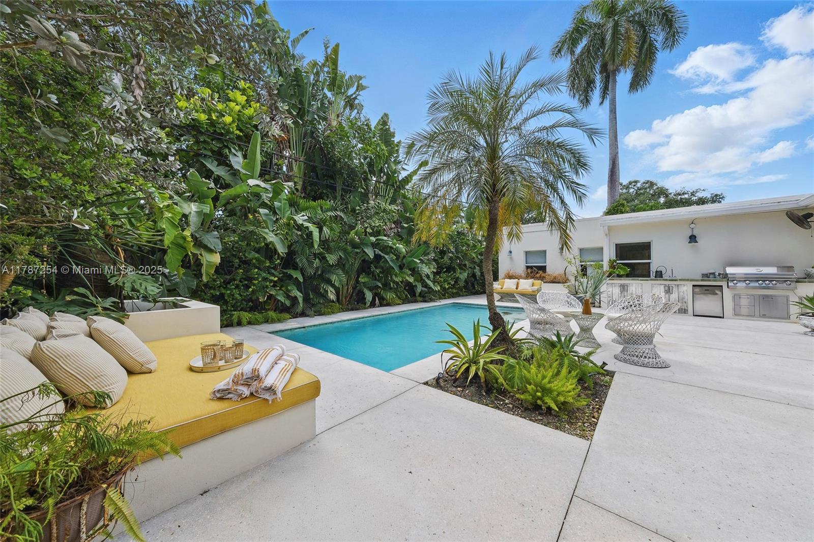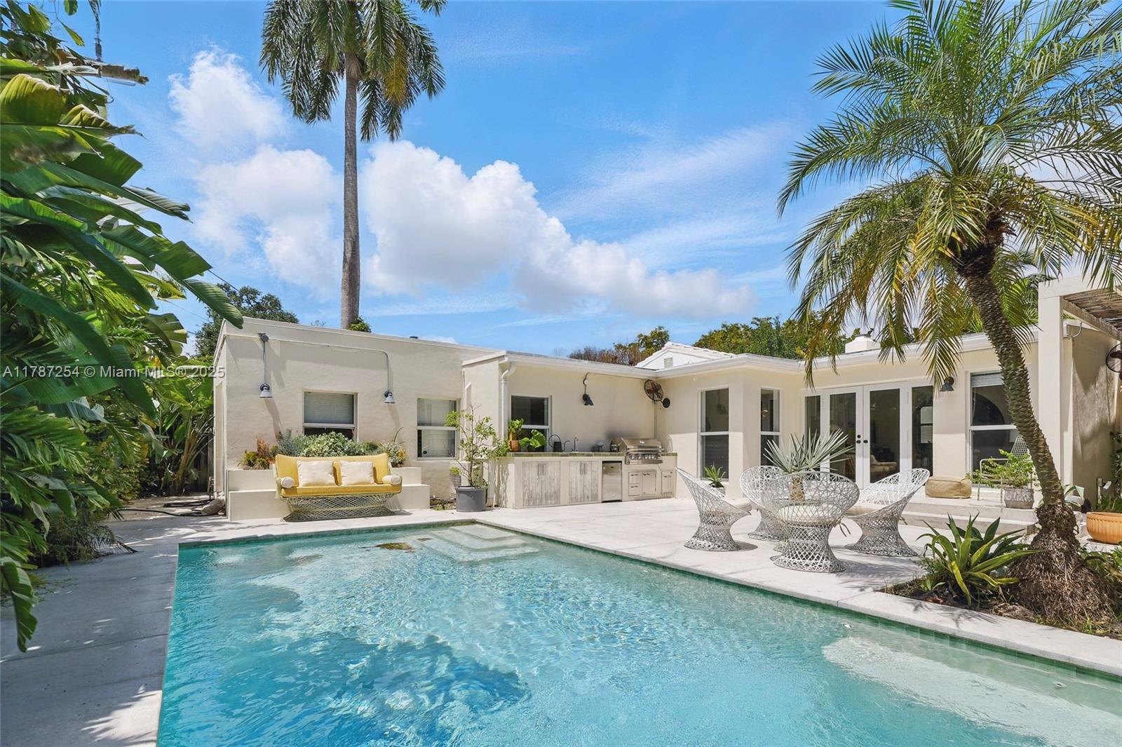 Effortless elegance in Belle Meade.This 4-bedroom pool home--plus garage--on a large lot has been meticulously renovated by Anastasia Koutsioukis, the co-founder and creative visionary behind Miami's beloved Mandolin Bistro. Interiors showcase impact windows, original wood floors and striking architectural details. Living area features a carved stone fireplace and vaulted ceiling. A keyhole-shaped archway frames a stunning view from the front door to the pool. Primary suite boasts corner windows, generous closets and ensuite bath with rainfall shower. Lush outdoor space with dining pergola and summer kitchen blends Miami tropical modern and Mediterranean chic. Belle Meade is a gated bayfront community known for quiet tree-lined streets. Create lasting memories in this extraordinary home!