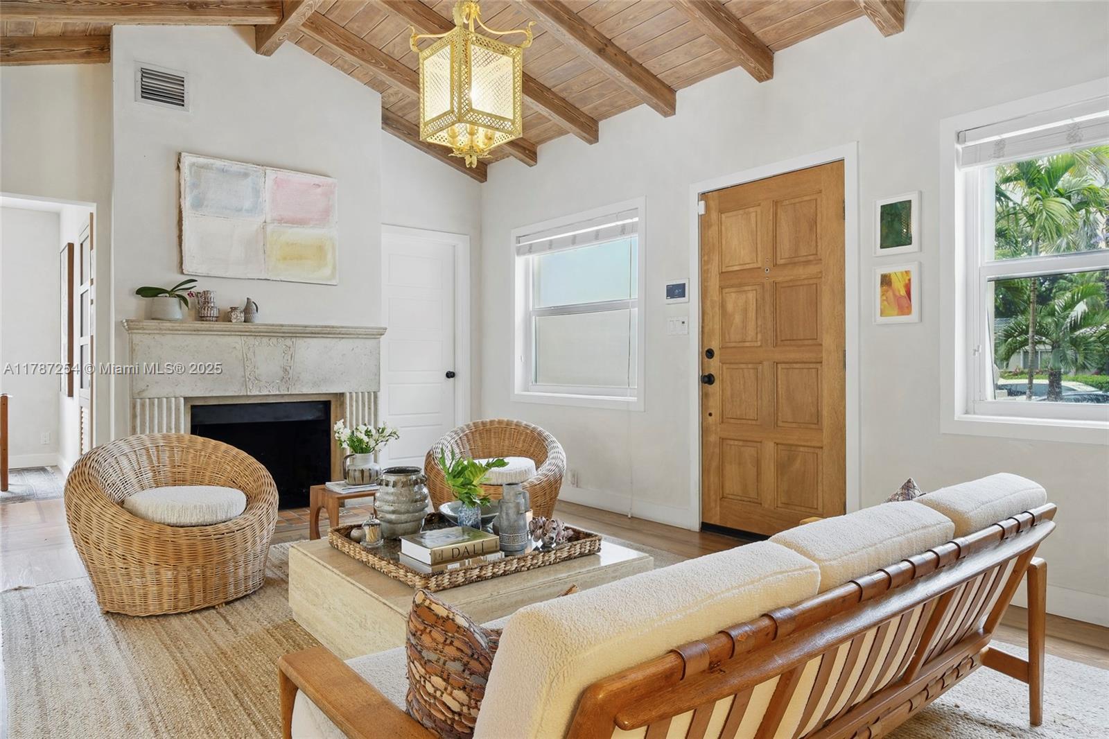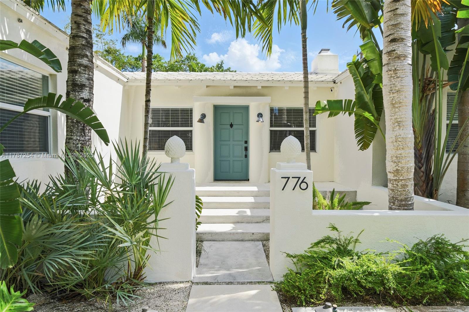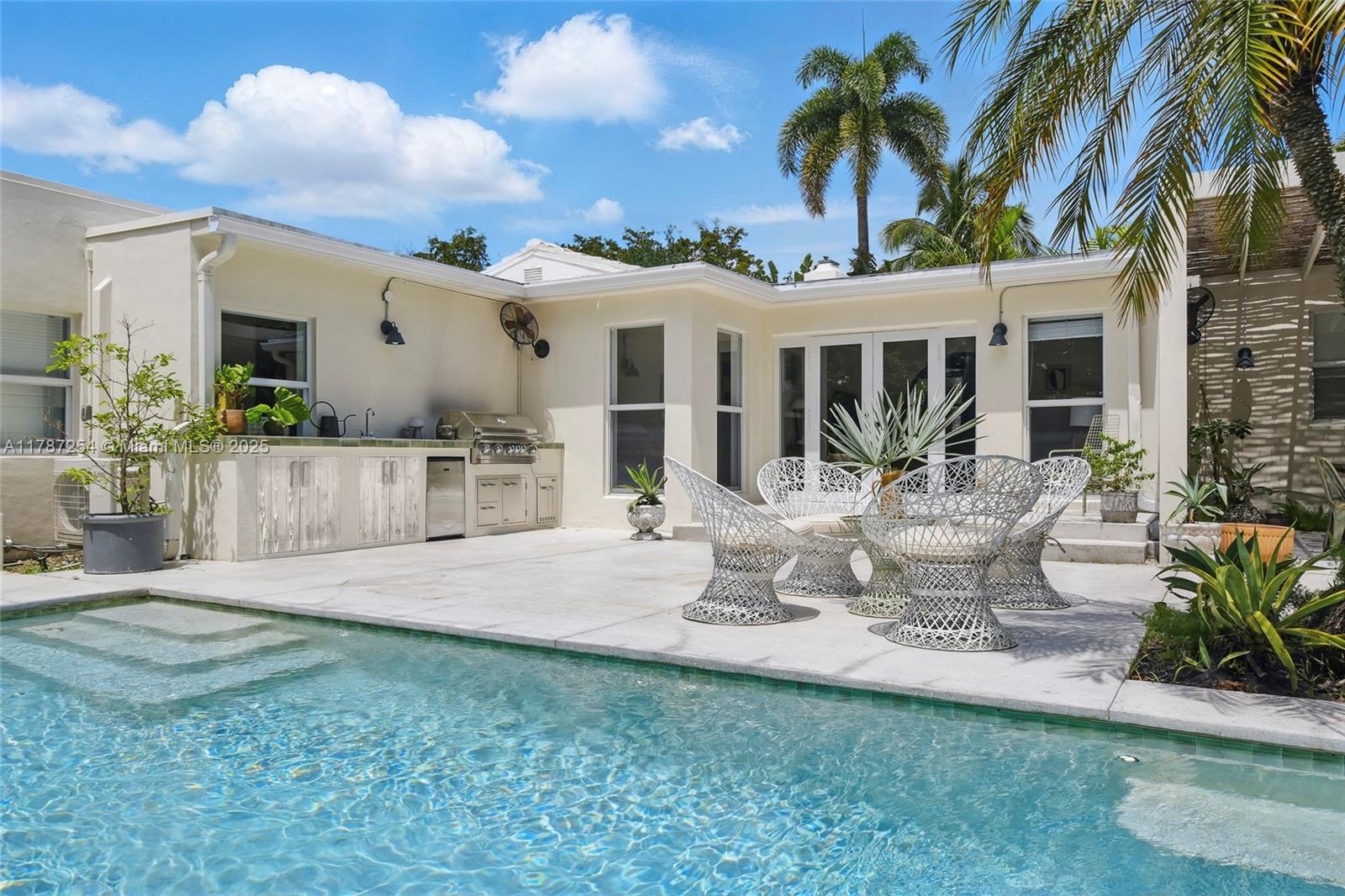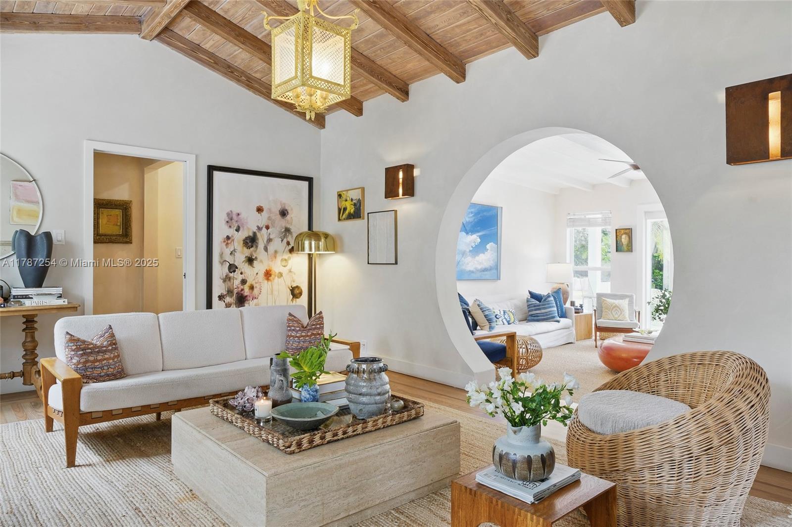 Effortless elegance in Belle Meade.This 4-bedroom pool home--plus garage--on a large lot has been meticulously renovated by Anastasia Koutsioukis, the co-founder and creative visionary behind Miami's beloved Mandolin Bistro. Interiors showcase impact windows, original wood floors and striking architectural details. Living area features a carved stone fireplace and vaulted ceiling. A keyhole-shaped archway frames a stunning view from the front door to the pool. Primary suite boasts corner windows, generous closets and ensuite bath with rainfall shower. Lush outdoor space with dining pergola and summer kitchen blends Miami tropical modern and Mediterranean chic. Belle Meade is a gated bayfront community known for quiet tree-lined streets. Create lasting memories in this extraordinary home!