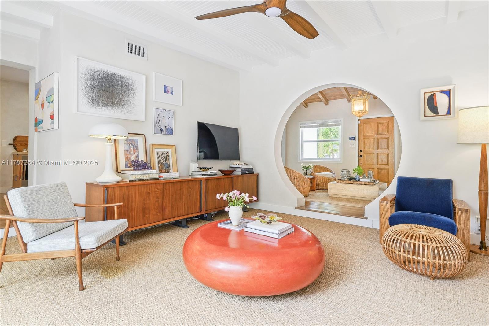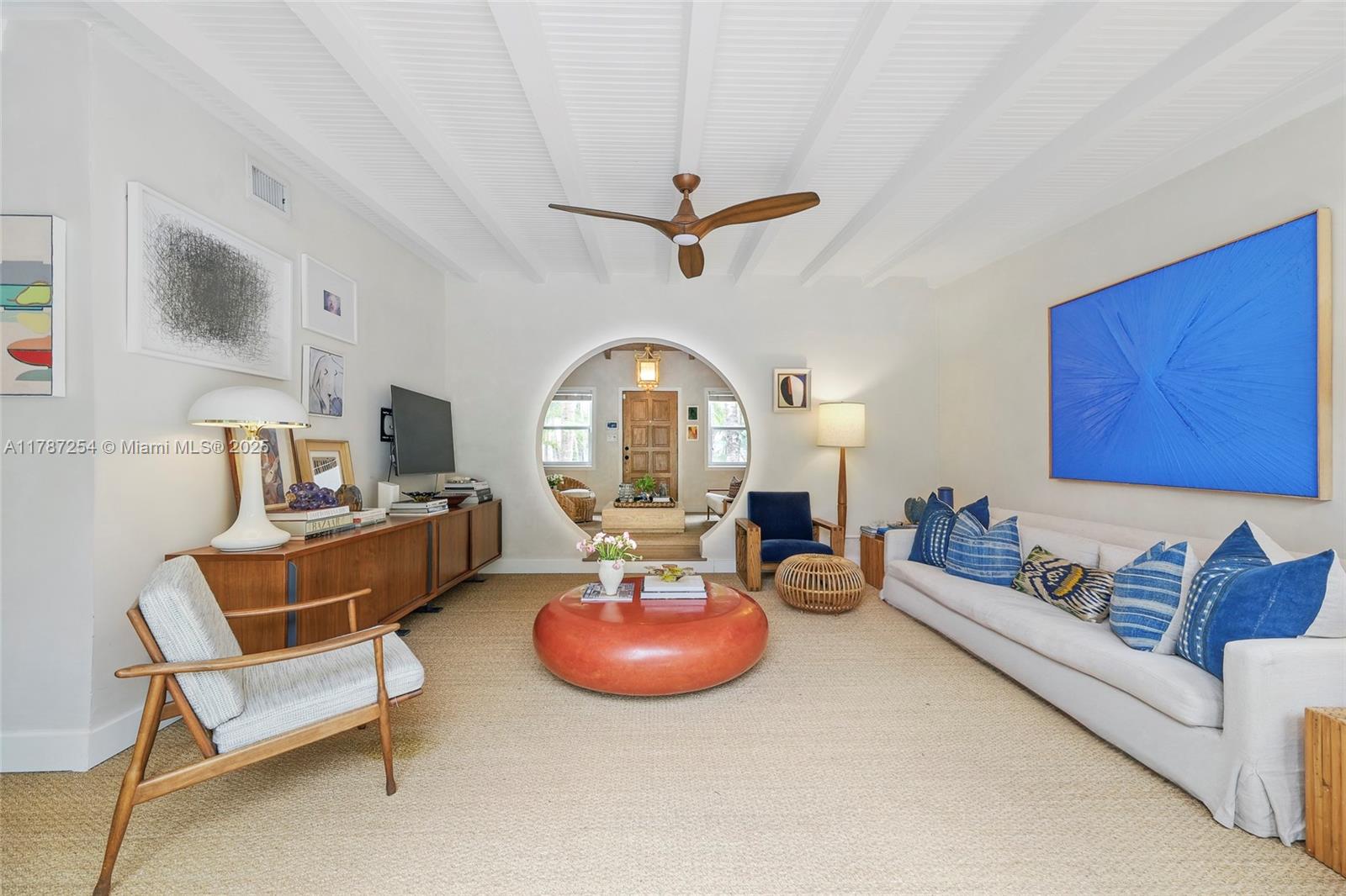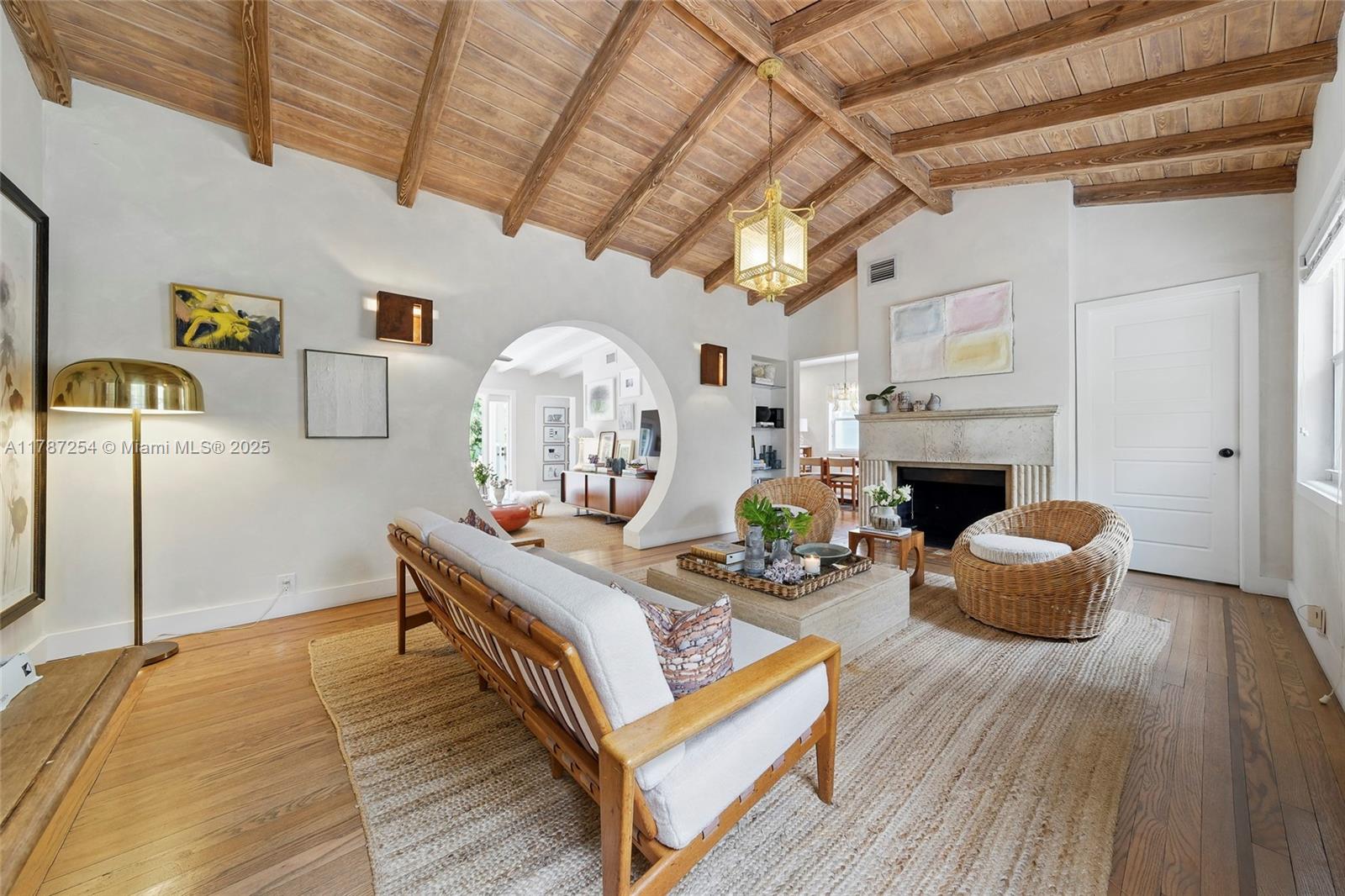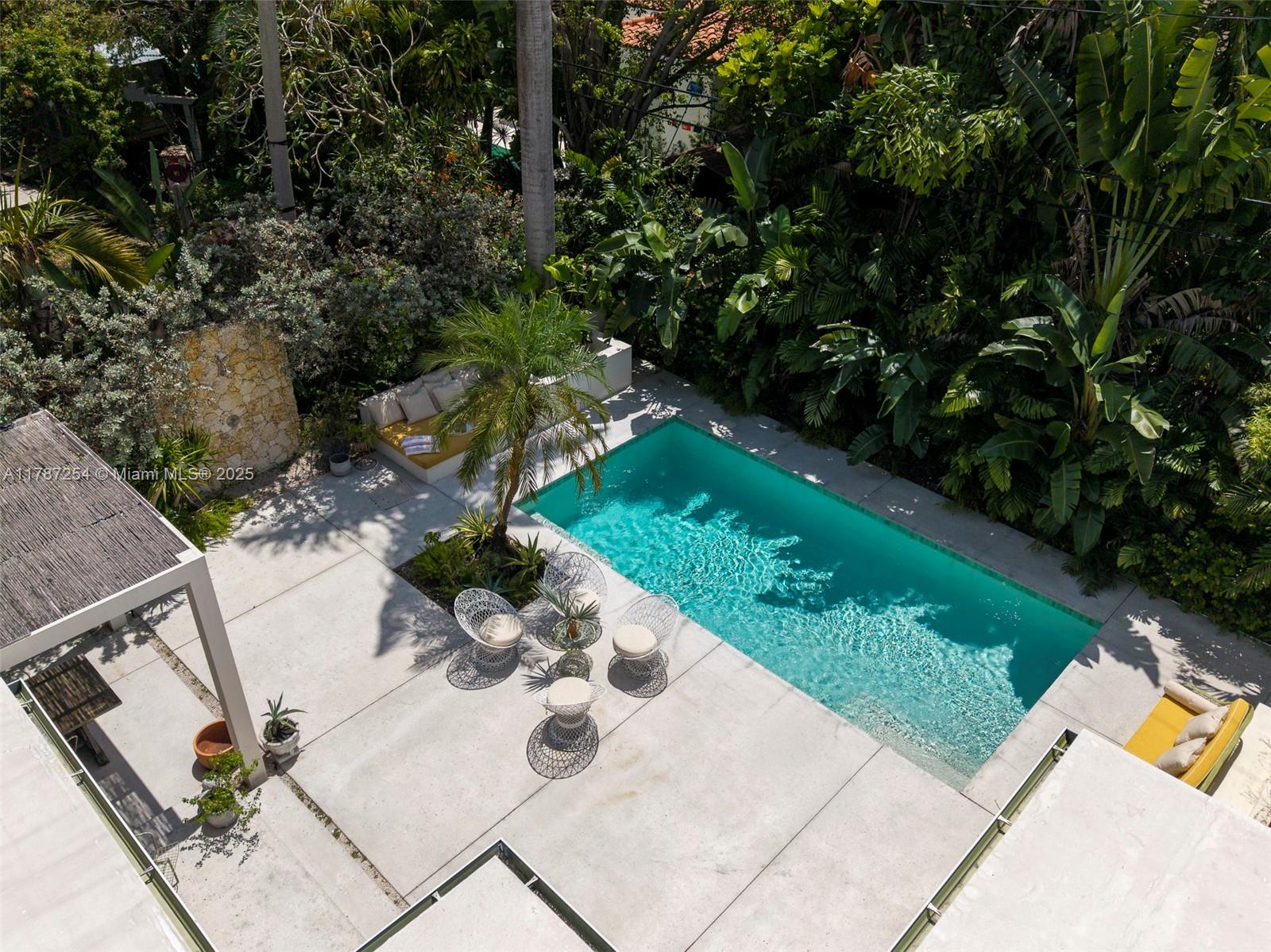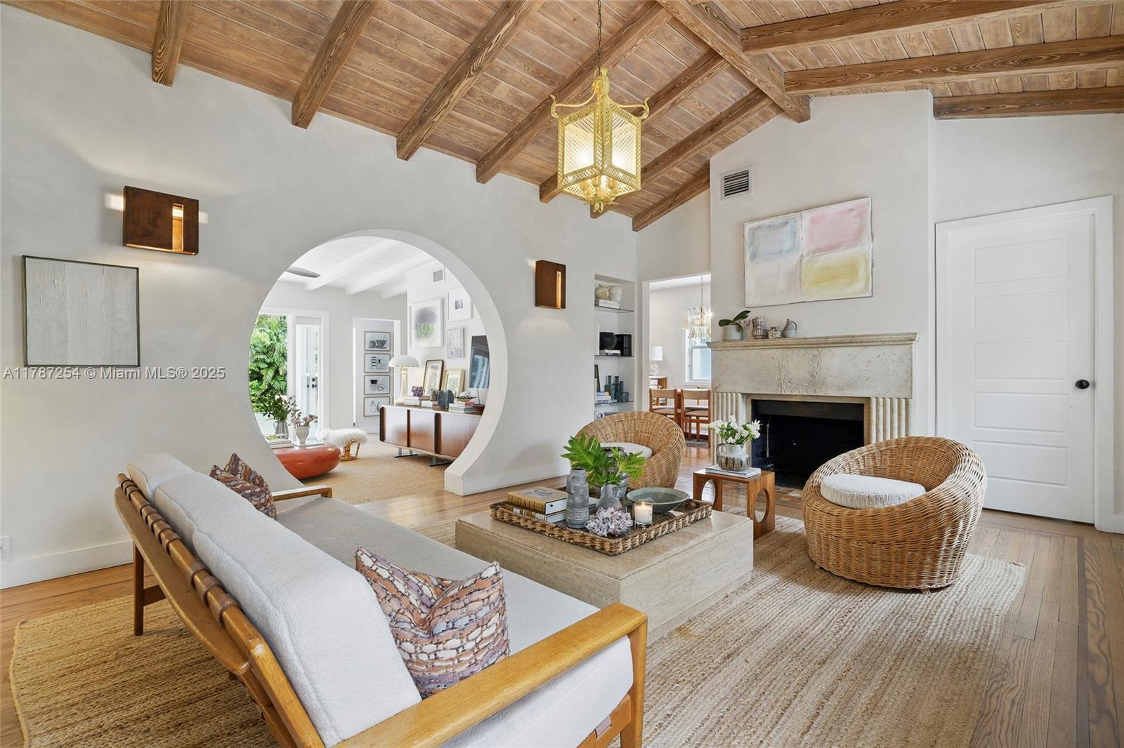 Effortless elegance in Belle Meade.This 4-bedroom pool home--plus garage--on a large lot has been meticulously renovated by Anastasia Koutsioukis, the co-founder and creative visionary behind Miami's beloved Mandolin Bistro. Interiors showcase impact windows, original wood floors and striking architectural details. Living area features a carved stone fireplace and vaulted ceiling. A keyhole-shaped archway frames a stunning view from the front door to the pool. Primary suite boasts corner windows, generous closets and ensuite bath with rainfall shower. Lush outdoor space with dining pergola and summer kitchen blends Miami tropical modern and Mediterranean chic. Belle Meade is a gated bayfront community known for quiet tree-lined streets. Create lasting memories in this extraordinary home!