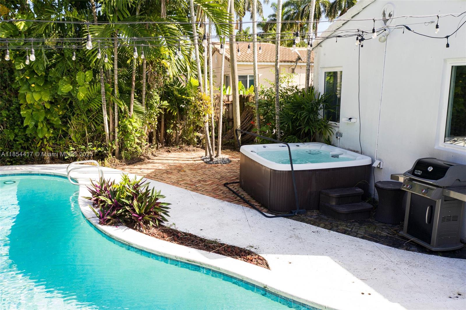 Short distance to the beach! 2015 fully renovated beautiful house with large heated salt water pool, spa,15.54 kw solar system (new, not on photos). Tropical backyard with roofed patio. Premium vinyl floors, tiles in bathrooms, Kitchen features quartz countertops, stainless steel appliances. LED lighting throughout the house and tankless water heater. New PVC sewer piping (2022), new flat roof (2023), all windows are impact windows and/or have hurricane shutters.