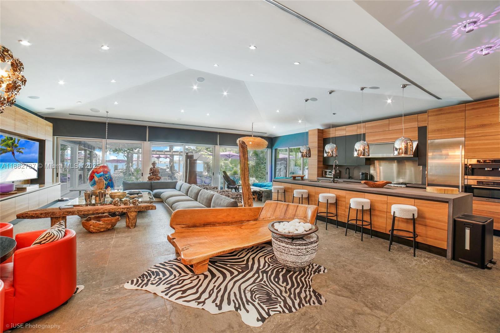 One-of-a-kind waterfront masterpiece! This unique home sits on a cul-de-sac on Normandy Shores exclusive gated community, w/ Normandy Shores Golf Club, Tennis, Basketball Courts, and Parks. Nestled on the Island's Terrace, shares w/only 6 residences breathtaking open bay views and sunsets. Built in 2015, this 3,442 SQ FT eccentric home features 4 bed/4 bath, open living and dining, state-of-the-art kitchen, and more. The home's Zen vibe begins as you step through a bamboo garden, 30 ft interior waterfall, and end at the open bay sanctuary. The backyard landscaping, shimmering pool, outdoor kitchen, and terraces make this home magic. Bath in the outdoor tub, watch movies at the two-story Tiki Hut, and enjoy the dock at sunset. Boat and Jet Ski lifts and davit. Plans for a two-car garage.