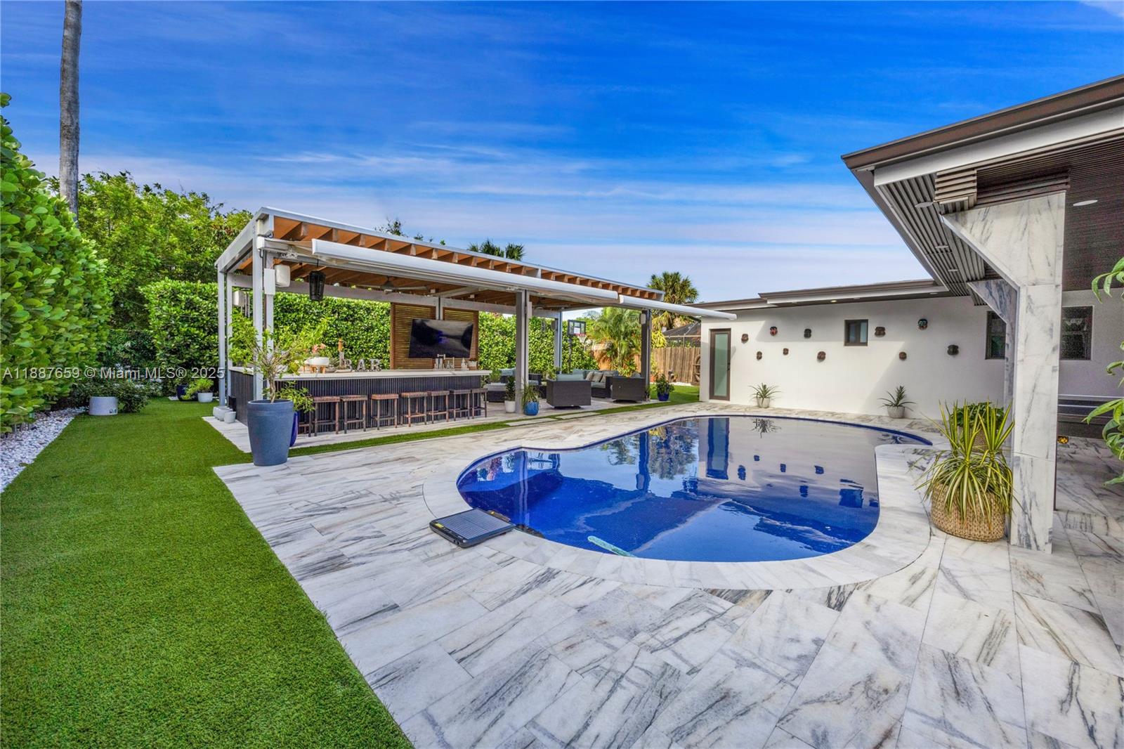 Upgraded 3-bed, 3.5-bath home in Hollywood Hills with a split open floor plan, ideal for daily living and entertaining. Features a bright living room, formal dining, and updated kitchen with new appliances. The private backyard boasts artificial turf, a 45-ft pergola, ambient lighting, full outdoor kitchen with dual grills, fridge, ice maker, sink, and beer keg. Enjoy a saltwater heated pool with jets, mosquito misting system, and surround sound. New roof and 3.5-ton AC (2020), expanded driveway. Quiet neighborhood near good schools, Memorial Regional Hospital, Downtown Hollywood, airport, and beaches.