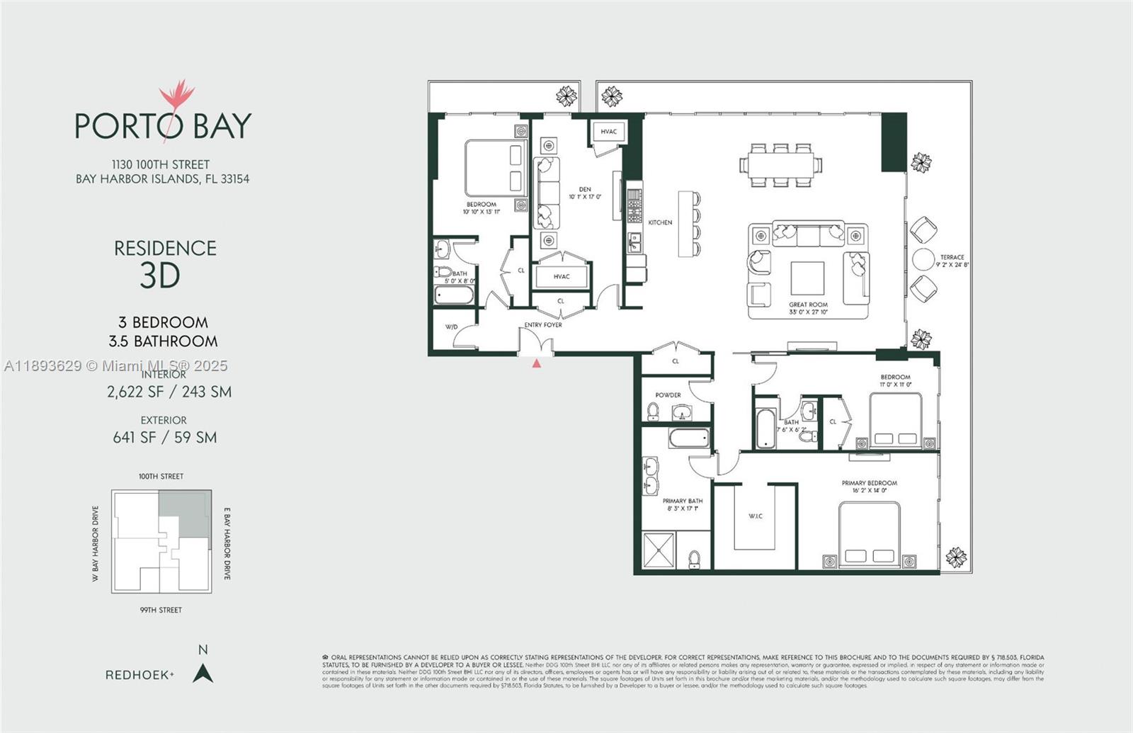 Residence 3D at Porto Bay offers 3 bedrooms plus a den and 3.5 baths with 2,622 SF of interiors and a 641 SF wraparound terrace. This bright corner home features a spacious great room with open dining and living areas, European oak floors, and a gourmet island kitchen with Bosch appliances and travertine countertops. The primary suite includes a walk-in closet and a spa-inspired bath with dual vanities and Porcelanosa finishes, while one secondary bedroom enjoys access to a private terrace. A den, powder room, washer/dryer, and two parking spaces complete the home. Experience serene island living in a boutique 18-residence building featuring a gym, sauna, cold plunge, elegant lobby, and an outdoor rooftop pool with panoramic views. Secure your place while early pricing is still available.