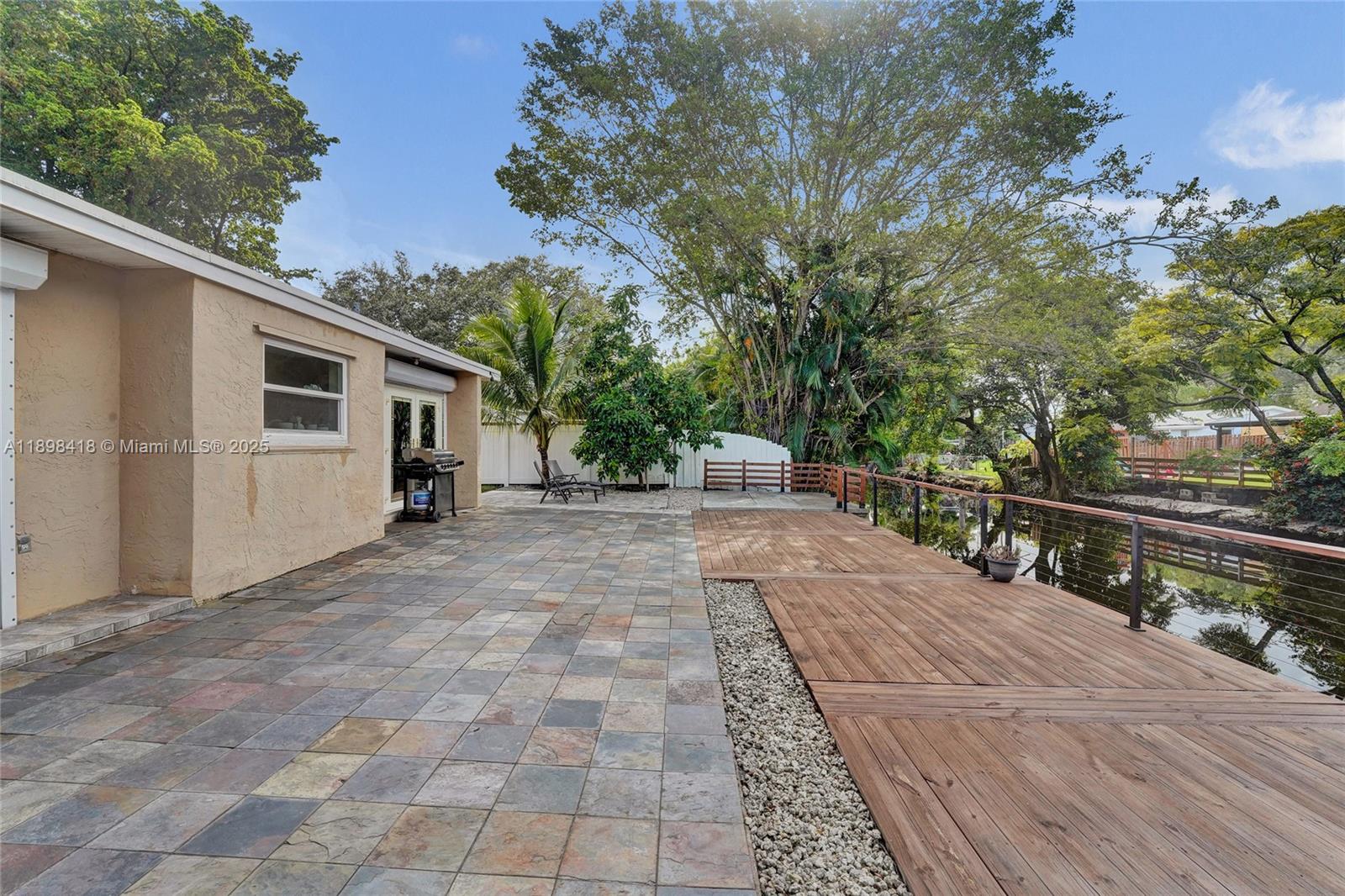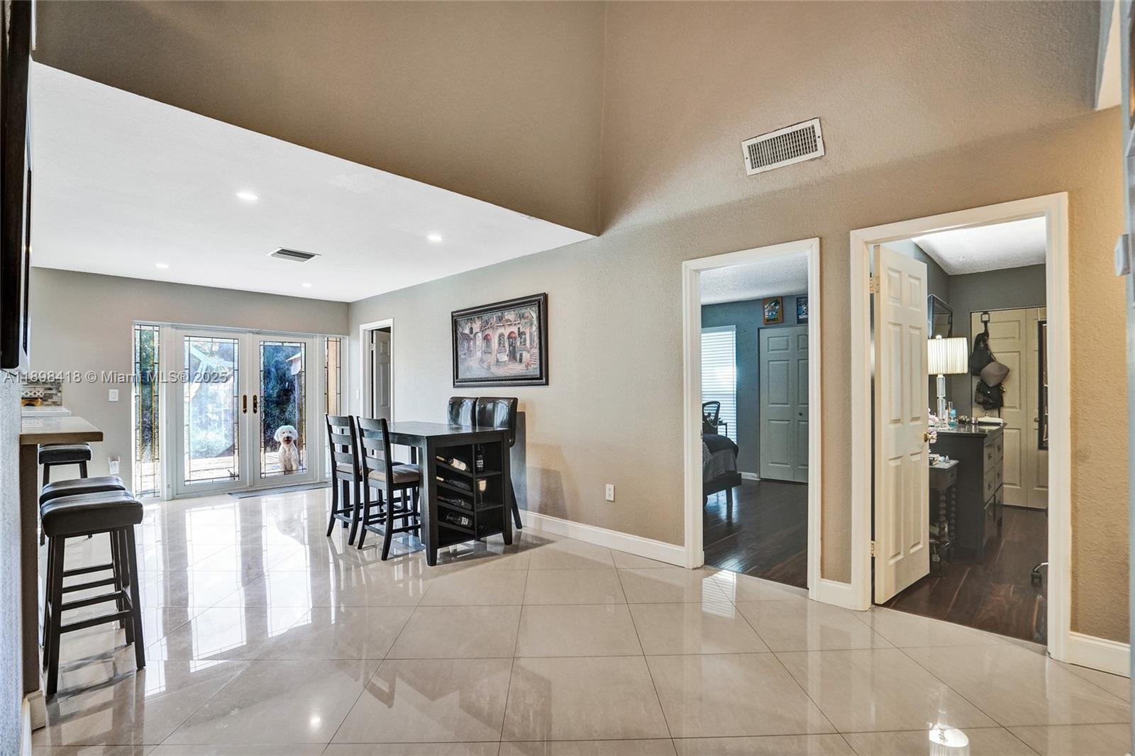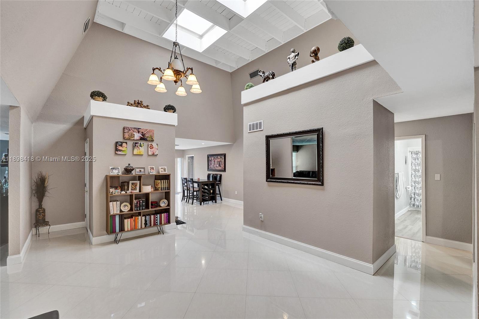 Welcome! Beautifully updated 4-bedroom, 2.5-bathroom home in a desirable neighborhood with no HOA. You'll love the large front porch, perfect for sipping your morning coffee, greeting neighbors or unwinding. Inside, enjoy soaring high ceilings and an open floor plan with large white tile flooring throughout, creating a bright and modern feel. The updated kitchen features plenty of cabinetry and space for entertaining. Hurricane-impact windows and front door for peace of mind. Garage has been converted into living space, offering flexibility for a playroom, office, gym or can easily be converted back into a garage. Step outside to your backyard oasis, where you can enjoy outdoor living along a scenic canal--perfect for fishing, boating, or breathtaking sunsets. New tankless water heater!